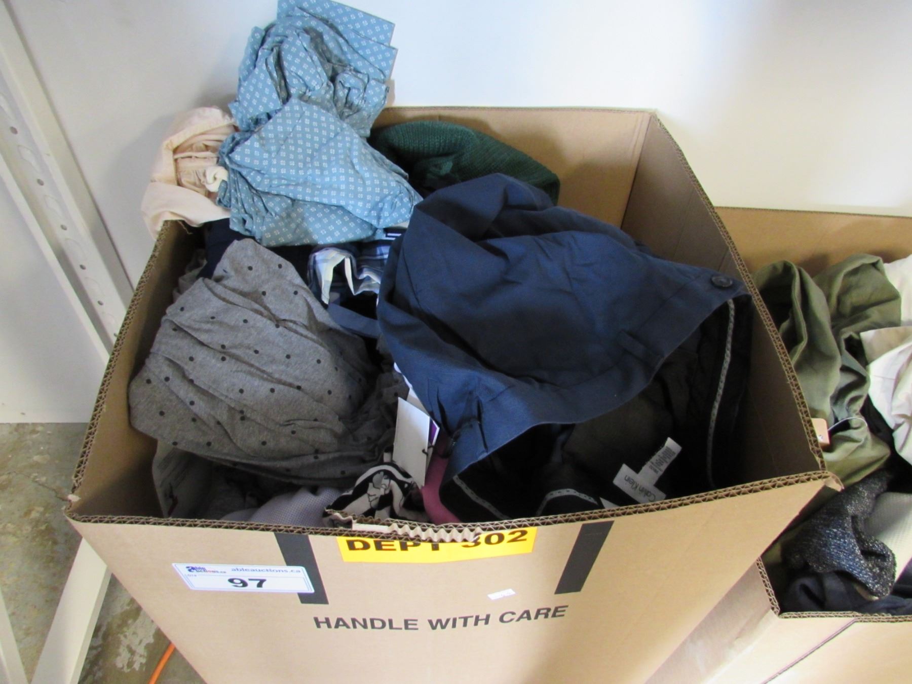 LARGE BOX OF SWEATERS, SHIRTS, DRESS PANTS, ETC