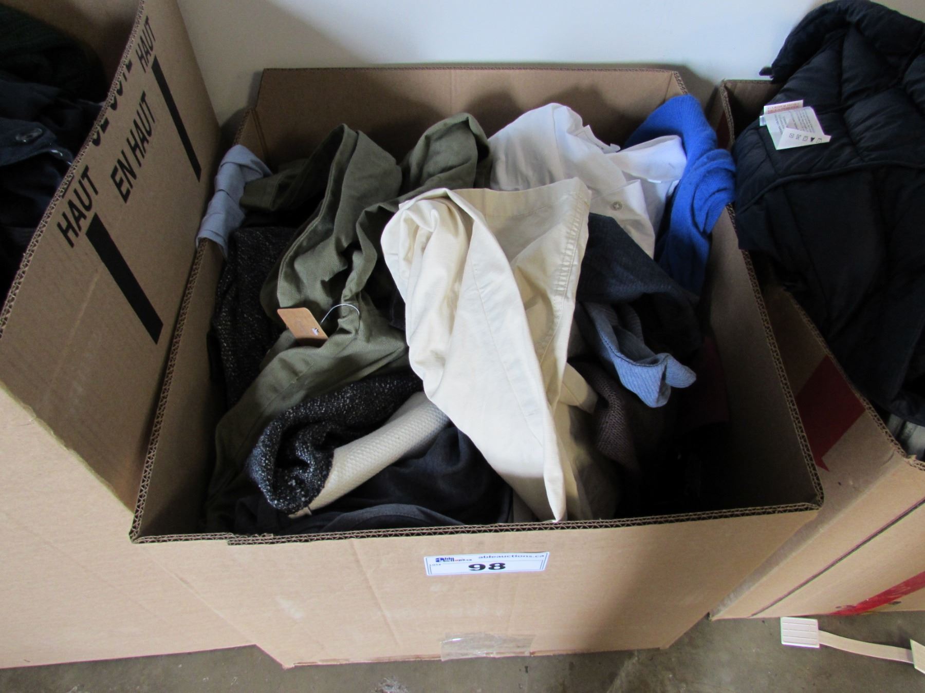 LARGE BOX OF SWEATERS, SHIRTS, ETC