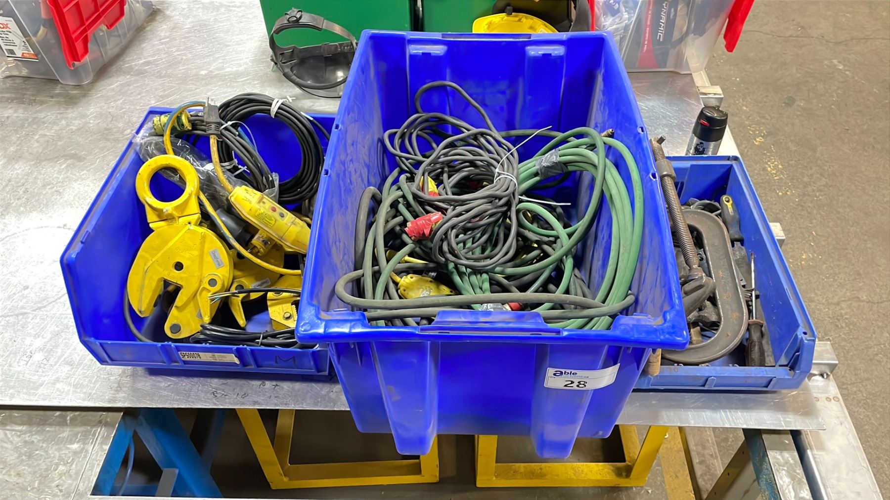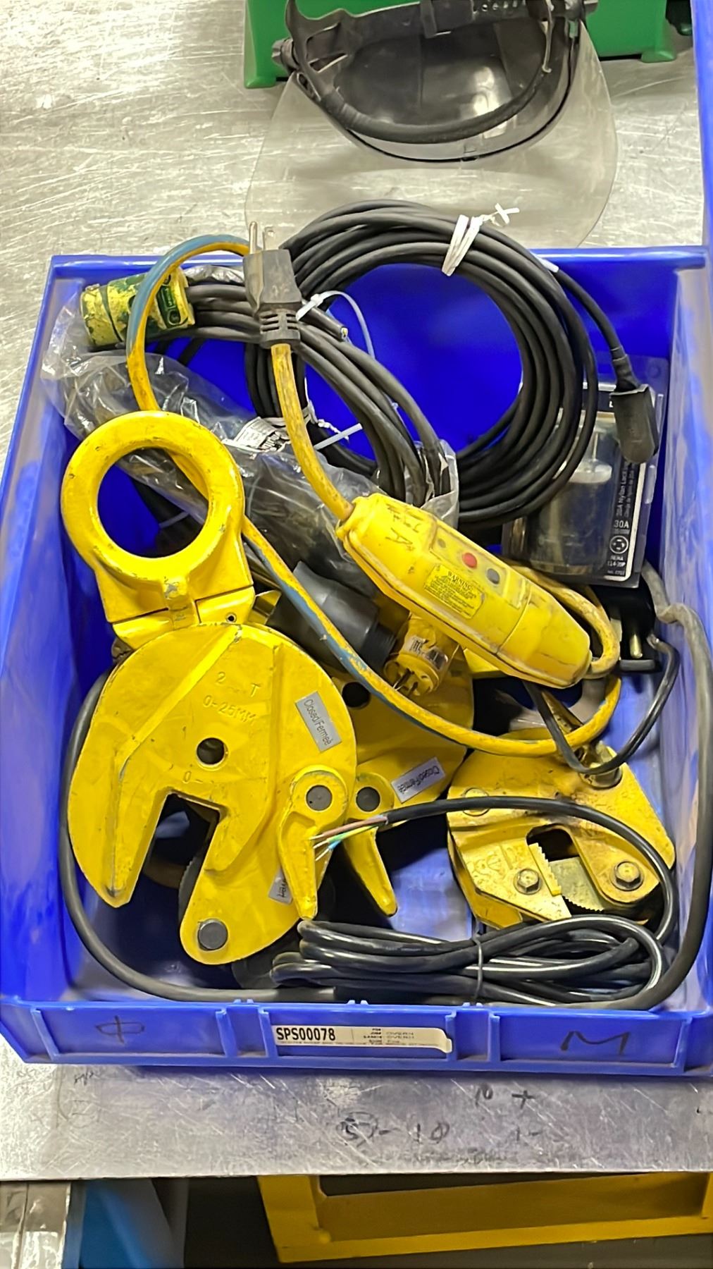 LARGE CLAMPS, ASSORTED HAND TOOLS, BIN OF EXTENSION CORDS AND PNEUMATIC HOSE, CRANE GRIP ATTACHMENTS