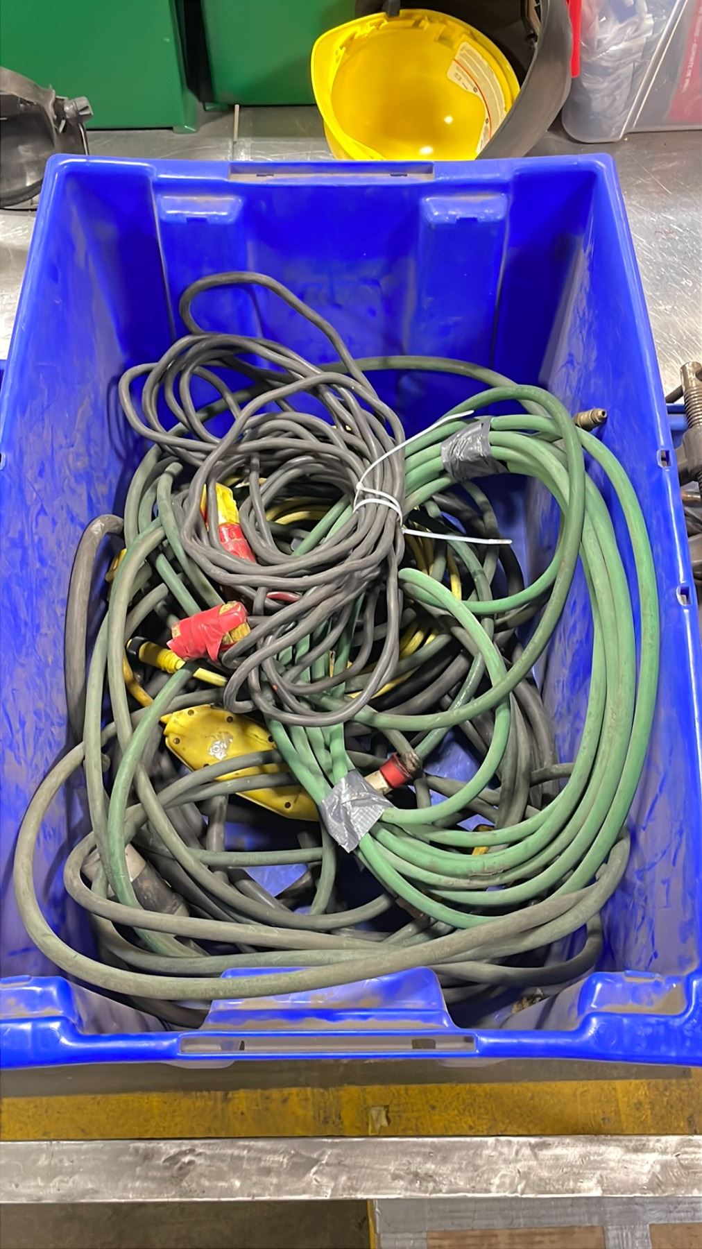 LARGE CLAMPS, ASSORTED HAND TOOLS, BIN OF EXTENSION CORDS AND PNEUMATIC HOSE, CRANE GRIP