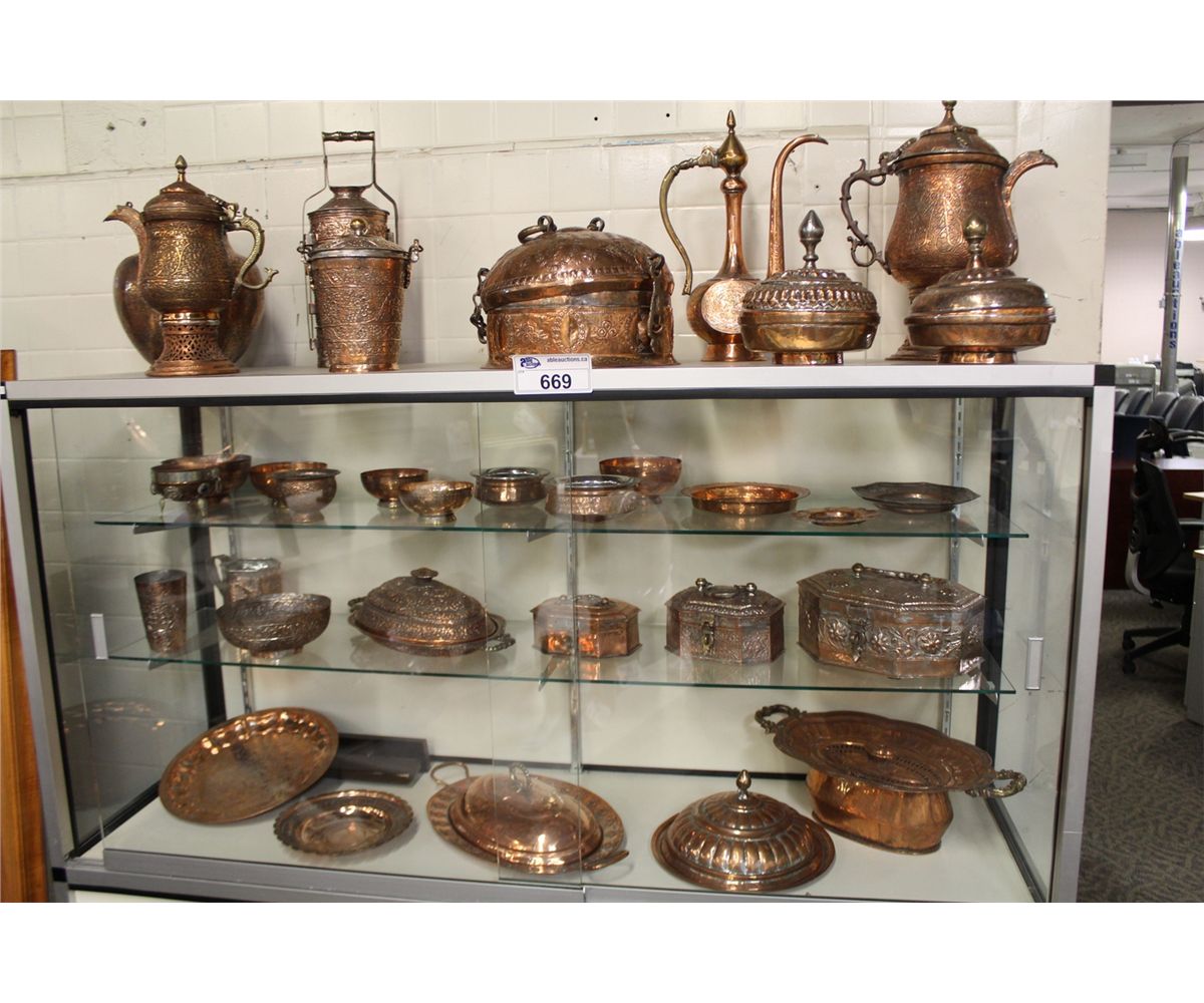 LARGE COLLECTION OF INDIAN COPPER VASES, SERVING DISHES, PLATTERS, TEAPOTS AND MORE!