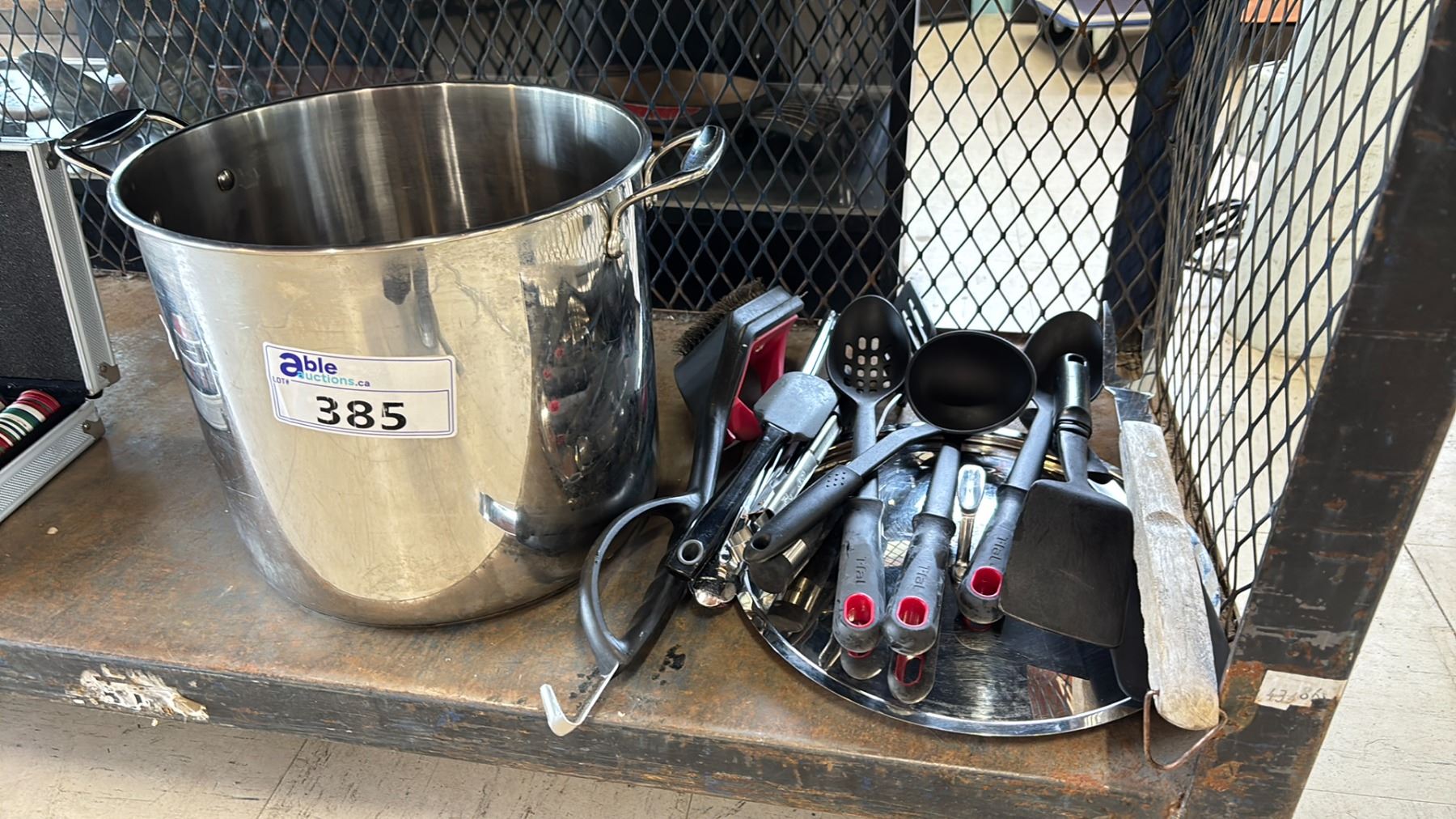 LARGE COOK POT & ASSORTED KITCHEN UTENSILS