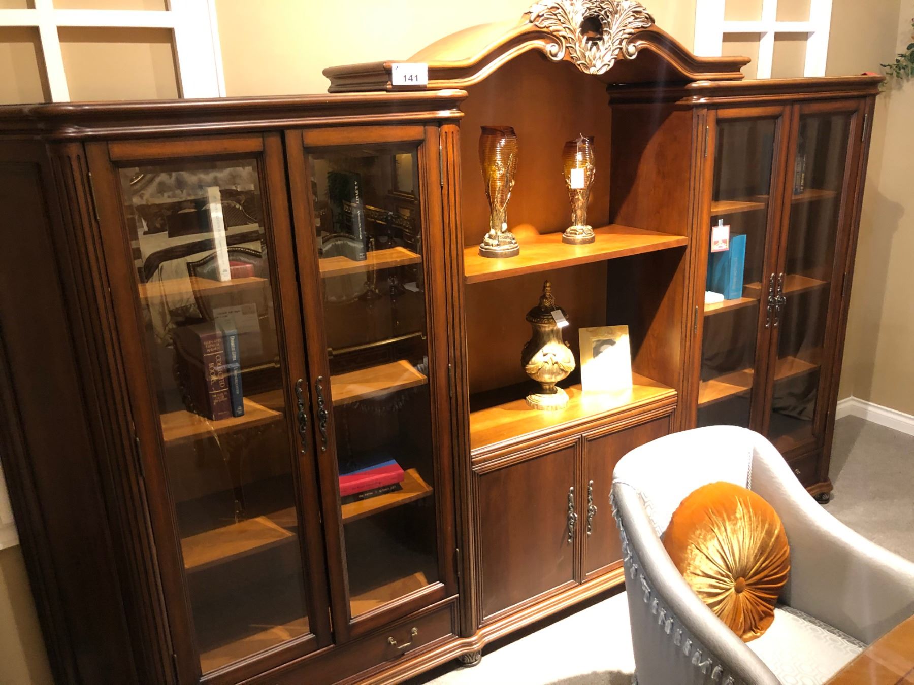 LARGE DARK WOOD WALL UNIT, APPROX. 15' WIDE. WITH GLASS DOORS. RETAIL $4,800.00 INCLUDES DECOR ITEMS WITHIN.