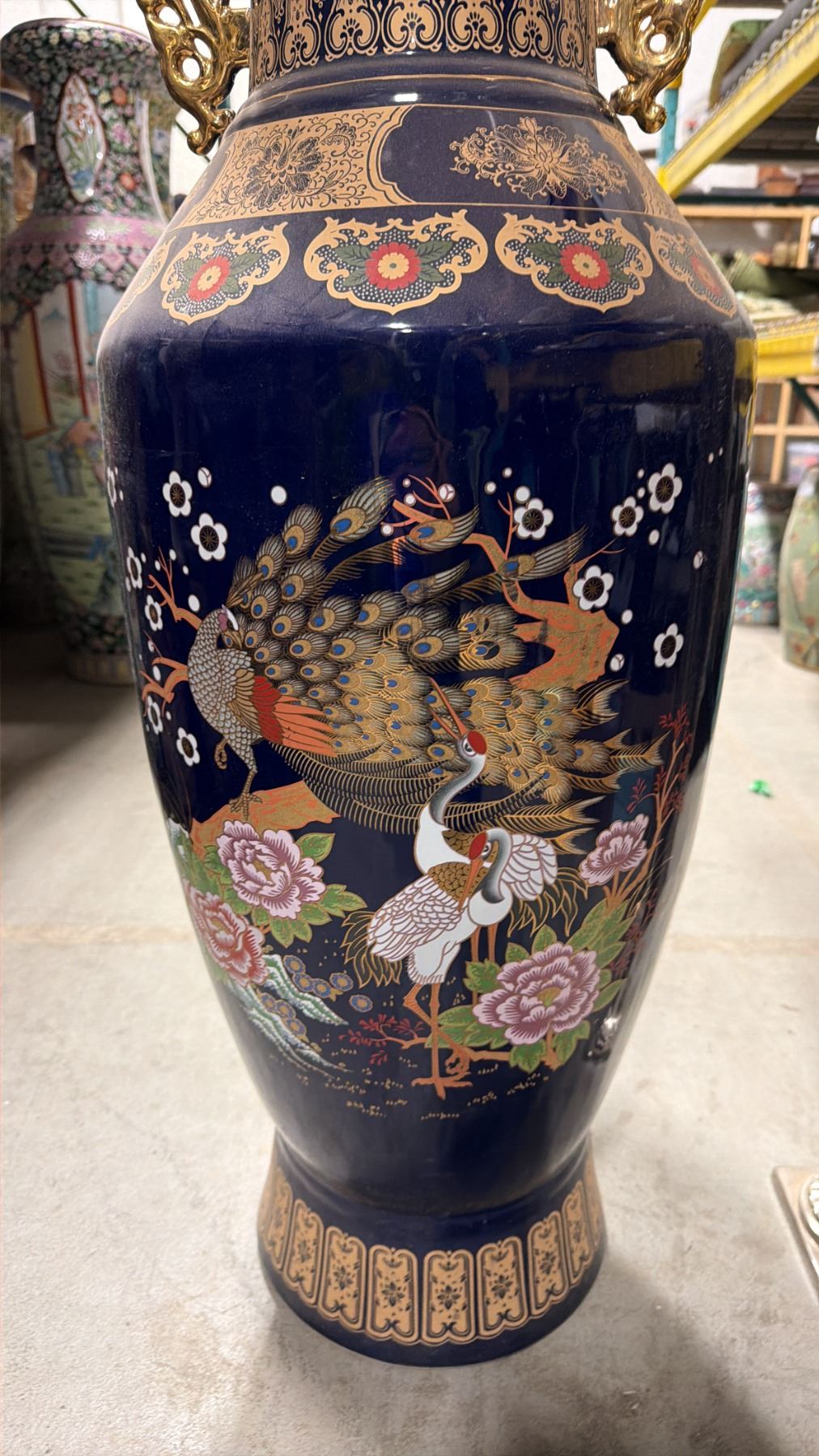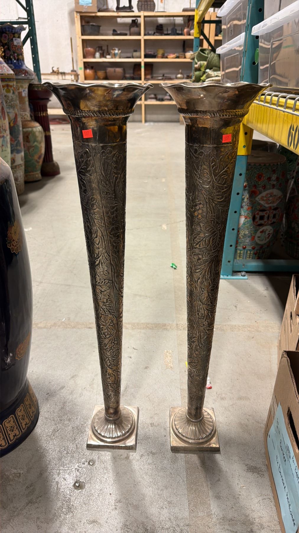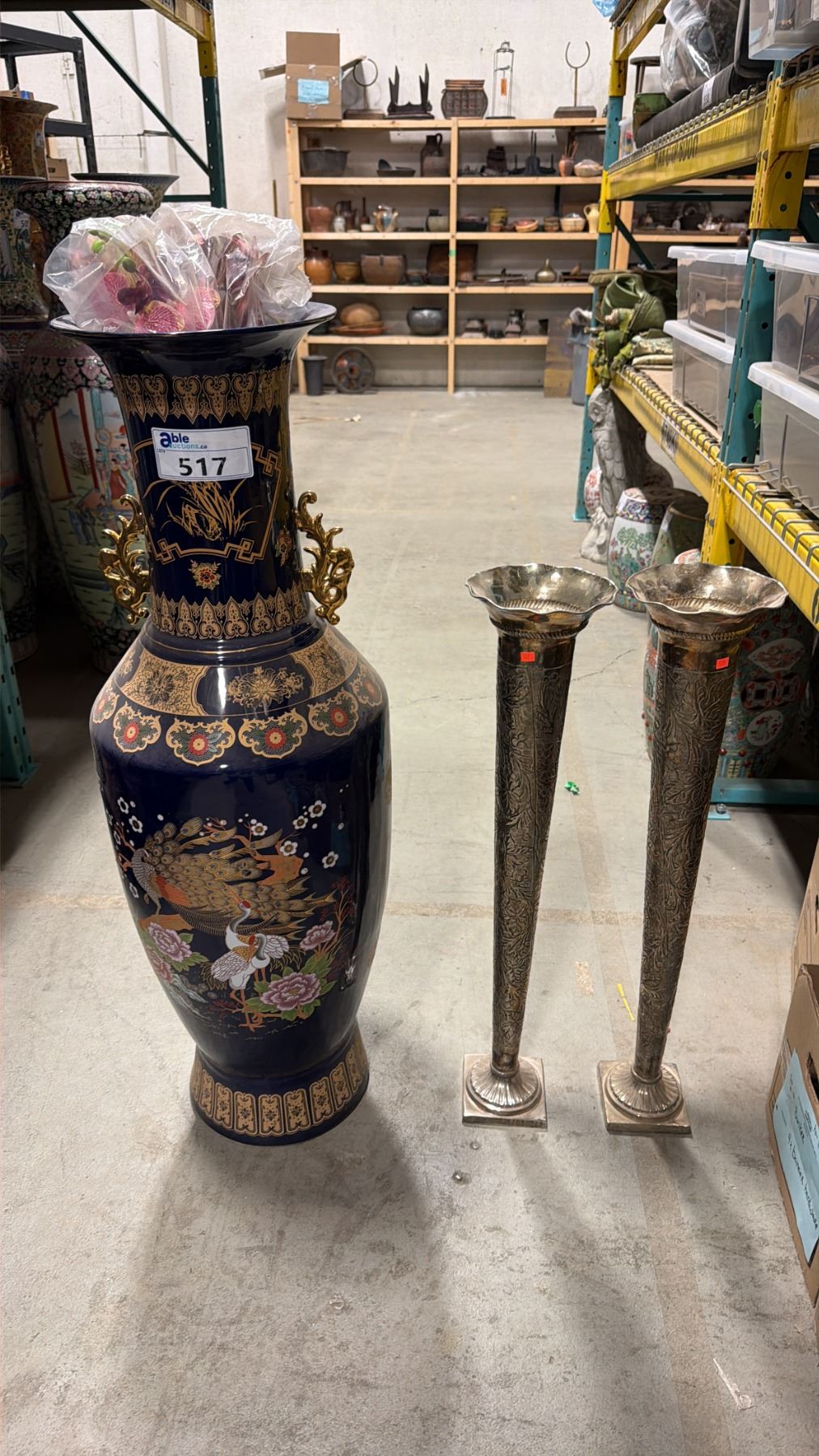 LARGE DECORATIVE ASIAN FLOOR VASE APPROX 42" TALL & PAIR OF BRASS FLOWER VASES APPROX 31" TALL