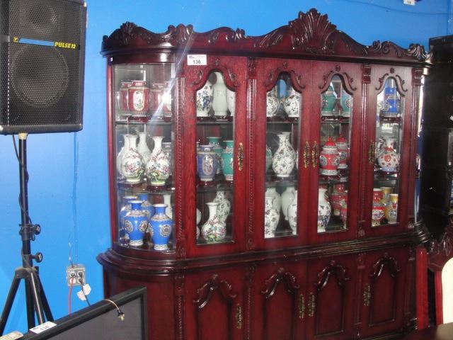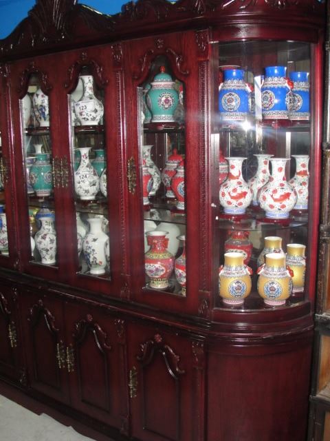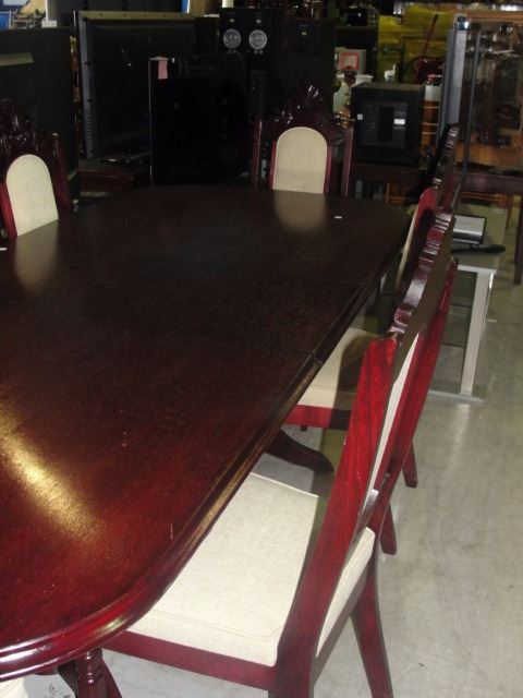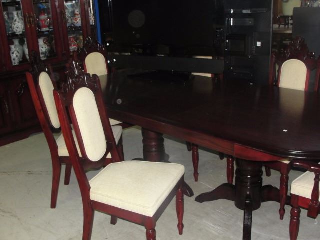 LARGE DINING ROOM SUITE INCLUDING TABLE, LEAF, 6 CHAIRS, BUFFET AND HUTCH WITH CURVED GLASS