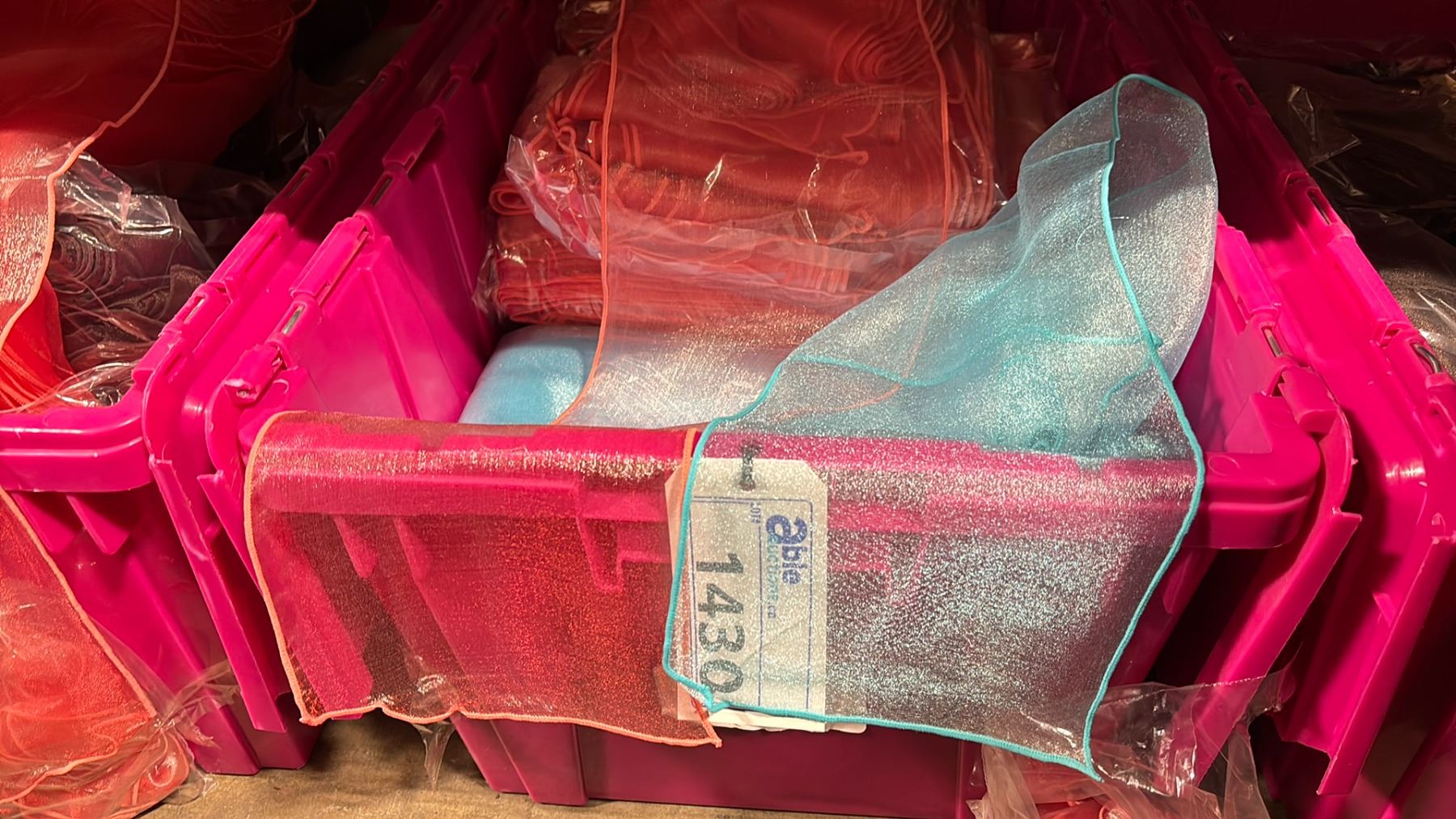 LARGE FOLD TOP BIN OF EVENT/ BANQUET CHAIR ORGANZA FABRIC ( ORANGE ) *BIN INCLUDED*