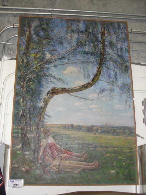 LARGE FRAMED ORIGINAL OIL ON CANVAS PAINTING - MOTHER AND DAUGHTER RELAXING UNDER TREE SIGNED BOTTOM RIGHT CORNER