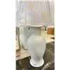 LARGE GLASS WHITE TABLE LAMP WITH ROUND SHADE APPROX. 36" TALL