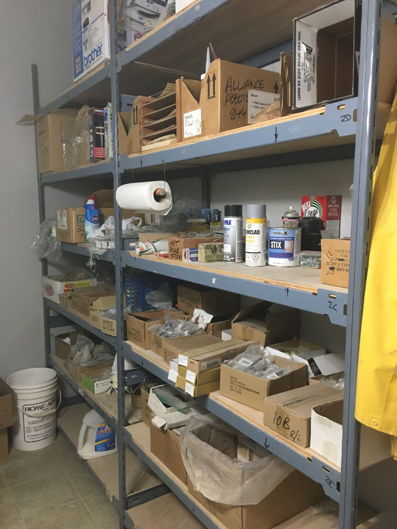 LARGE GREY SHELF RACKING UNIT AND CONTENTS - ASSORTED SHOP SUPPLIES, HARDWARE AND MISCELLANEOUS