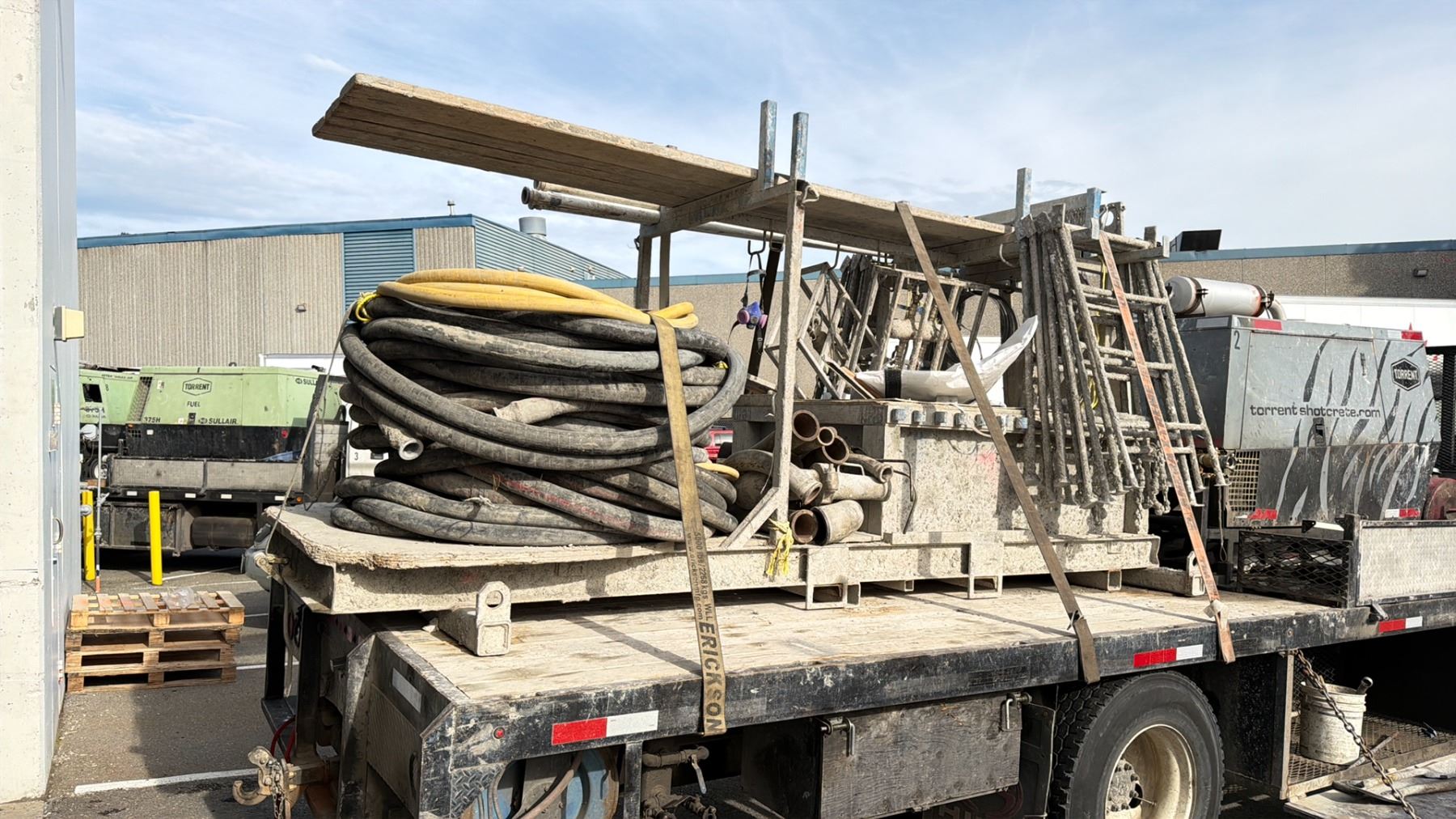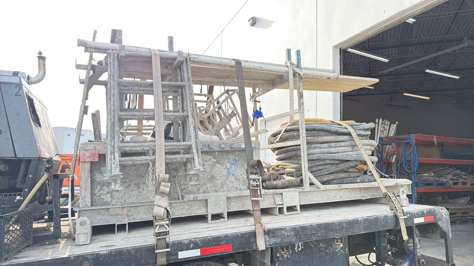 LARGE GREY SHOTCRETE CRANE LIFTED EQUIPMENT CART WITH HOSES, SCAFFOLDING PARTS & WALKBOARDS