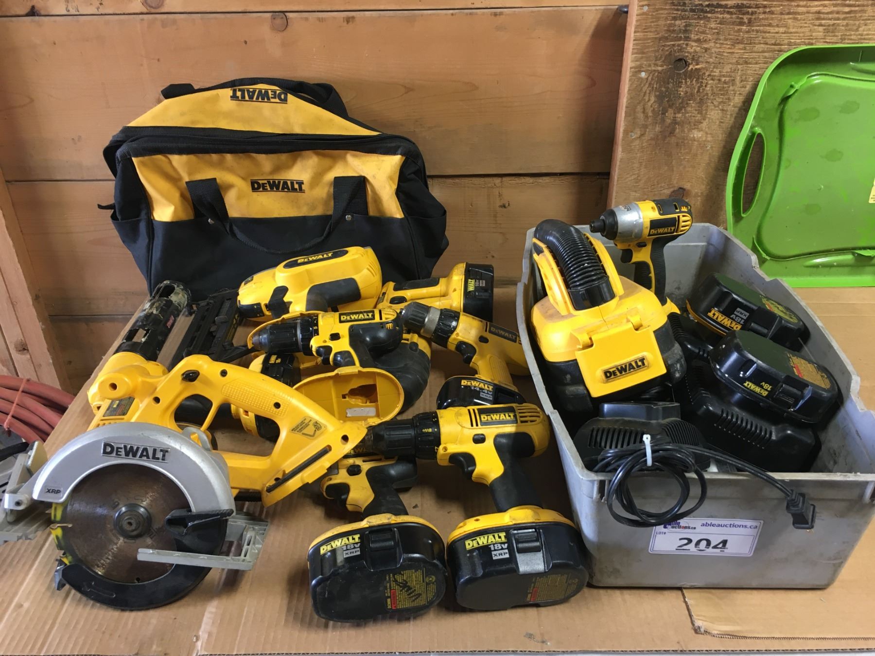LARGE GROUP OF 18V CORDLESS DEWALT POWER TOOLS WITH BATTERIES & CHARGERS