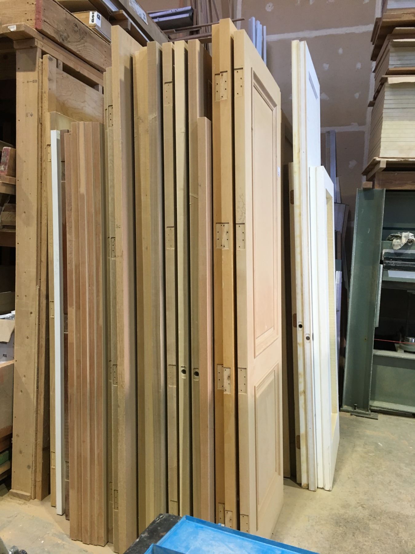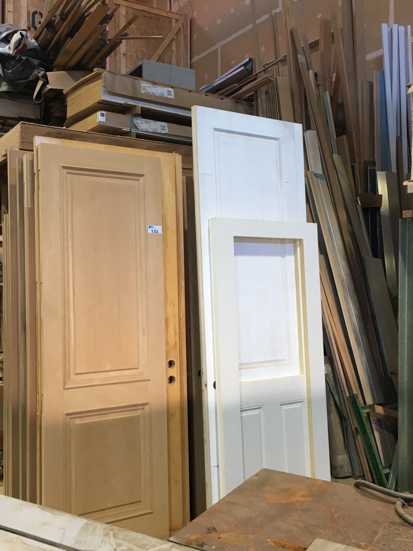 LARGE GROUP OF APPROX. 50 WOODEN DOORS & A CORNER LOT OF ASSORTED WOODEN MOULDINGS