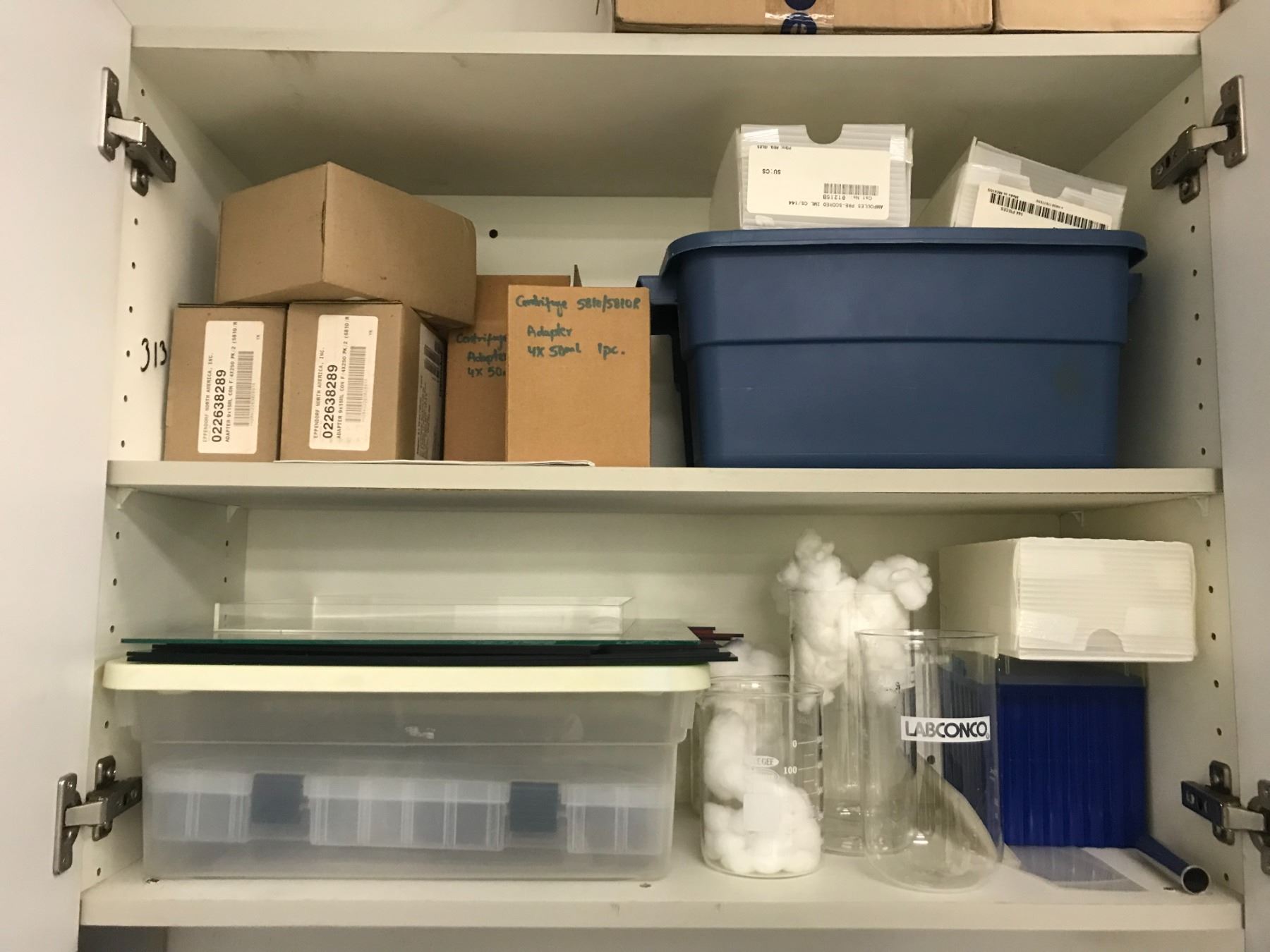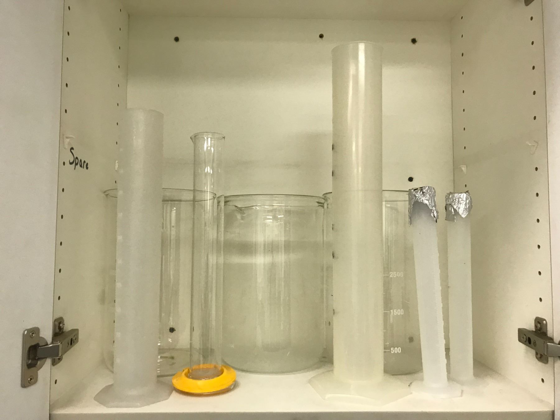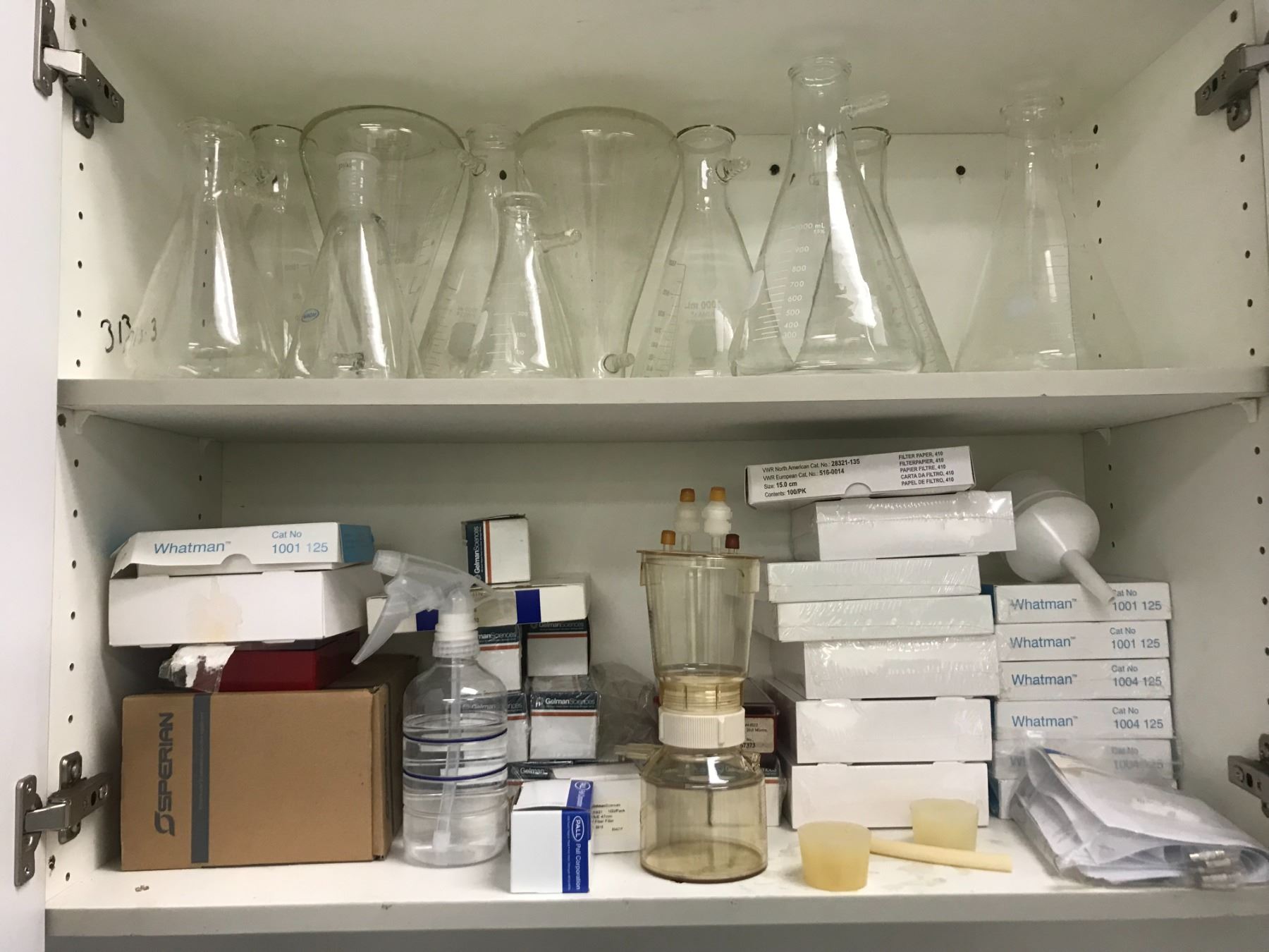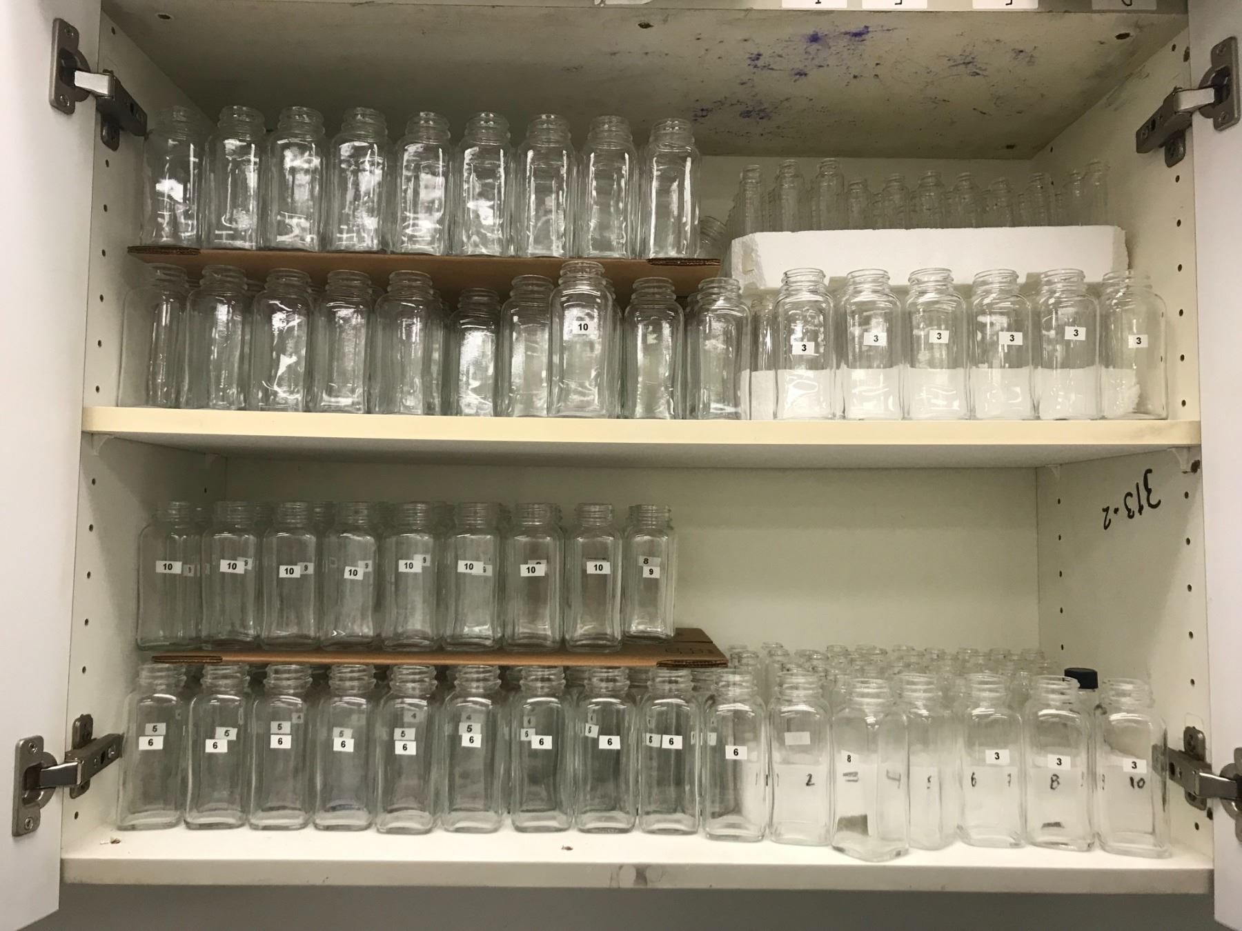 LARGE GROUP OF ASSORTED LAB SUPPLIES-5 CUPBOARDS OF BEAKERS, TEST TUBES, SPECIMEN JARS, ETC