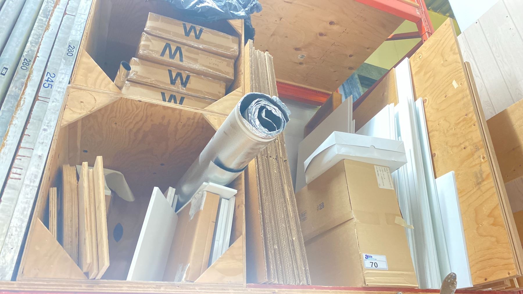 LARGE GROUP OF ASSORTED SIZE PACKING BOXES, ROLLS OF STYROFOAM PACKING MATERIAL, AIR CRAFT WIPES, 2 WOODEN STORAGE BOXES AND ASSORTED MISCELLANEOUS