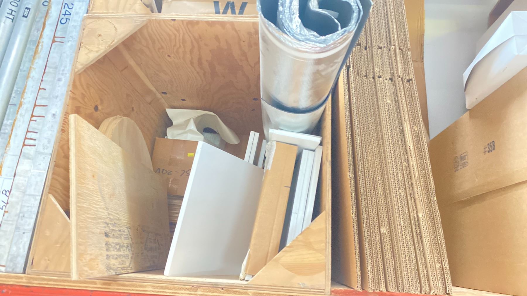 LARGE GROUP OF ASSORTED SIZE PACKING BOXES, ROLLS OF STYROFOAM PACKING MATERIAL, AIR CRAFT WIPES, 2