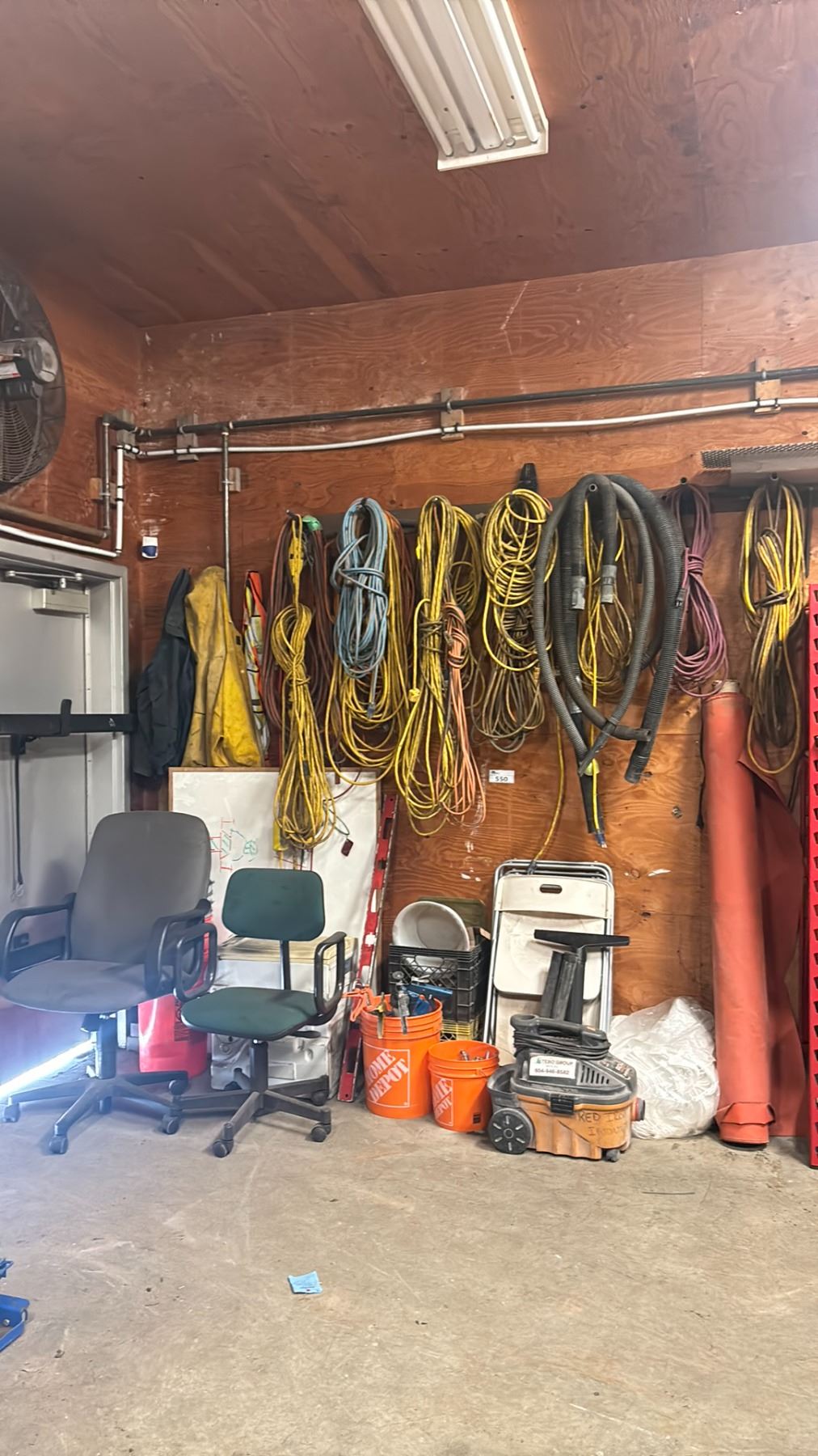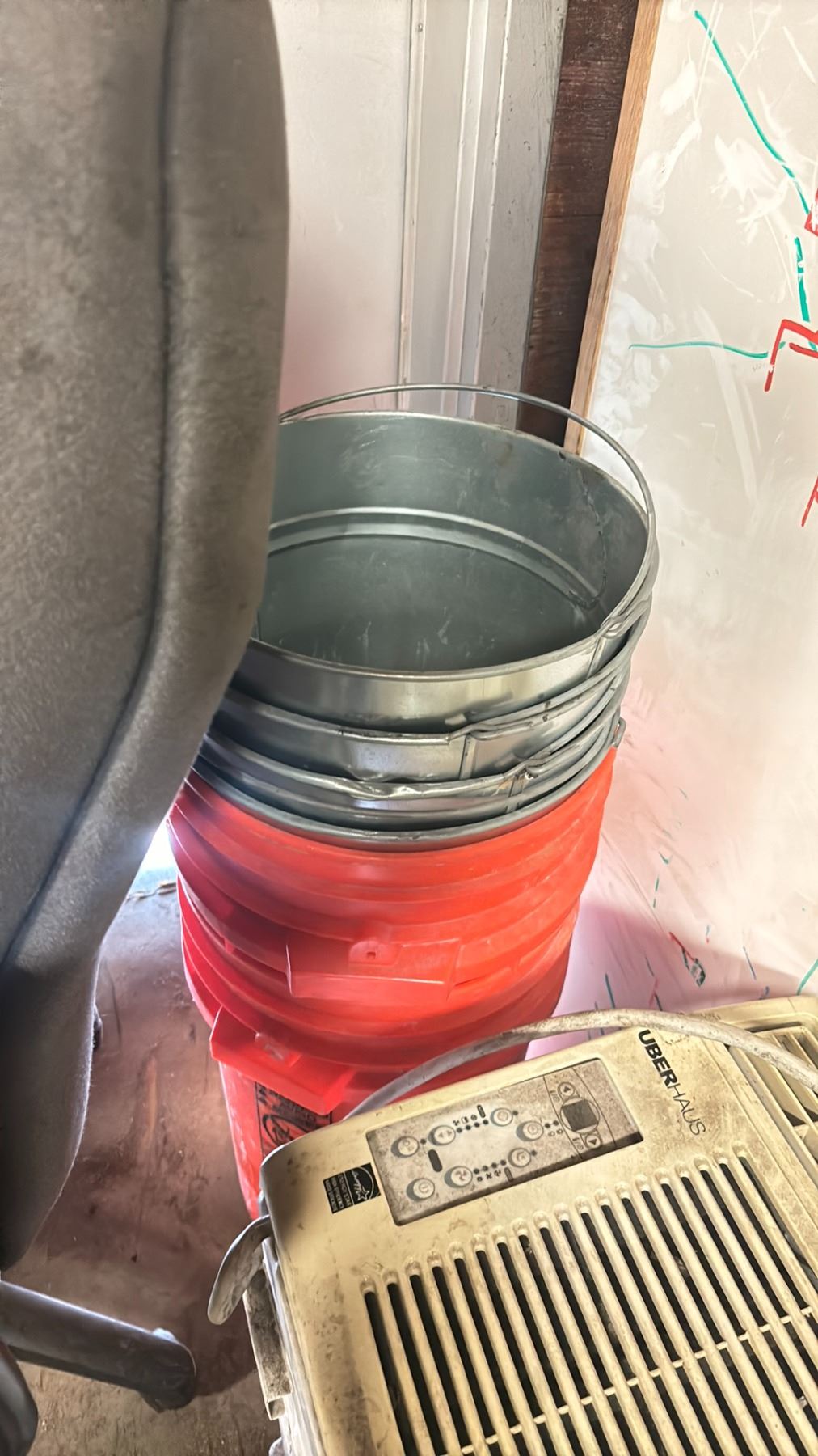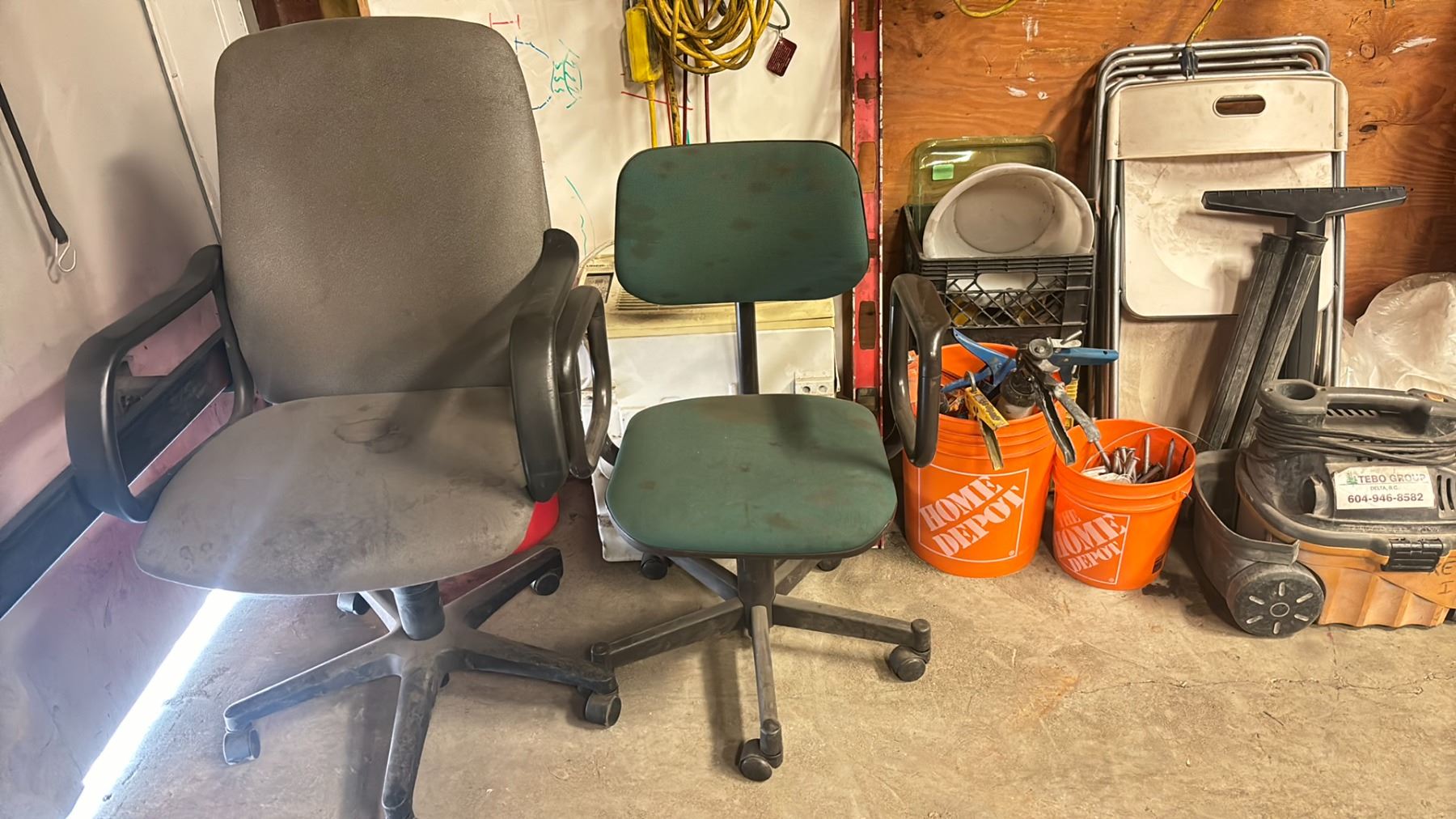 LARGE GROUP OF EXTENSION CORDS ( APPROX. 15 ), WHITE BOARD, AIR CONDITIONER, ROLL OF ORANGE HEAVY DUTY CANVAS MATERIAL, GALVANIZED/PLASTIC BUCKETS, 2 OFFICE CHAIRS & 3 FOLDING CHAIRS
