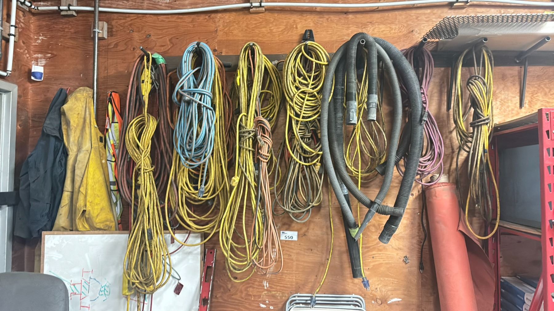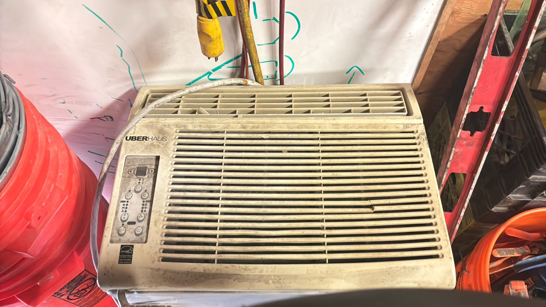 LARGE GROUP OF EXTENSION CORDS ( APPROX. 15 ), WHITE BOARD, AIR CONDITIONER, ROLL OF ORANGE HEAVY