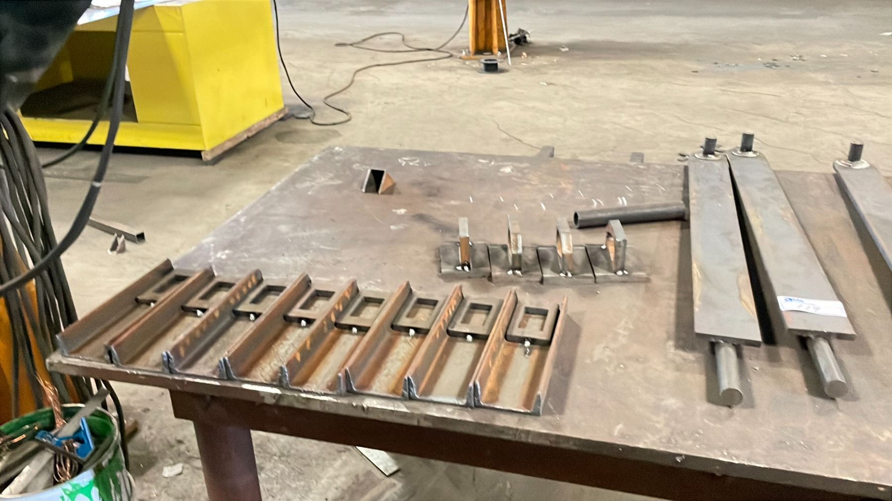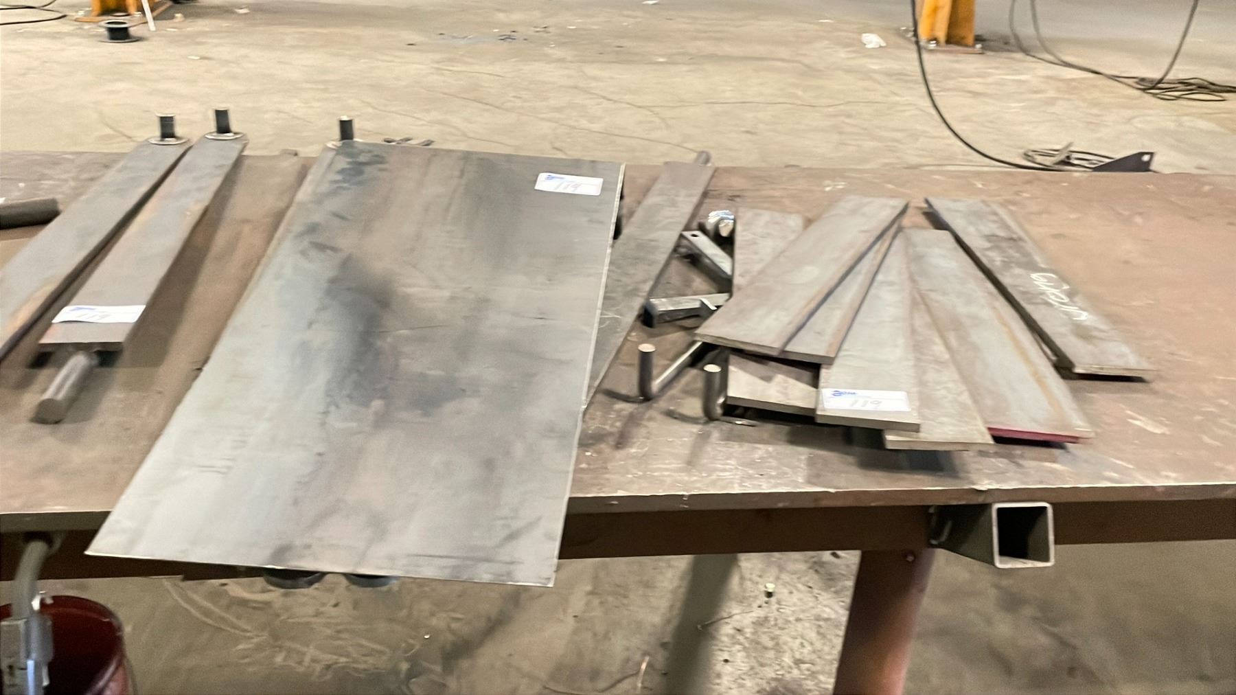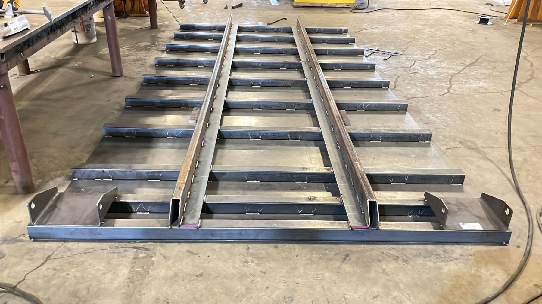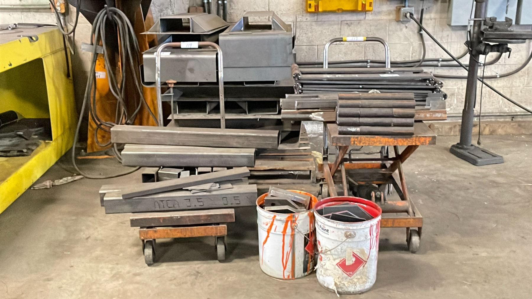 LARGE GROUP OF FABRICATED STEEL ROLLER BIN COMPONENTS (LARGE & SMALL PIECES) *2 METAL 4 WHEEL PLATFORM LIFT DOLLIES INCLUDED**