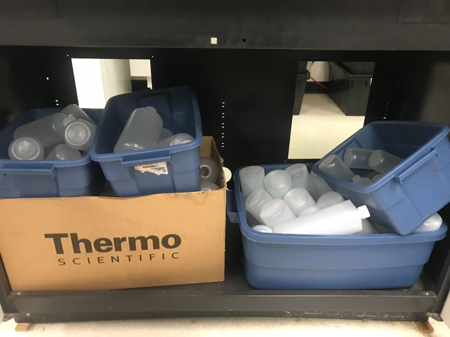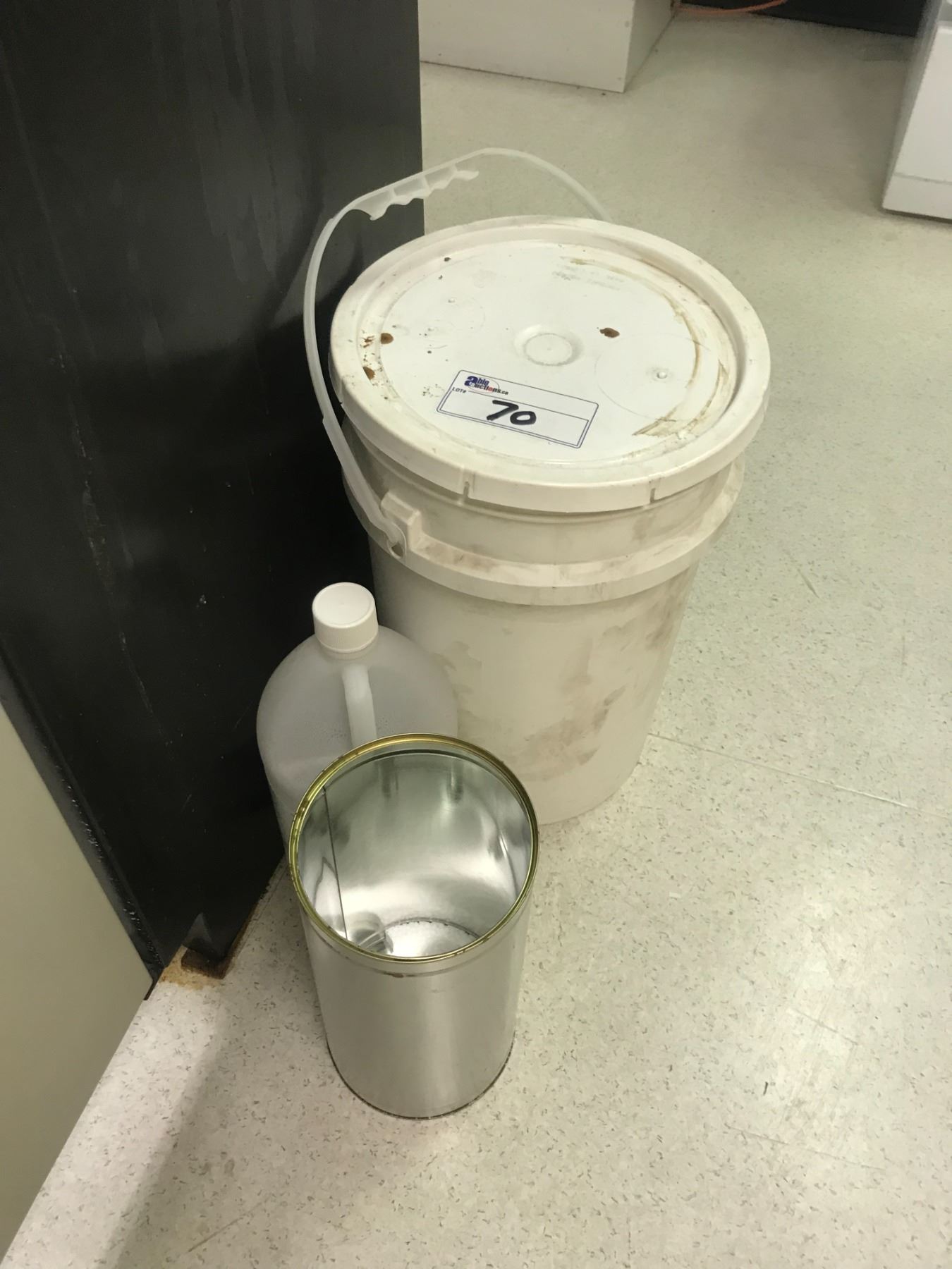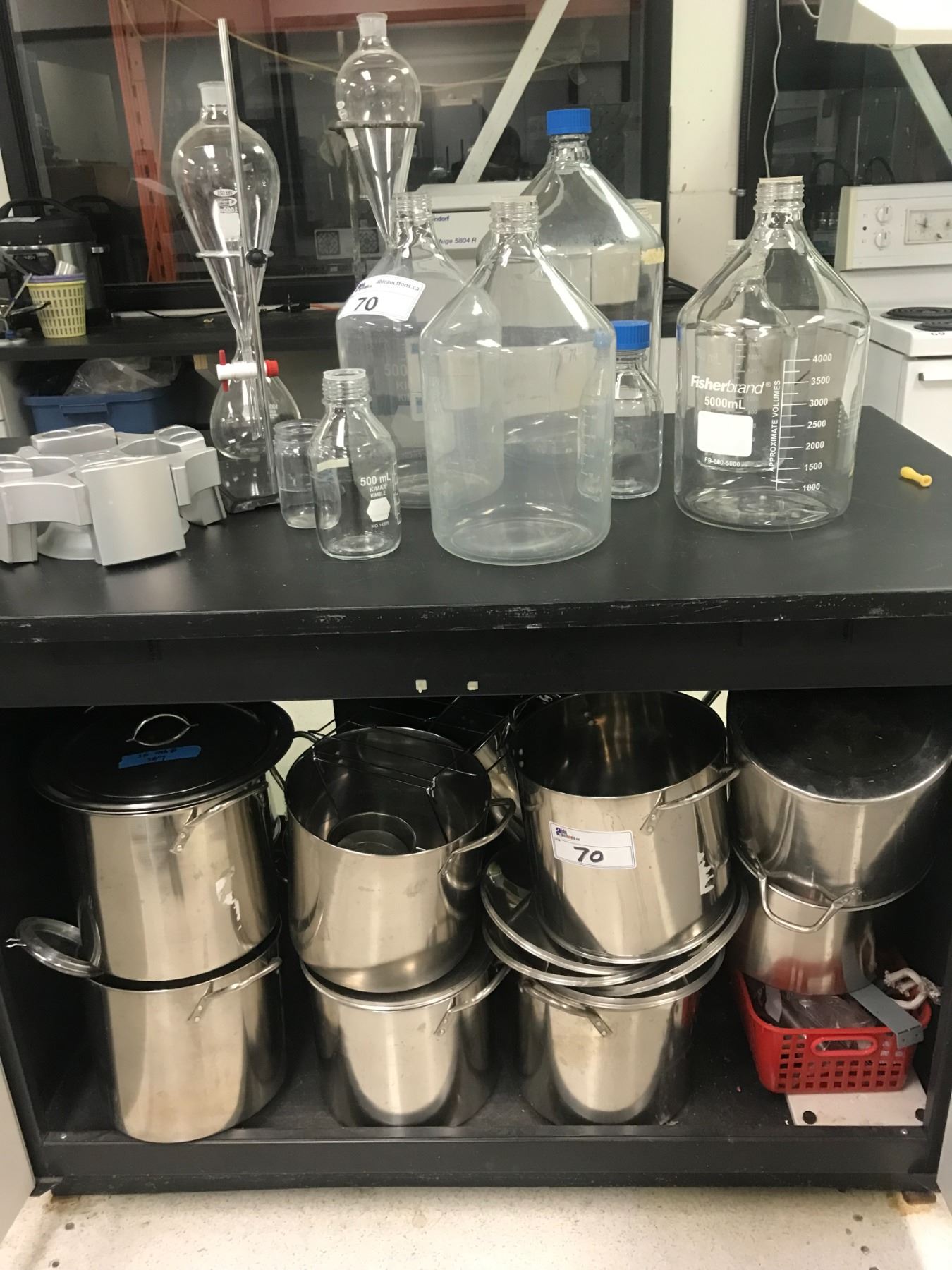 LARGE GROUP OF GLASS BEAKERS, STAINLESS STEEL COOKING POTS, PLASTIC JARS, ETC