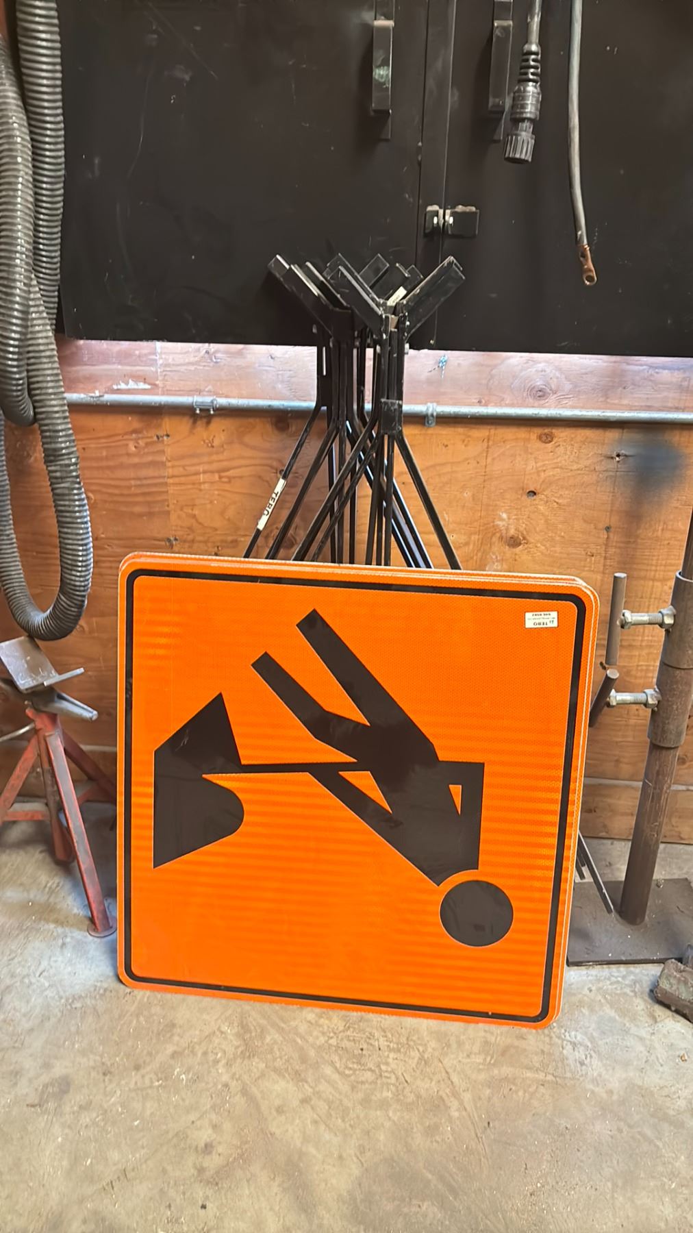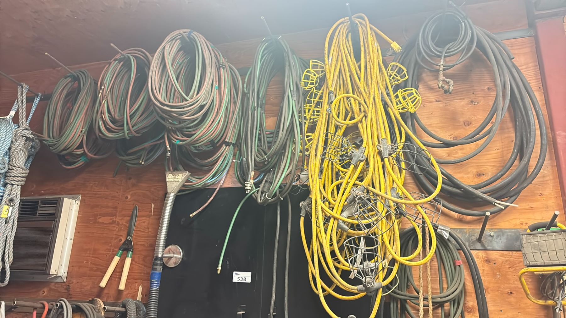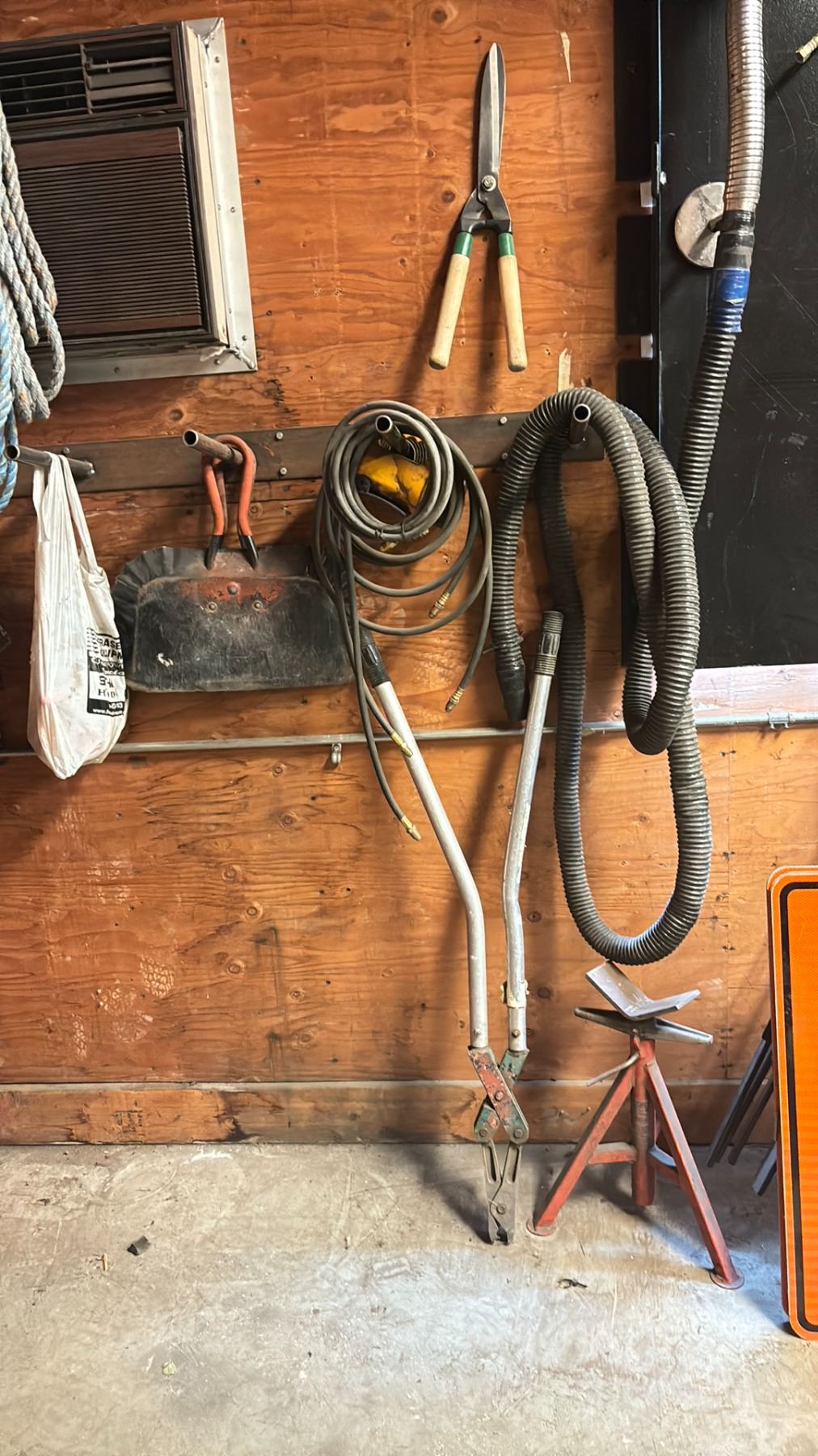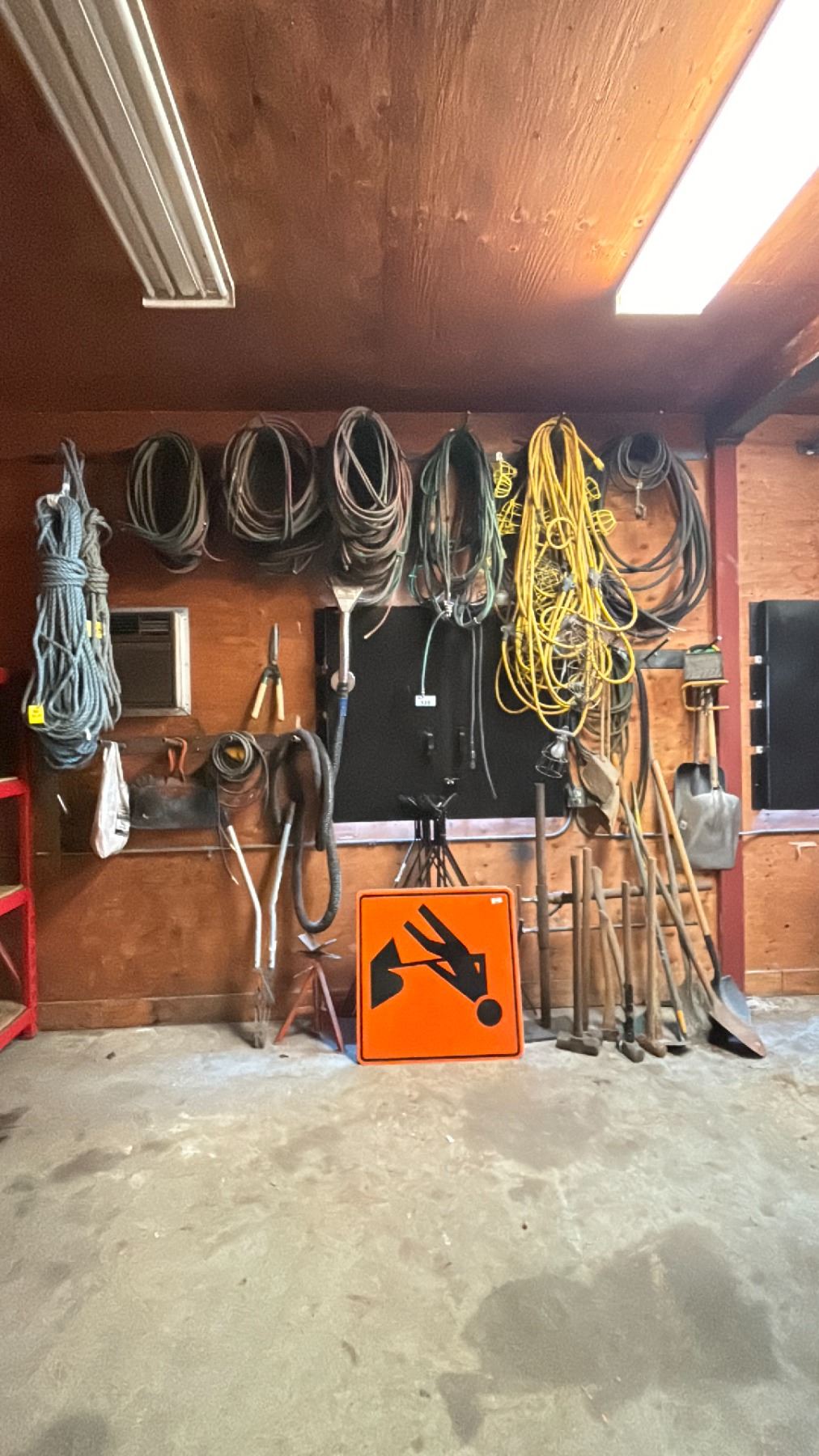 LARGE GROUP OF ITEMS - OXYACETYLENE LINES, BRAIDED ROPE, ELECTRICAL OUTDOOR/ INDOOR LIGHT STRINGS ASSORTED HAND TOOLS & ROAD SIGNS WITH STANDS