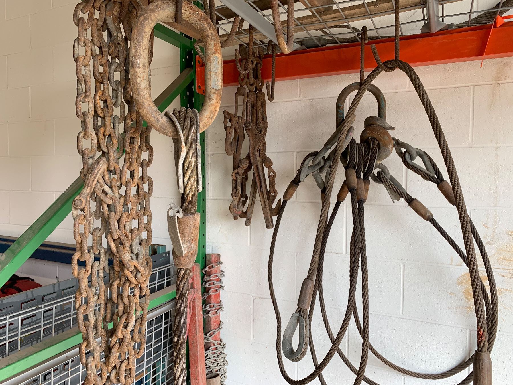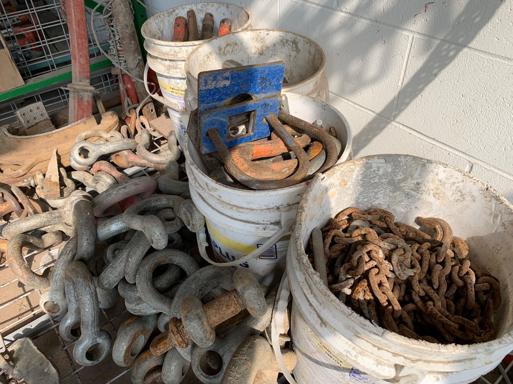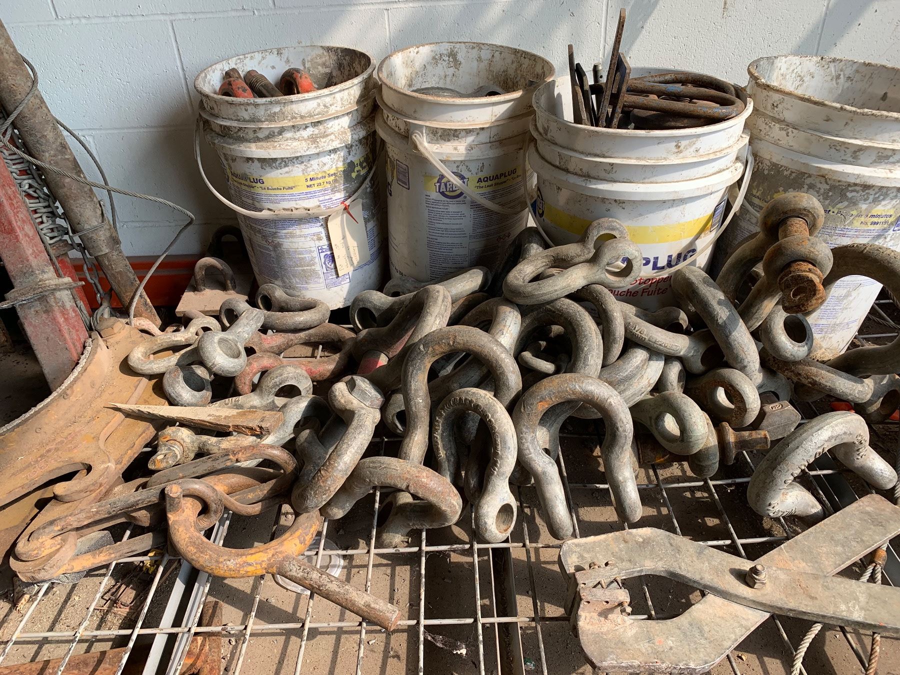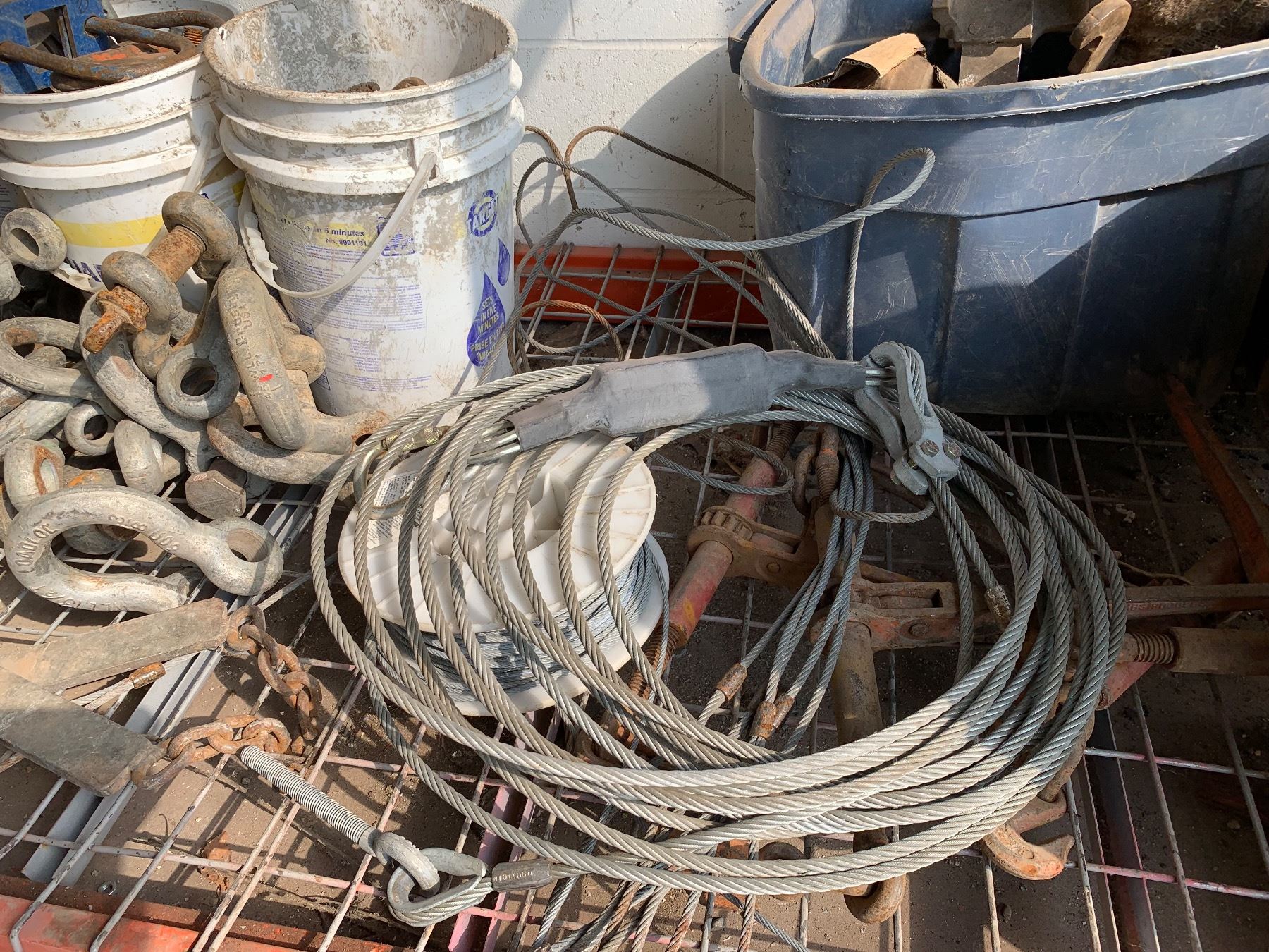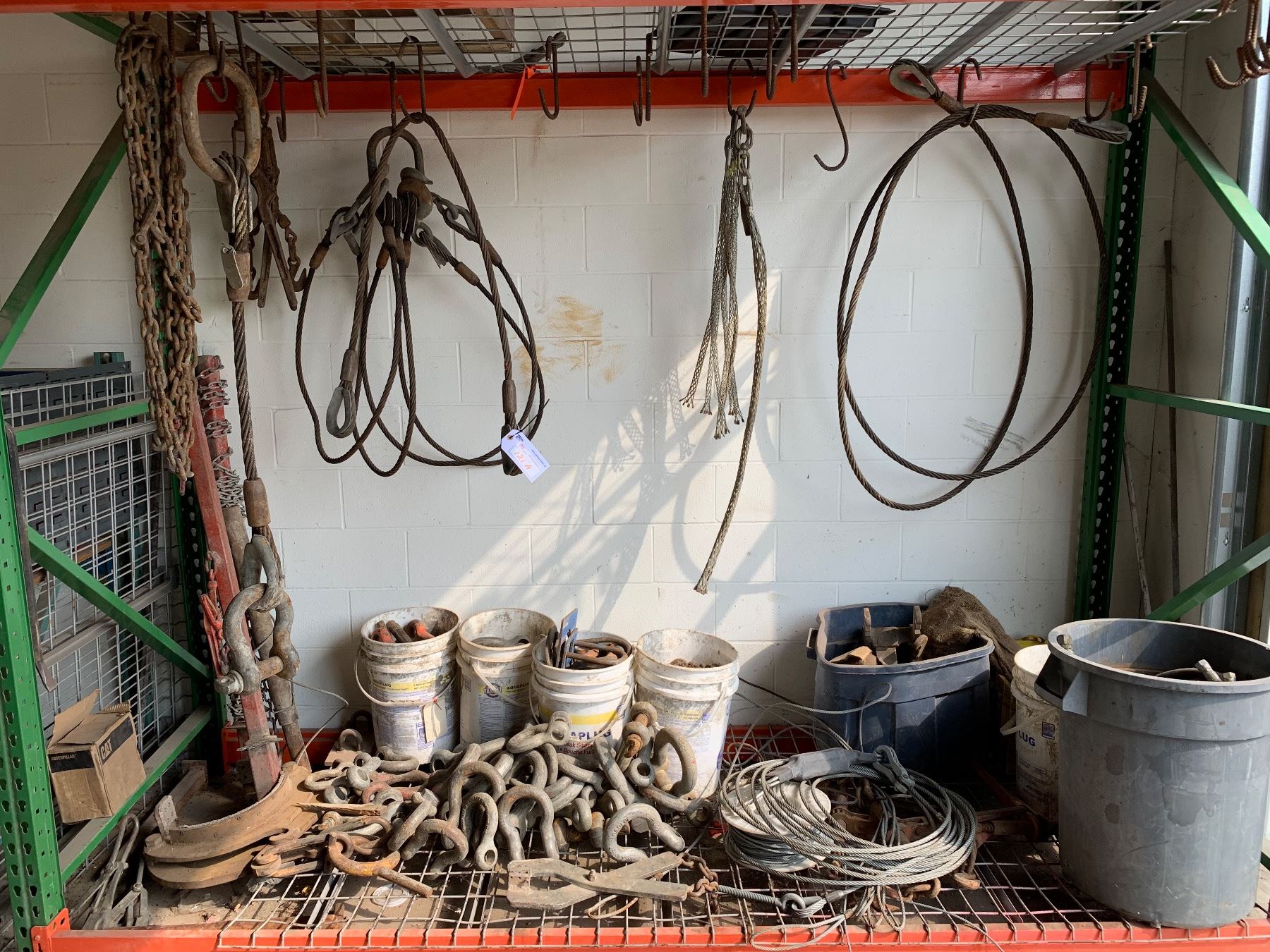 LARGE GROUP OF LIFT LINES,BRAIDED CABLE,SCREW PIN SHACKLES, CHAIN, ETC