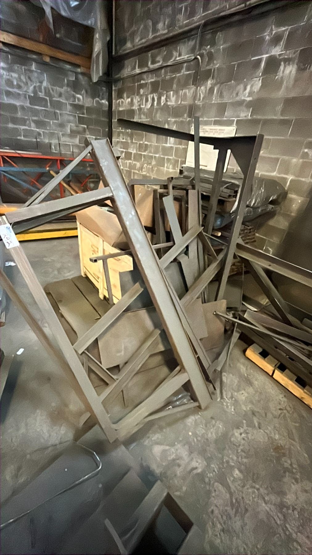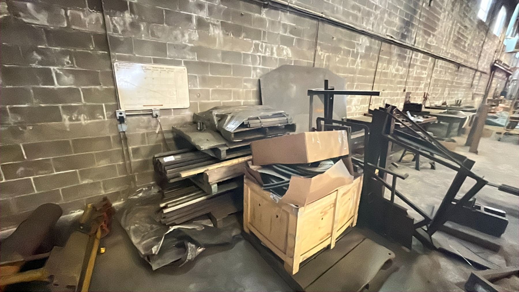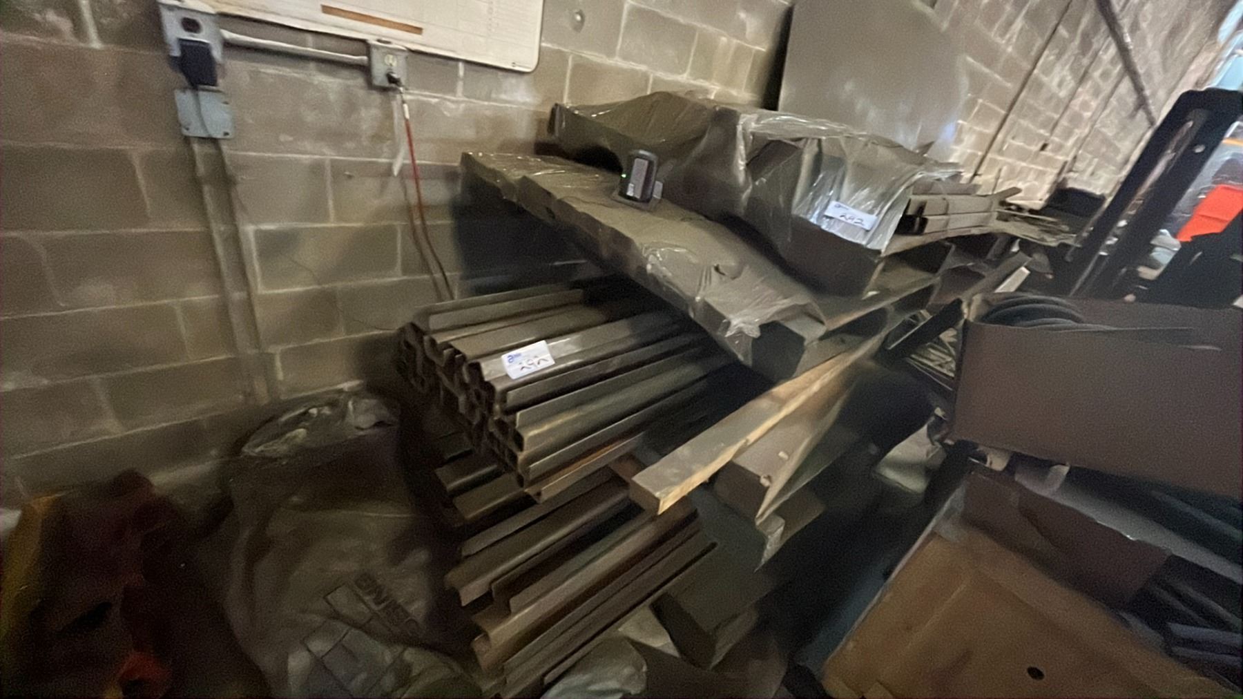 LARGE GROUP OF METAL MATERIAL PARTS AND SOME SCRAP ASSORTED SIZES LENGTHS AND DIMENSIONS 3 PALLETS OF GOOD VARIOUS SIZE MATERIAL TUBING AND FLAT BAR, WOODEN CRATE OF SCRAP STEEL AND THREE BOX'S OF RUBBER FOAM INSULATION AND MISC CUTS OF METAL SHEETING