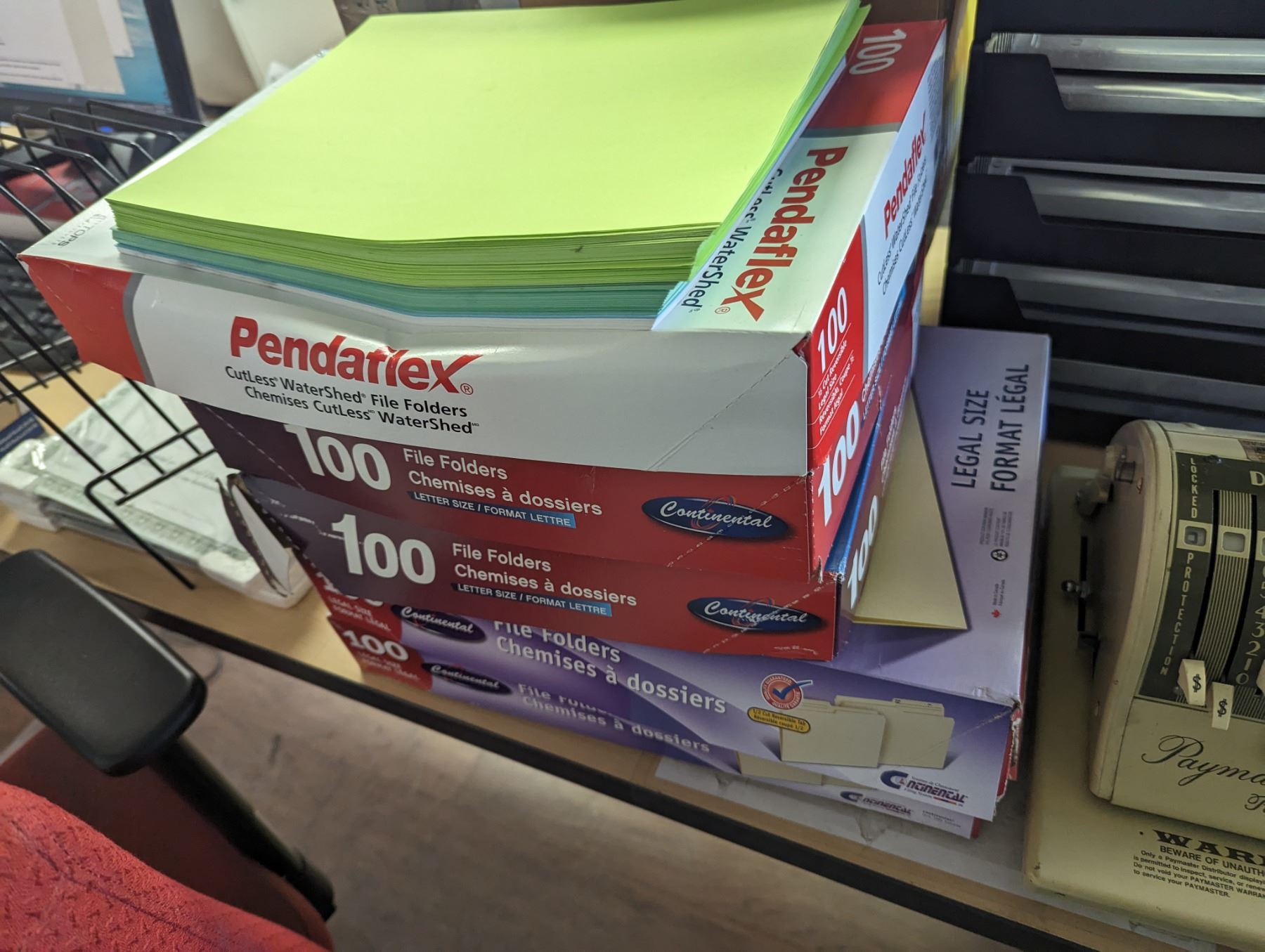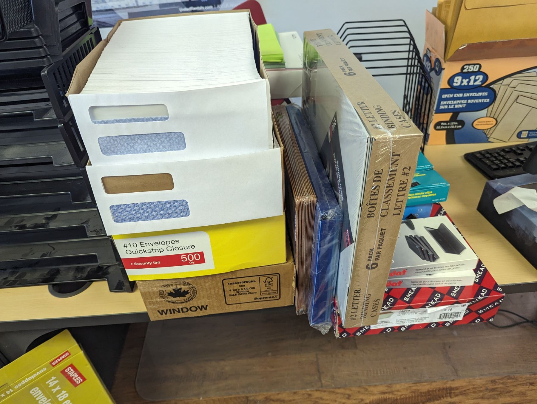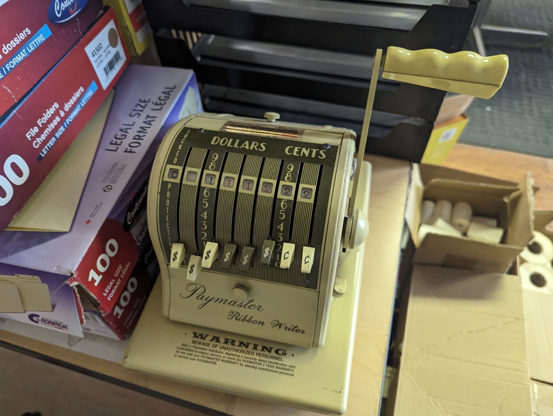 LARGE GROUP OF OFFICE SUPPLIES. FILE TRAYS, ADDING MACHINE, FRAMES, VINTAGE CHEQUE WRITER, SHEET PROTECTORS, PAPER CUTTER AND MUCH MORE