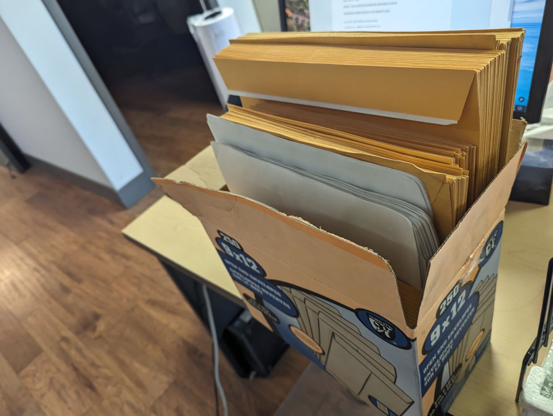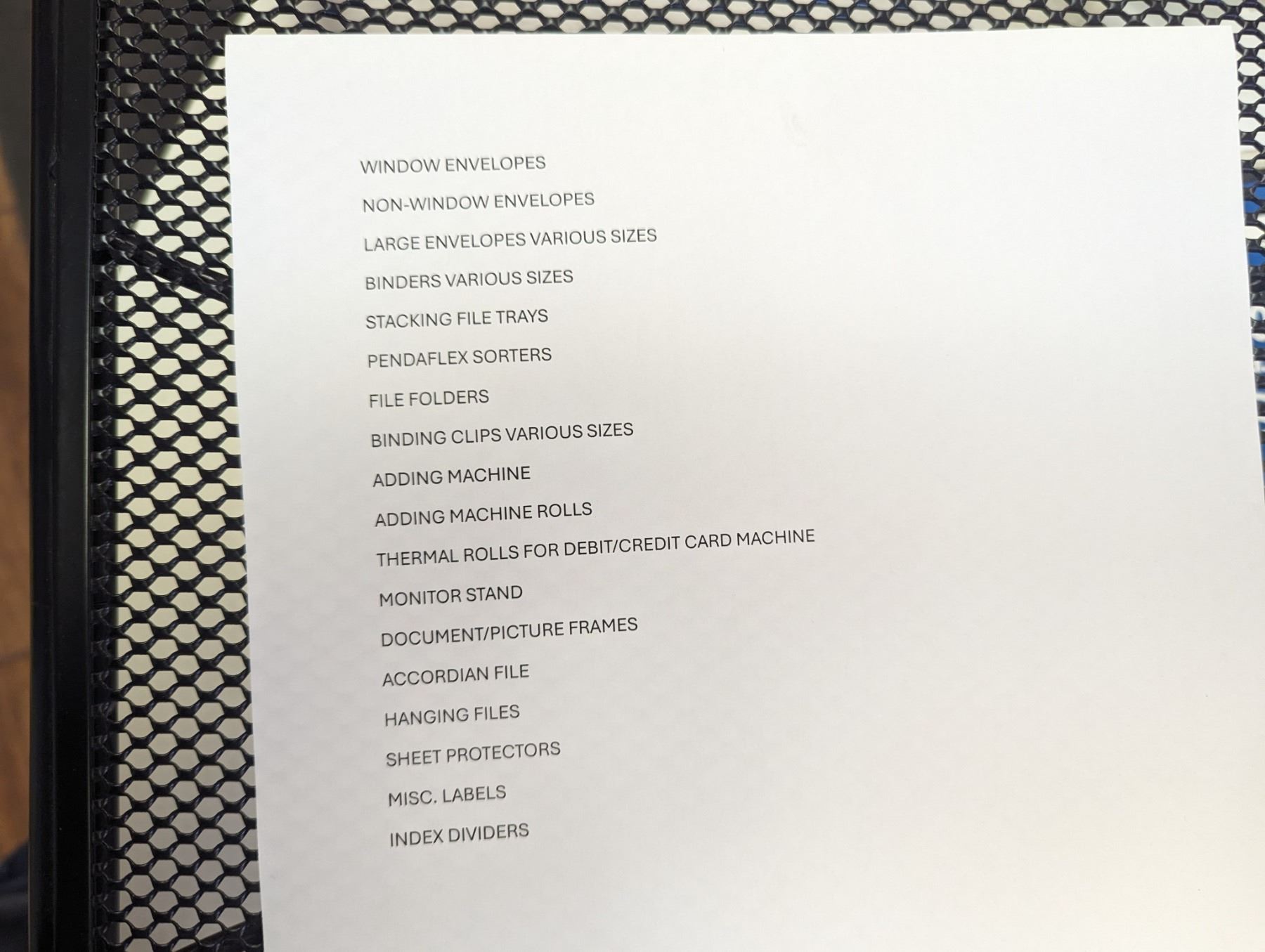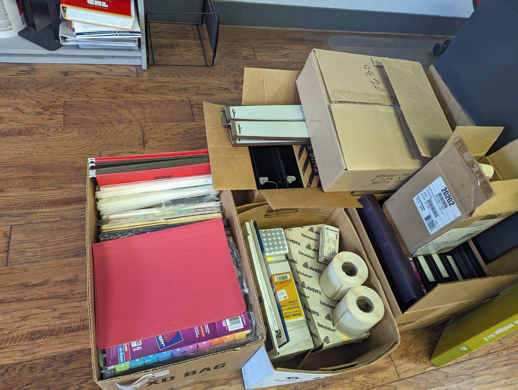 LARGE GROUP OF OFFICE SUPPLIES. FILE TRAYS, ADDING MACHINE, FRAMES, VINTAGE CHEQUE WRITER, SHEET PROTECTORS, PAPER CUTTER AND MUCH MORE