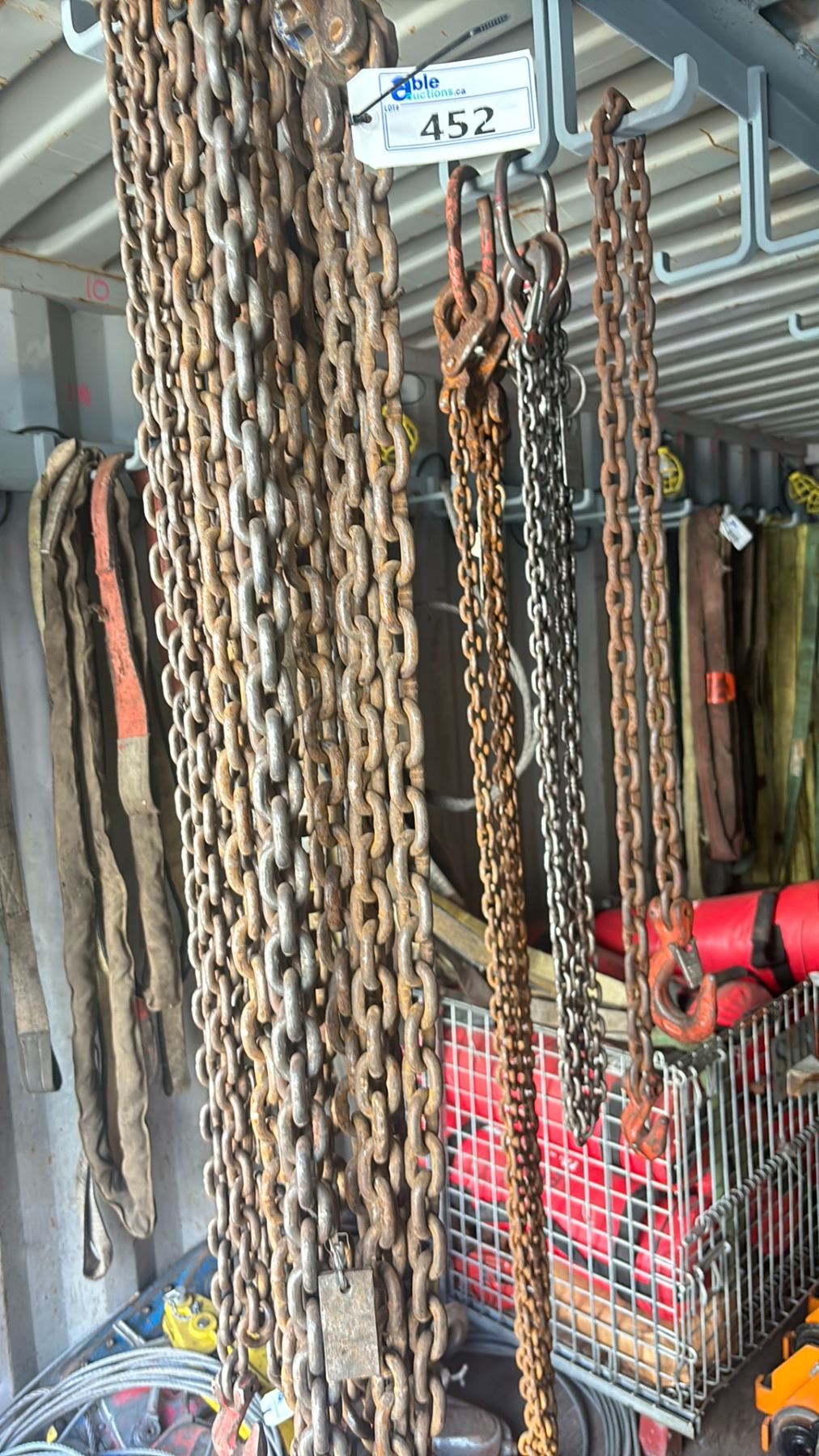 LARGE GROUP OF RIGGING CHAINS, BRAIDED CABLE LIFT LINE, AIR LINE HOSE, SCREW PIN SHACKLES &