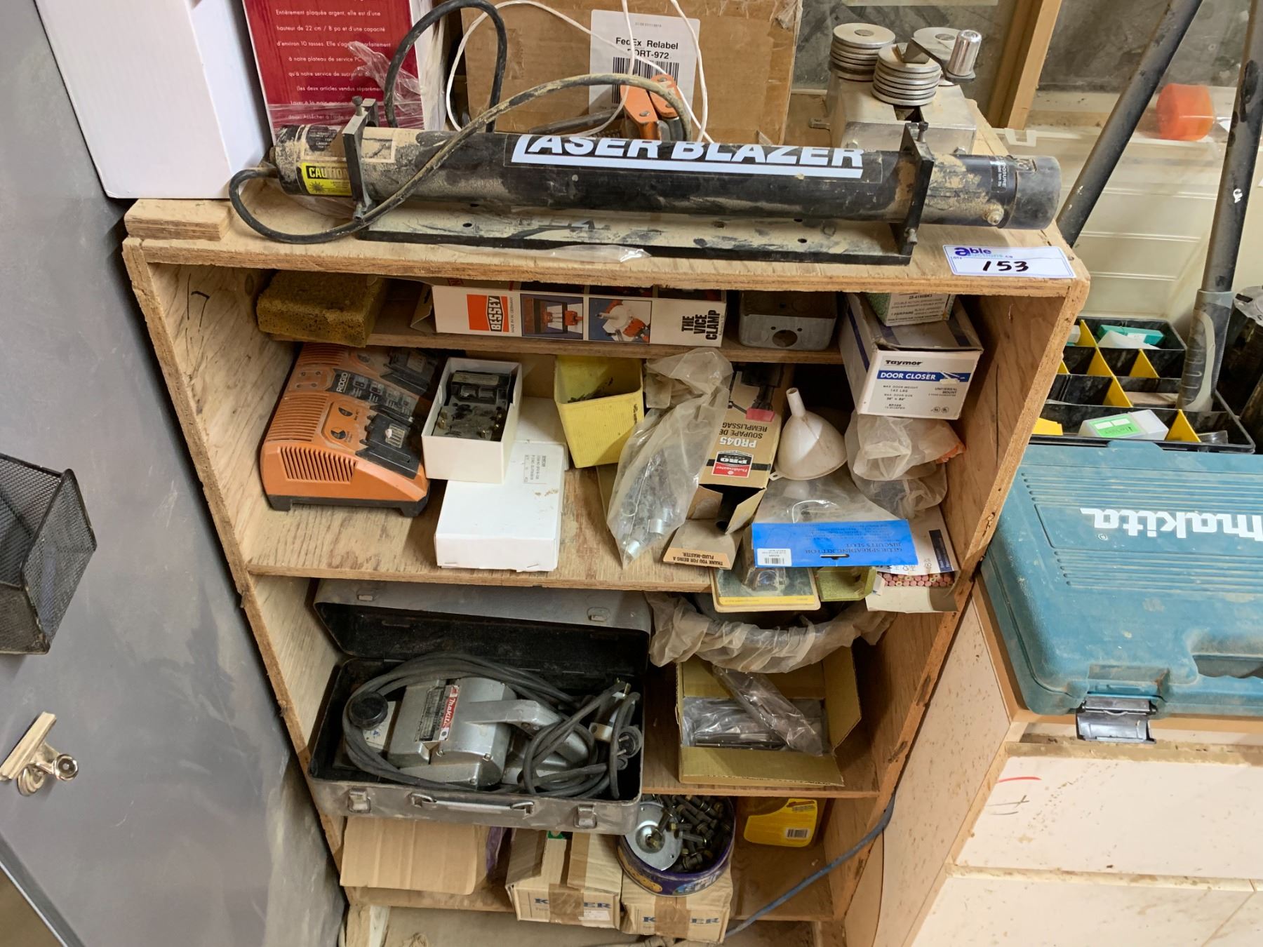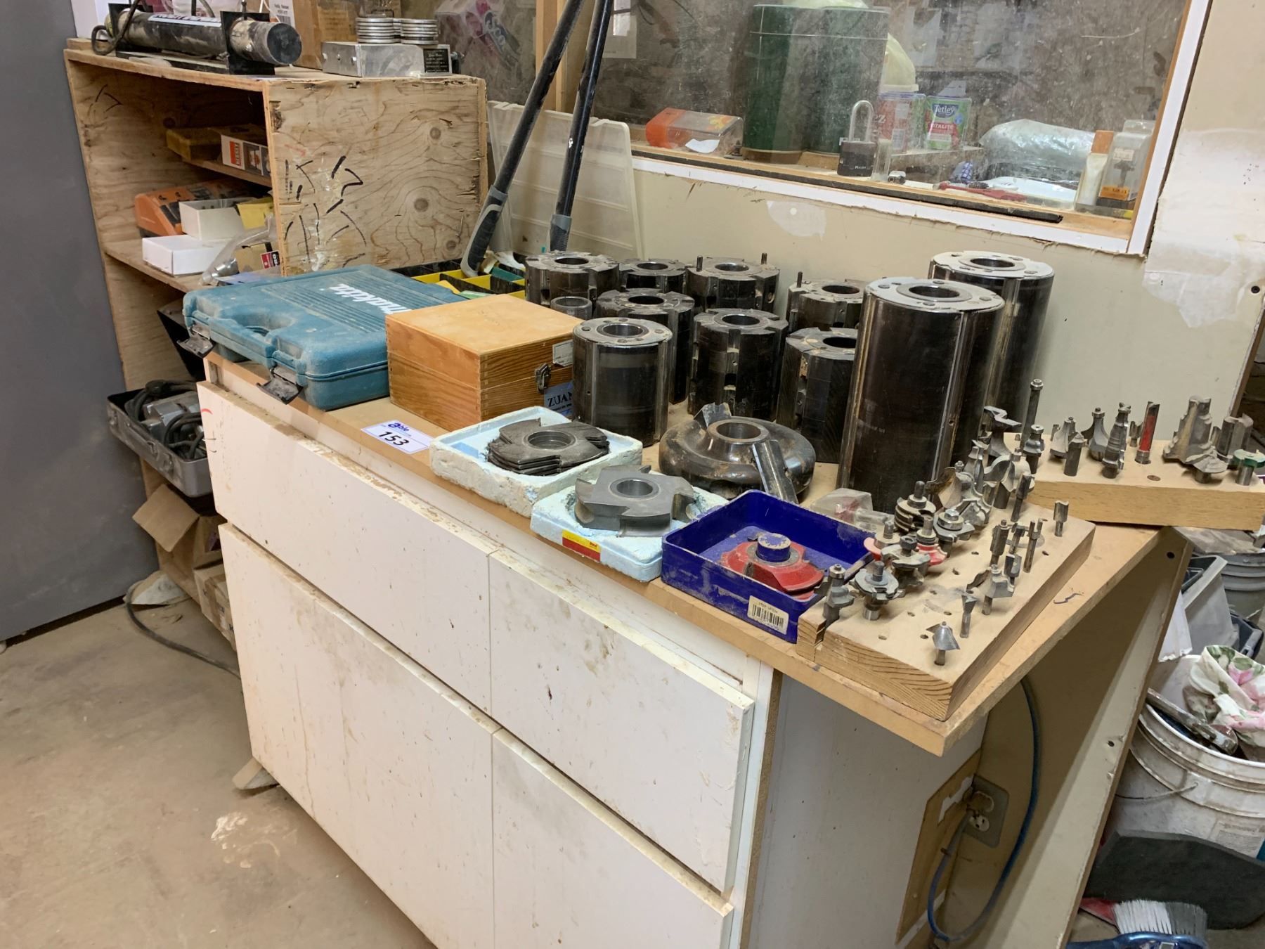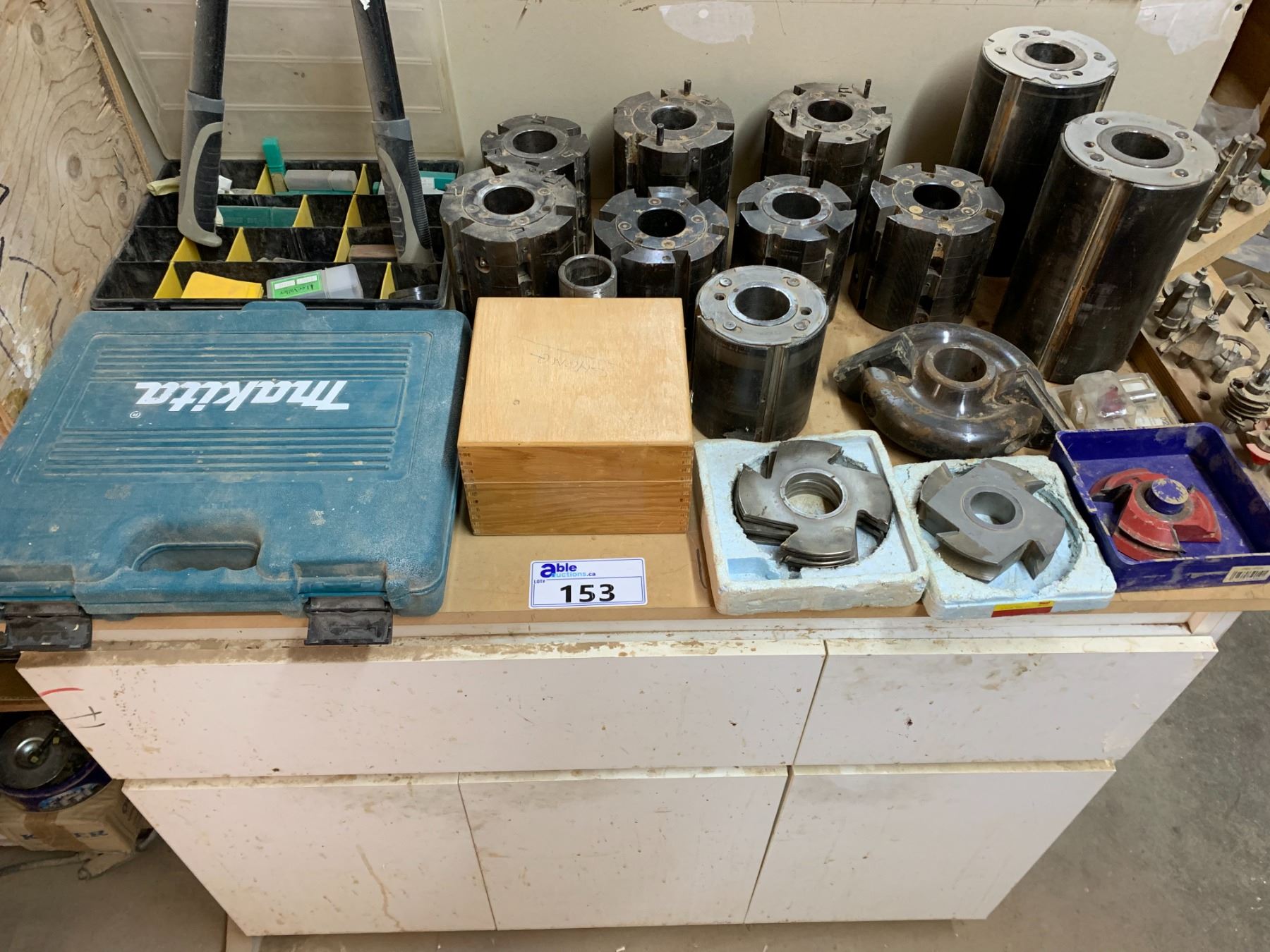 LARGE GROUP OF SHAPER/PLANER CUTTERS, DOOR ACCESSORIES, MAKITA PLANER, & 2 WOODEN STORAGE SHELVES