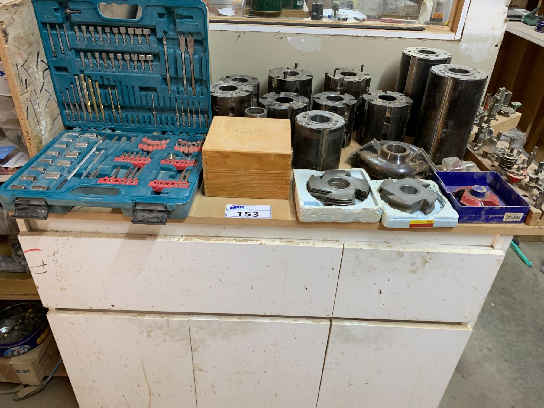 LARGE GROUP OF SHAPER/PLANER CUTTERS, DOOR ACCESSORIES, MAKITA PLANER, & 2 WOODEN STORAGE