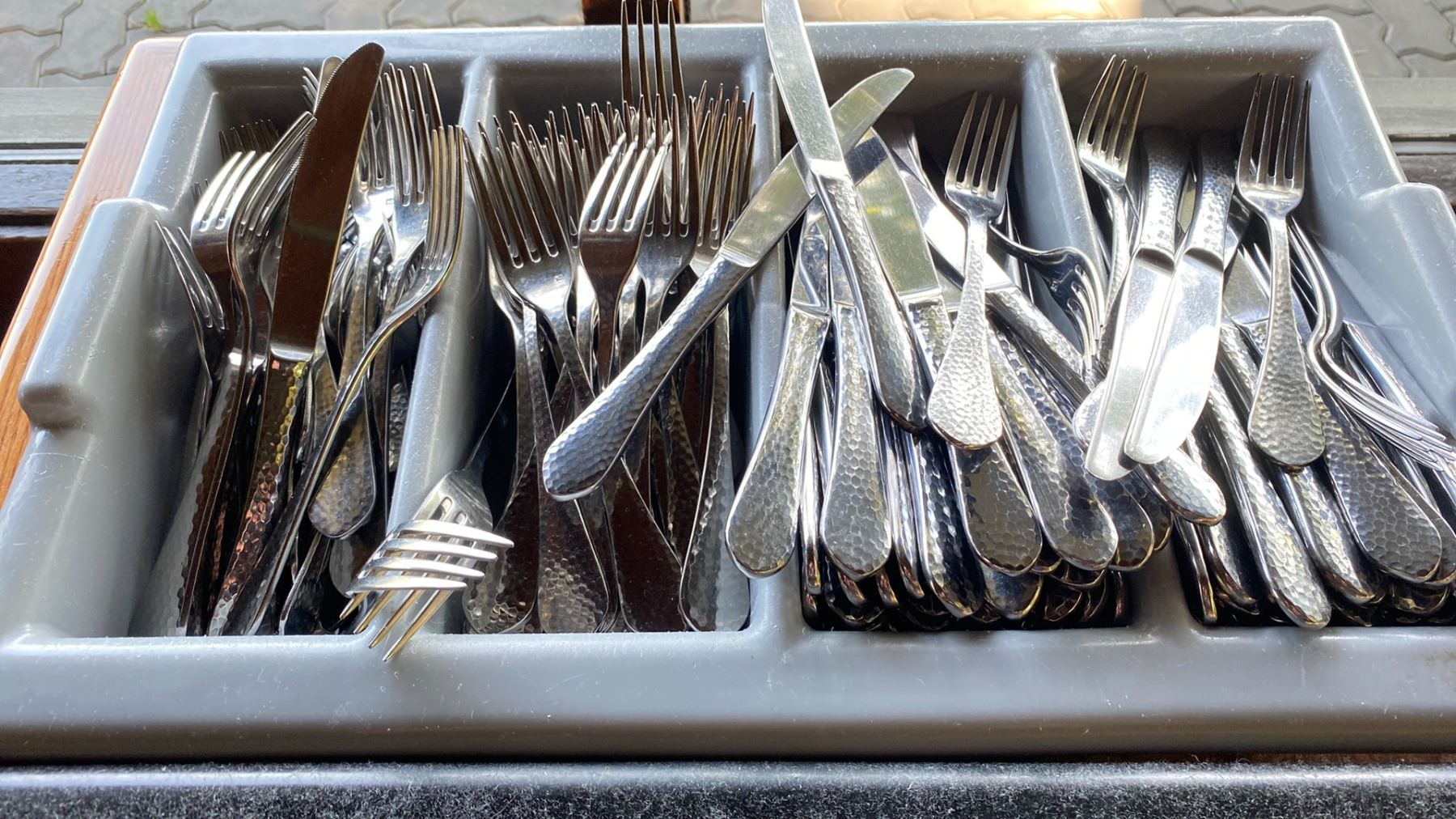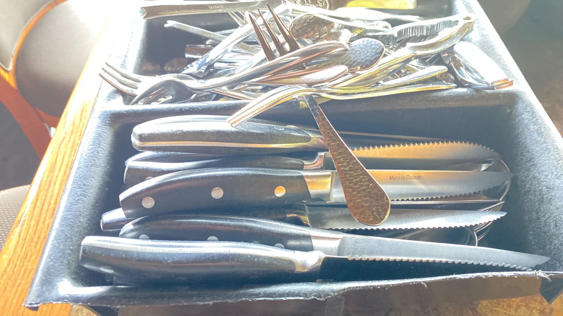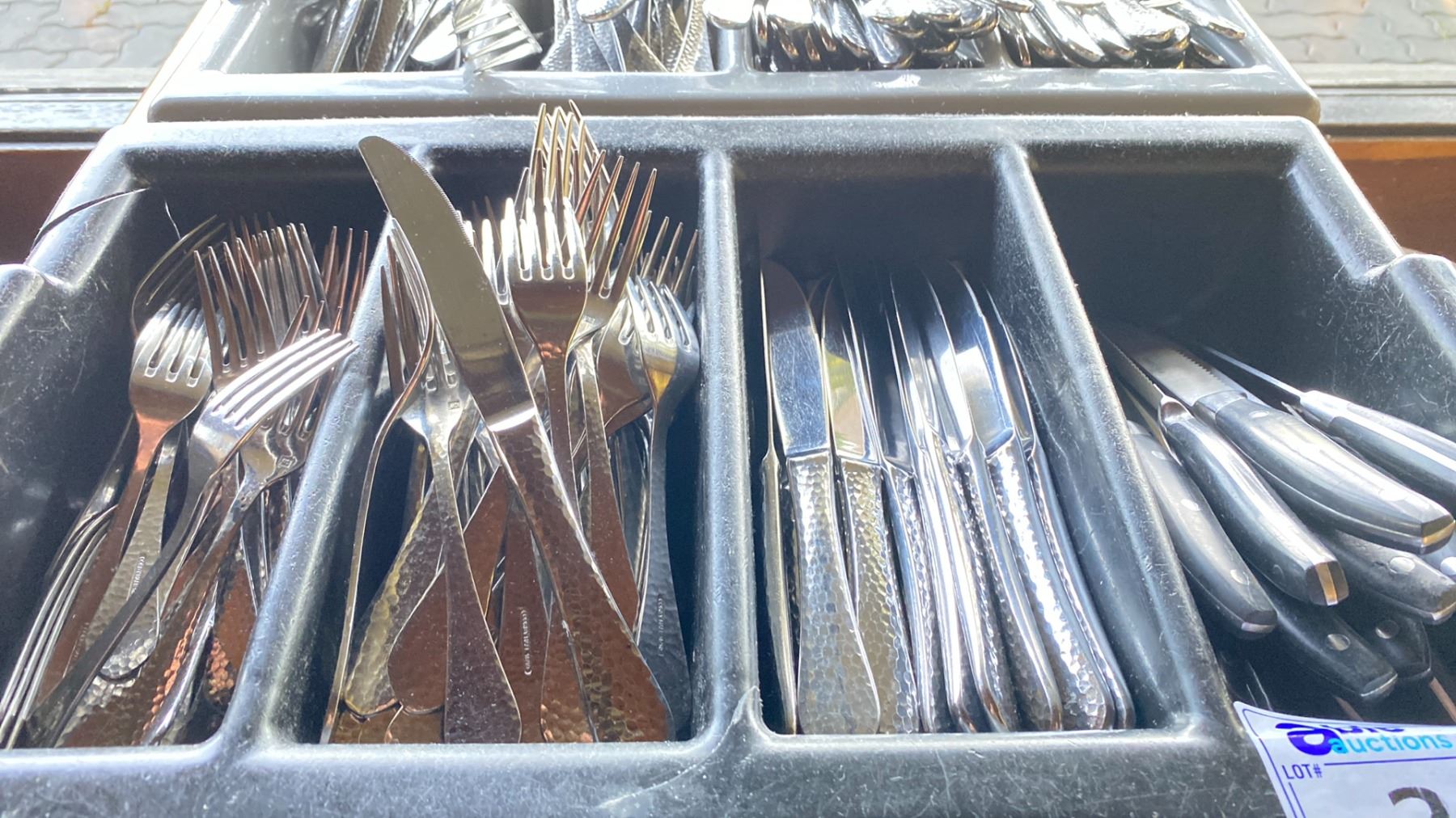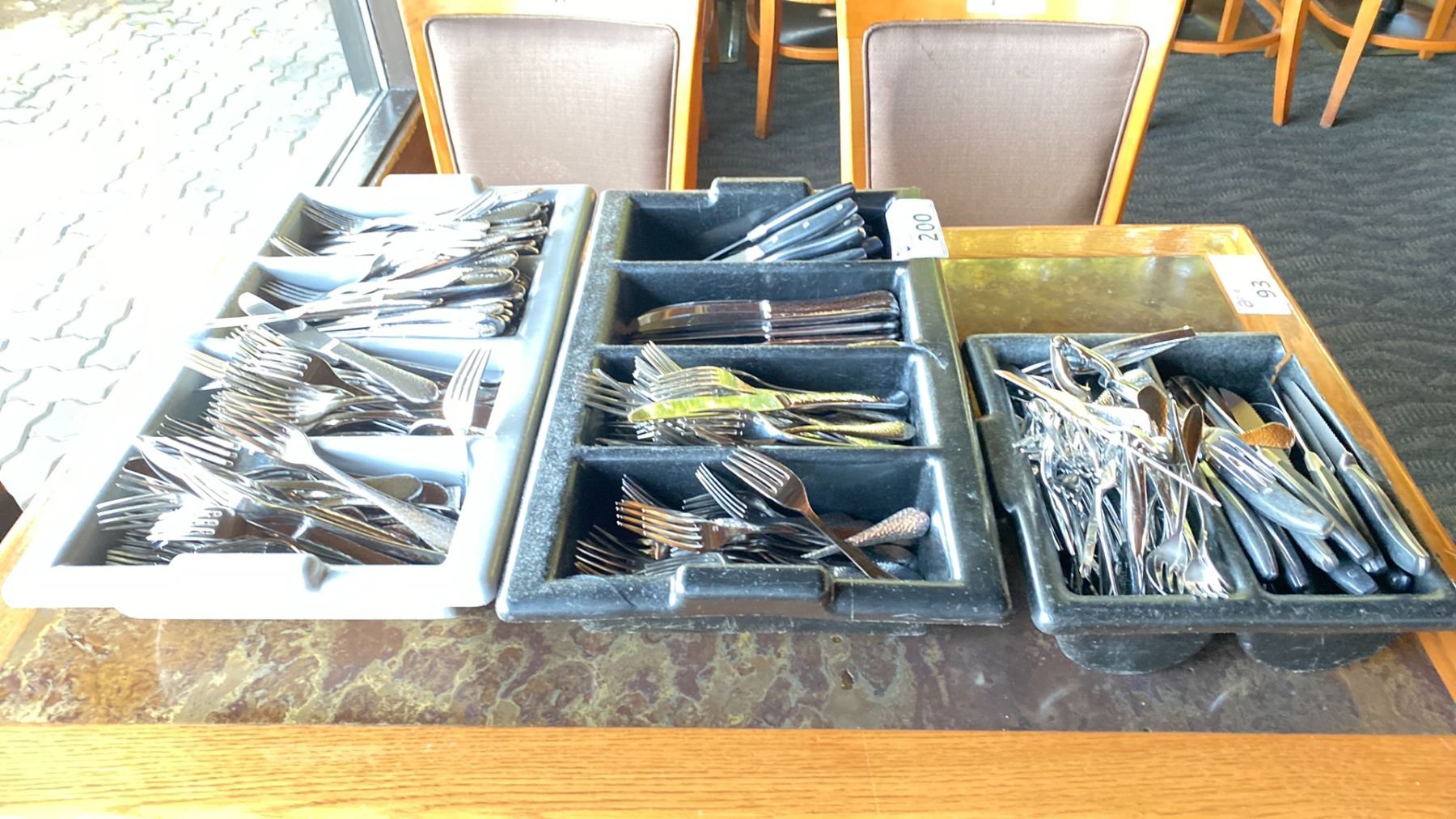 LARGE GROUP OF STAINLESS STEEL CUTLERY, KNIVES FORKS AND SPOONS ALL SIZES