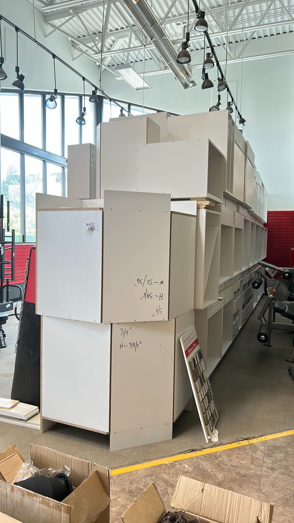 LARGE LOT KITCHEN CABINET BOXES. UPPERS AND BASES, WHITE MELAMINE CONSTRUCTION. OVER 140 PIECES. MUST TAKE ALL. THIS IS A LOT OF CABINETS-ALMOST A SEMI TRAILER LOAD