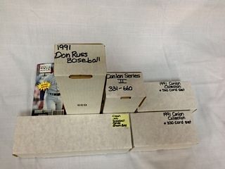 LARGE LOT OF 1991 COLLECTOR BASEBALL CARDS INC: DON RUSS SET, DON RUSS GREEN BOX SET, 2 CONLON SETS AND 1 CONLON SER. 2 SET. 1 POCKET PAGES CARD SHOW DIGEST MAG. WITH CARDS.  EVERYTHING IN EXCELLENT CONDITION.