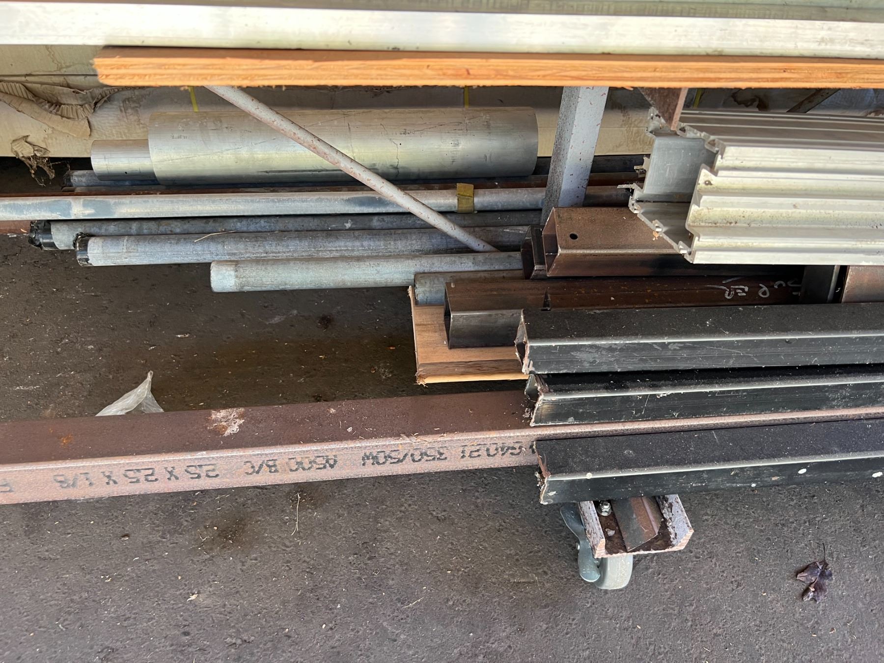 LARGE LOT OF ALUMINUM OFF CUTS - SOME STEEL TUBING - INCLUDES ROLLING RACK