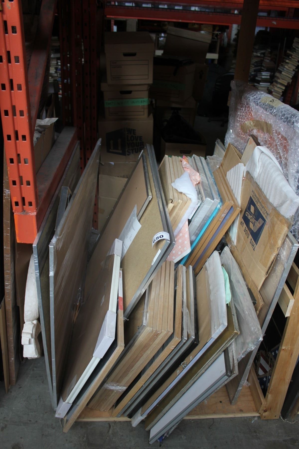 LARGE LOT OF ARTWORK UNDERNEATH PALLET RACKING