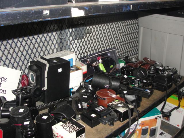 LARGE LOT OF ASSORTED CAMERAS, CAMERA LENSES, CASES, ACCESSORIES, ETC
