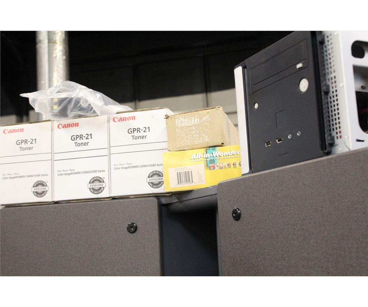 LARGE LOT OF ASSORTED ELECTRONIC, INCLUDES BINDING SYSTEM, SMALL AUDIO MIXER, AND ASSORTED COMPUTER ITEMS