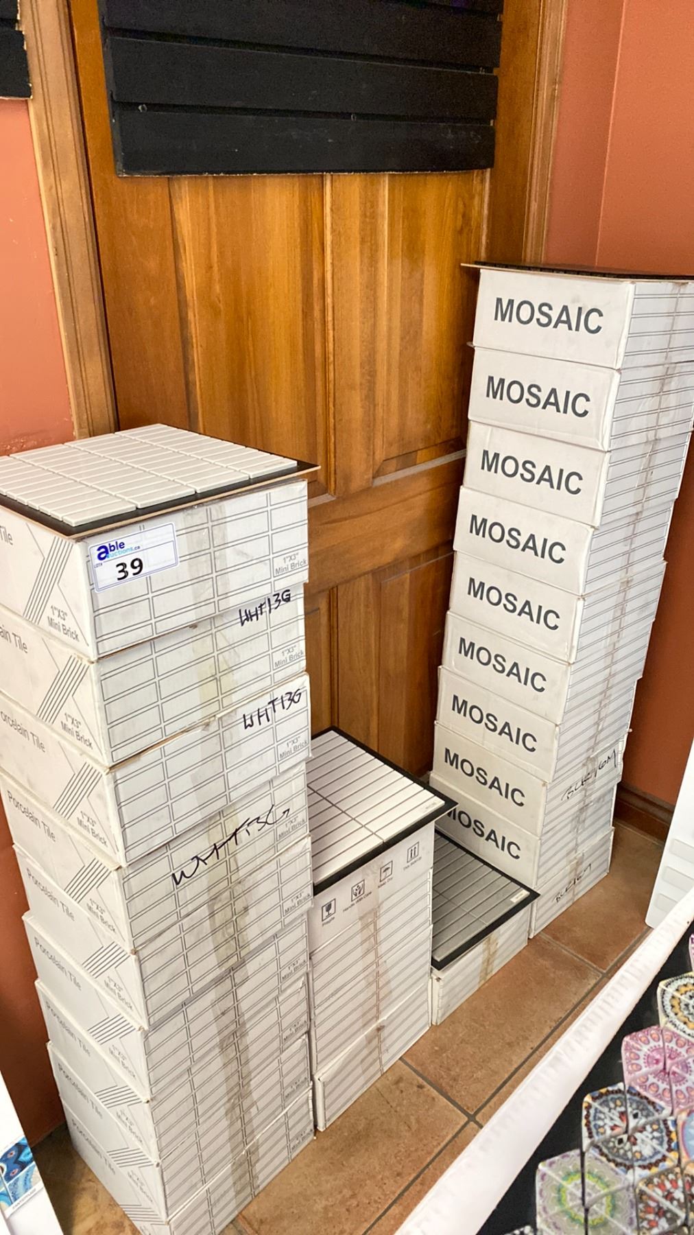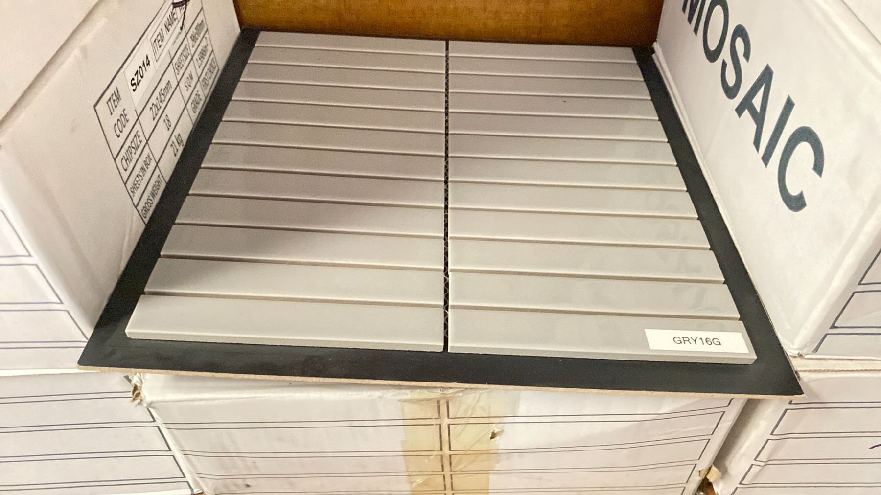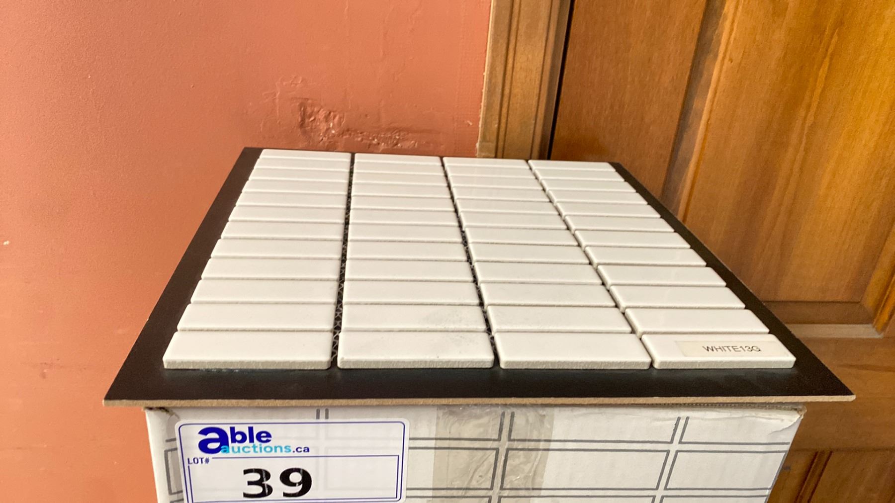 LARGE LOT OF ASSORTED MOSAIC TILE; 9 BOXES (APPROX 180SQ.FT. TOTAL) OF PORCELAIN IN WHITE13G, 4 BOXES (APPROX 80SQ.FT. TOTAL) OF PORCELAIN IN WHITE 16G, 1 BOX (APPROX 20SQ.FT. TOTAL) OF PORCELAIN IN GRY16G & 10 BOXES (APPROX 200SQ.FT. TOTAL) OF PORCELAIN IN BLK16M