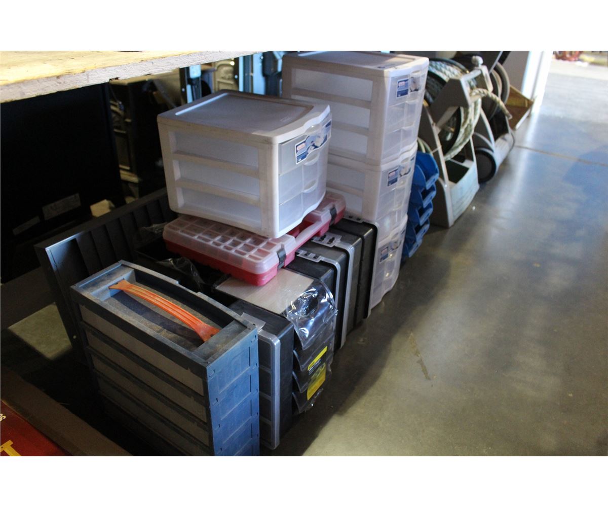 LARGE LOT OF ASSORTED PARTS STORAGE COMPARTMENTS, CASES, ETC