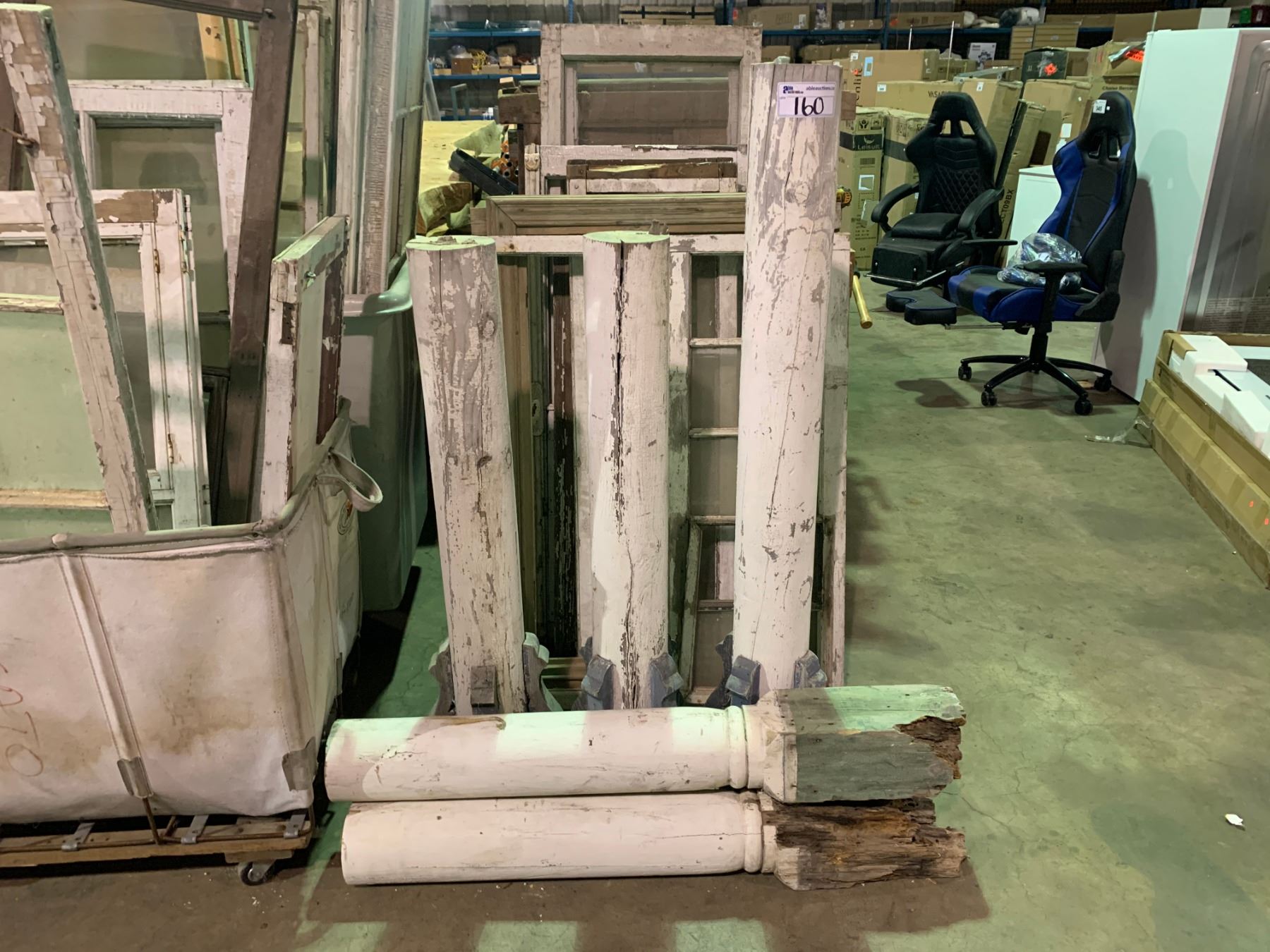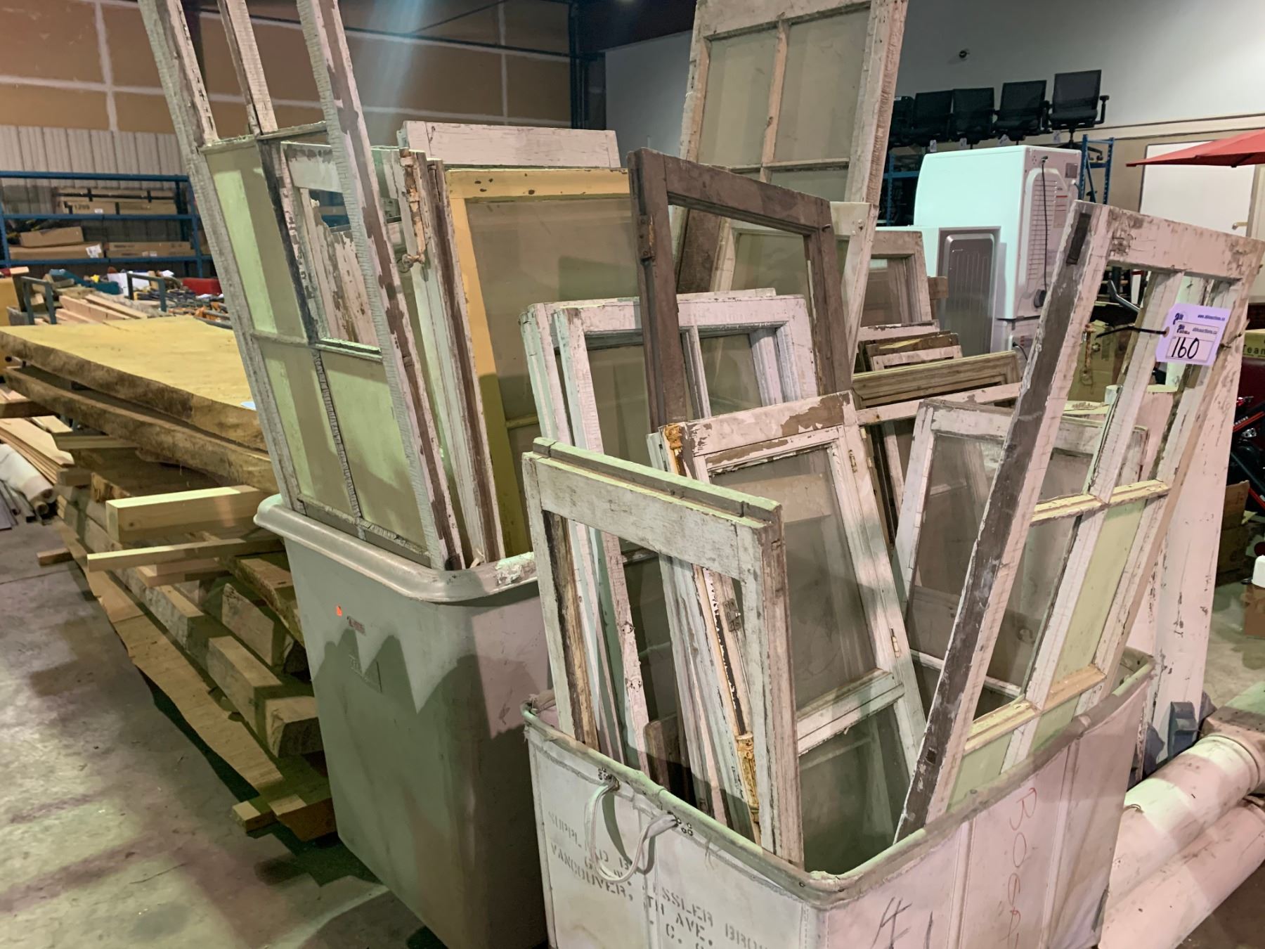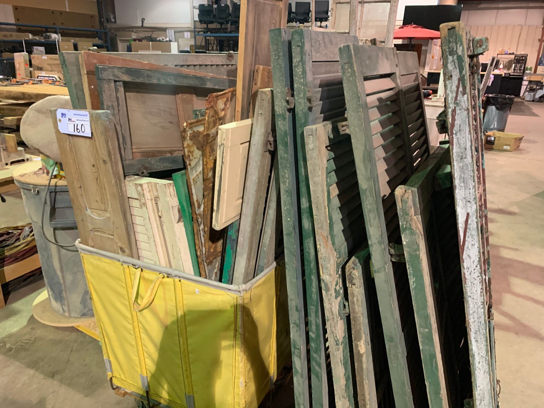LARGE LOT OF ASSORTED SIZED SHUTTERS, VINTAGE GLASS WINDOW FRAMES & SOLID WOOD POSTS (BINS NOT INCLUDED)