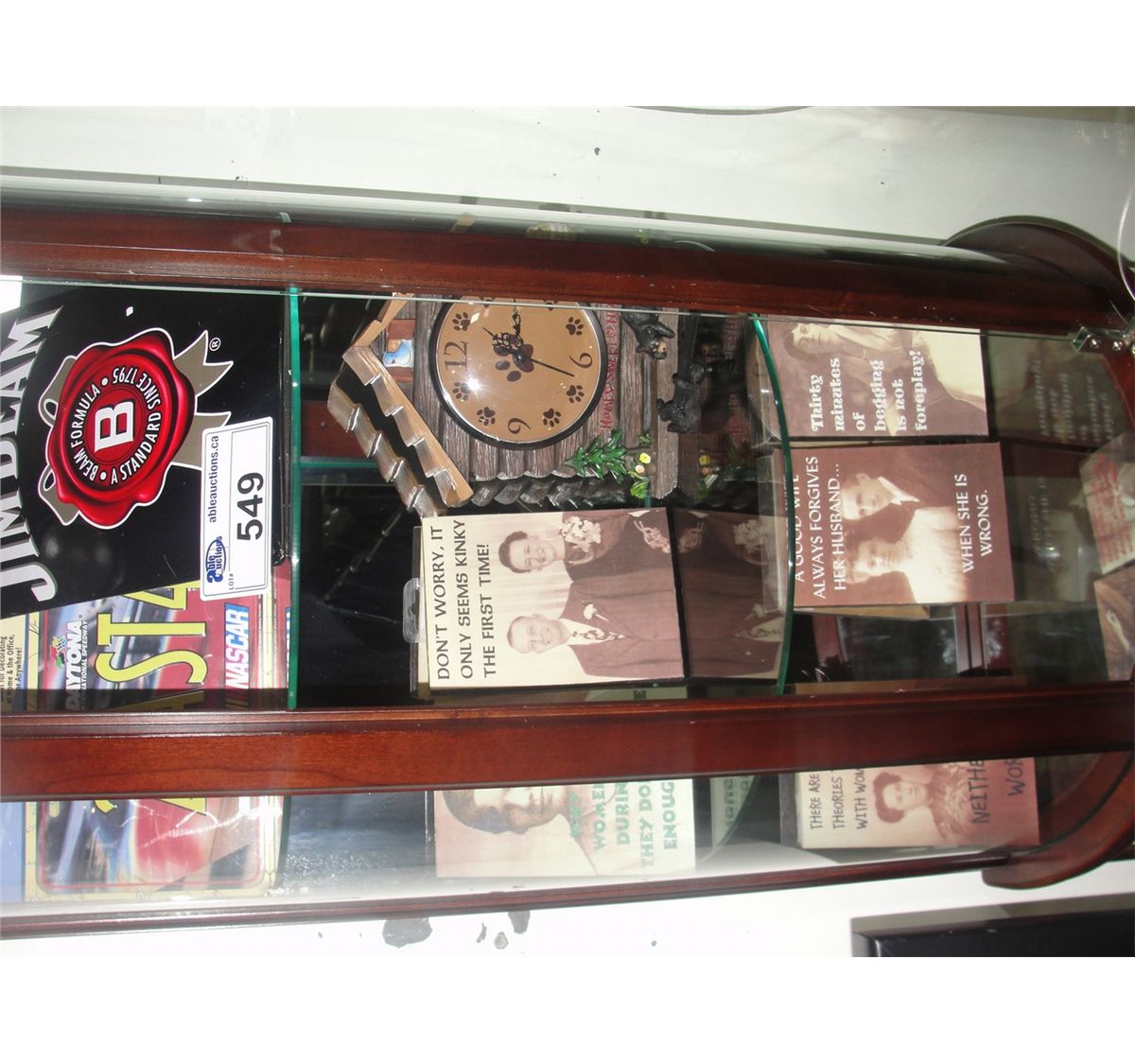 LARGE LOT OF ASSORTED WHYMISCAL PLAQUES, CLOCK, TIN SIGNS, LICENSE PLATE ETC