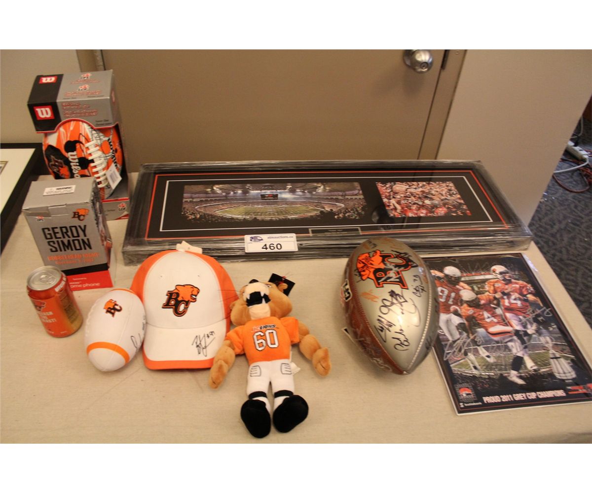 LARGE LOT OF BC LIONS MEMORABILIA INCL. TEAM SIGNED BALL, GEROY SIMON BOBBLE HEAD, FRAMED PHOTO, STUFFED ANIMAL, HAT AND MORE!