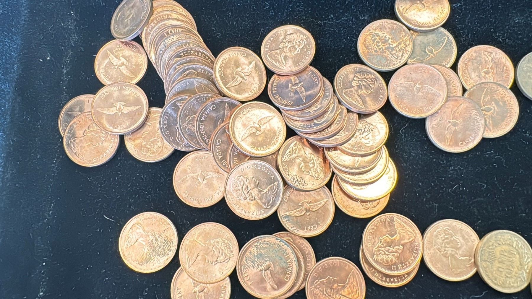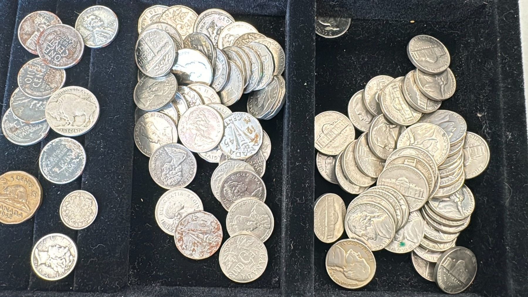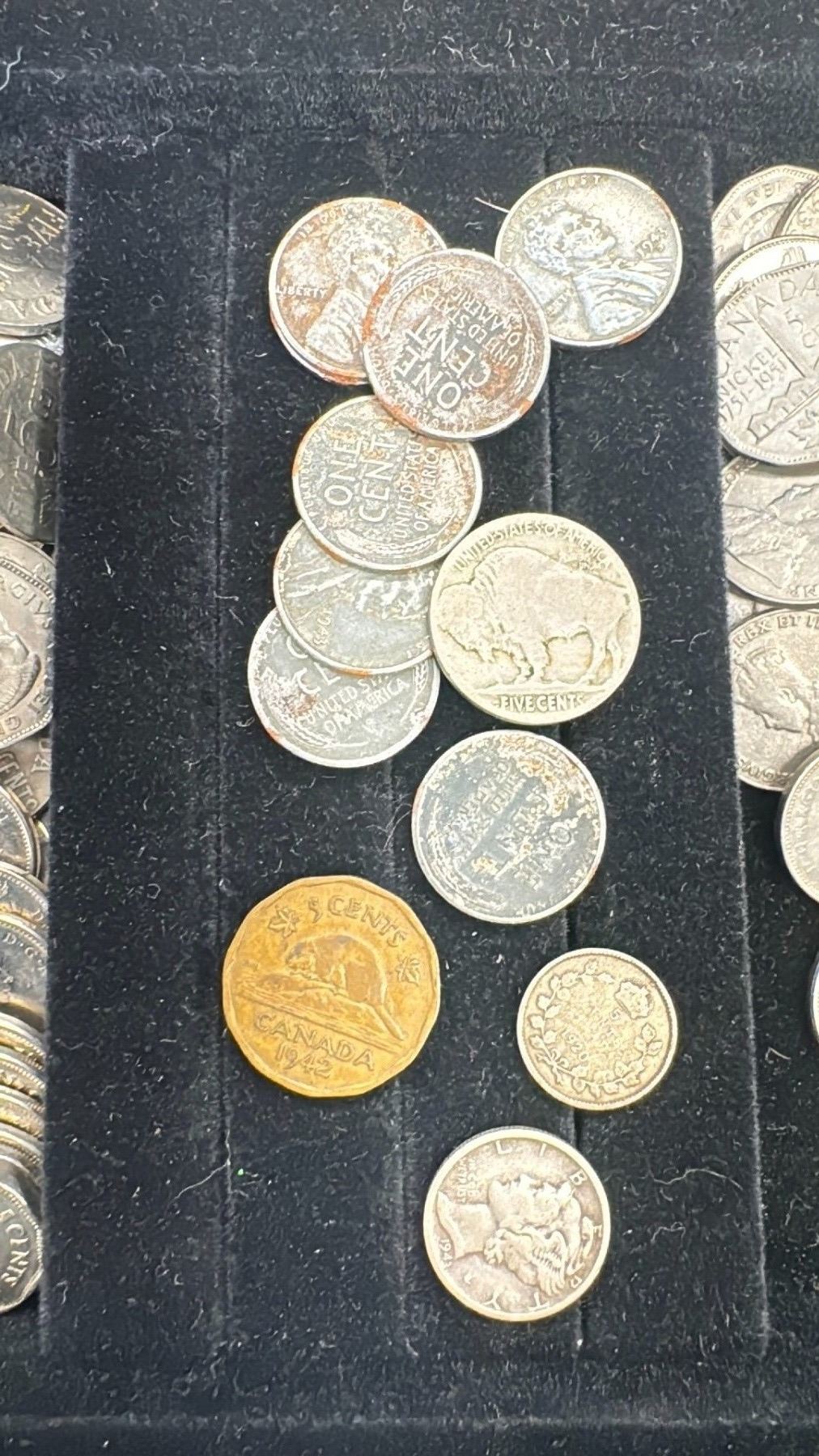 LARGE LOT OF CANADIAN CURRENCY INCLUDING SOME AMERICAN STEEL PENNIES , BUFFALO NICKEL & A 1942 TOMBAC NICKEL
