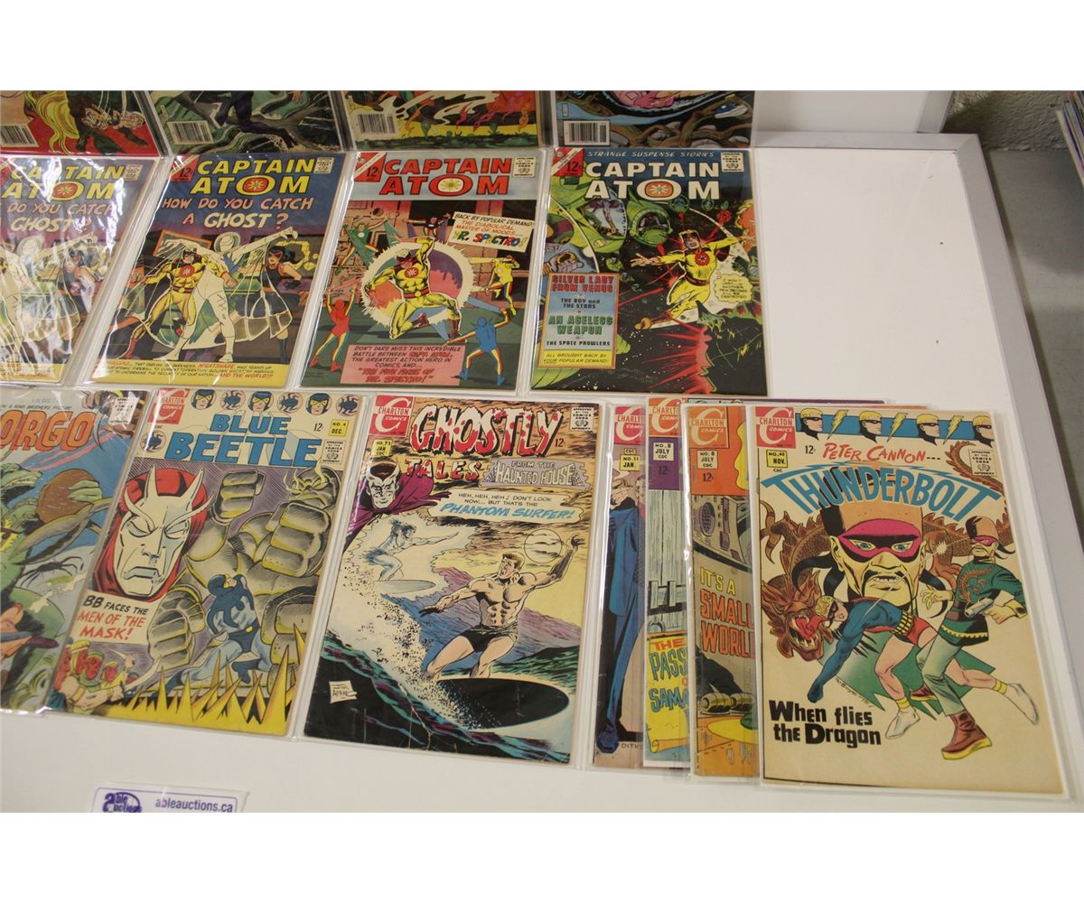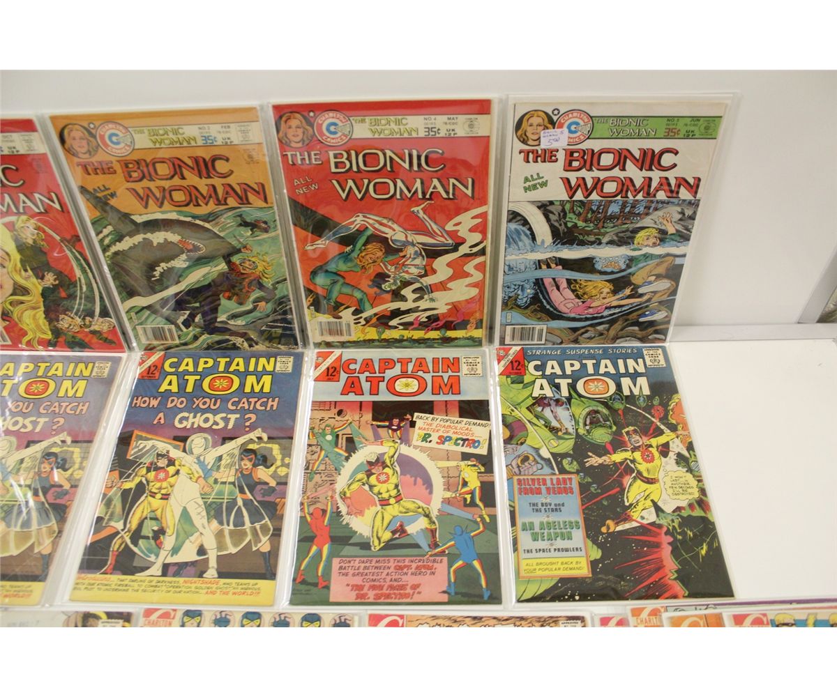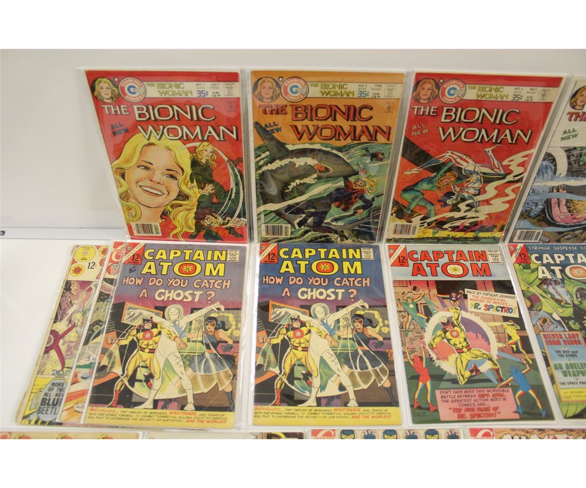 LARGE LOT OF CHARELTON 12 & 15 CENT COMICS INCLUDES CAPTAIN ATOM, STRANGE SUSPENSE, GHOSTS OF DOCTOR GRAVES AND MORE. ALSO THE BIONIC WOMEN #1-2 #4-5 MID GRADE AVERAGE. 32 BOOKS TOTAL