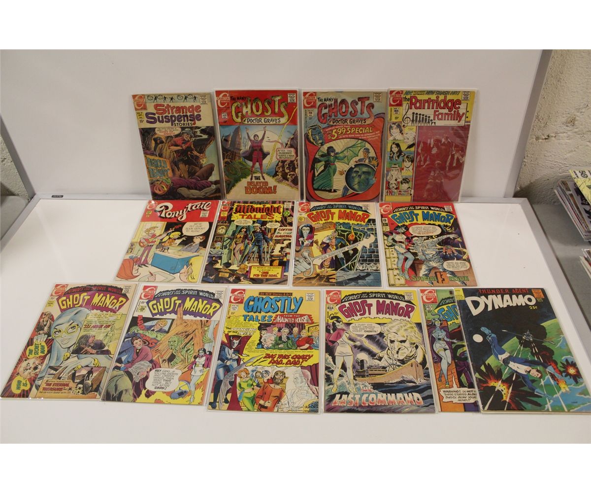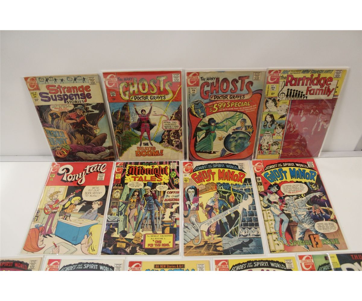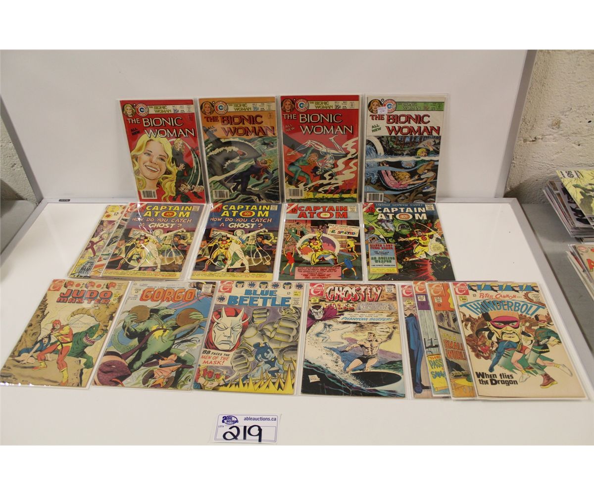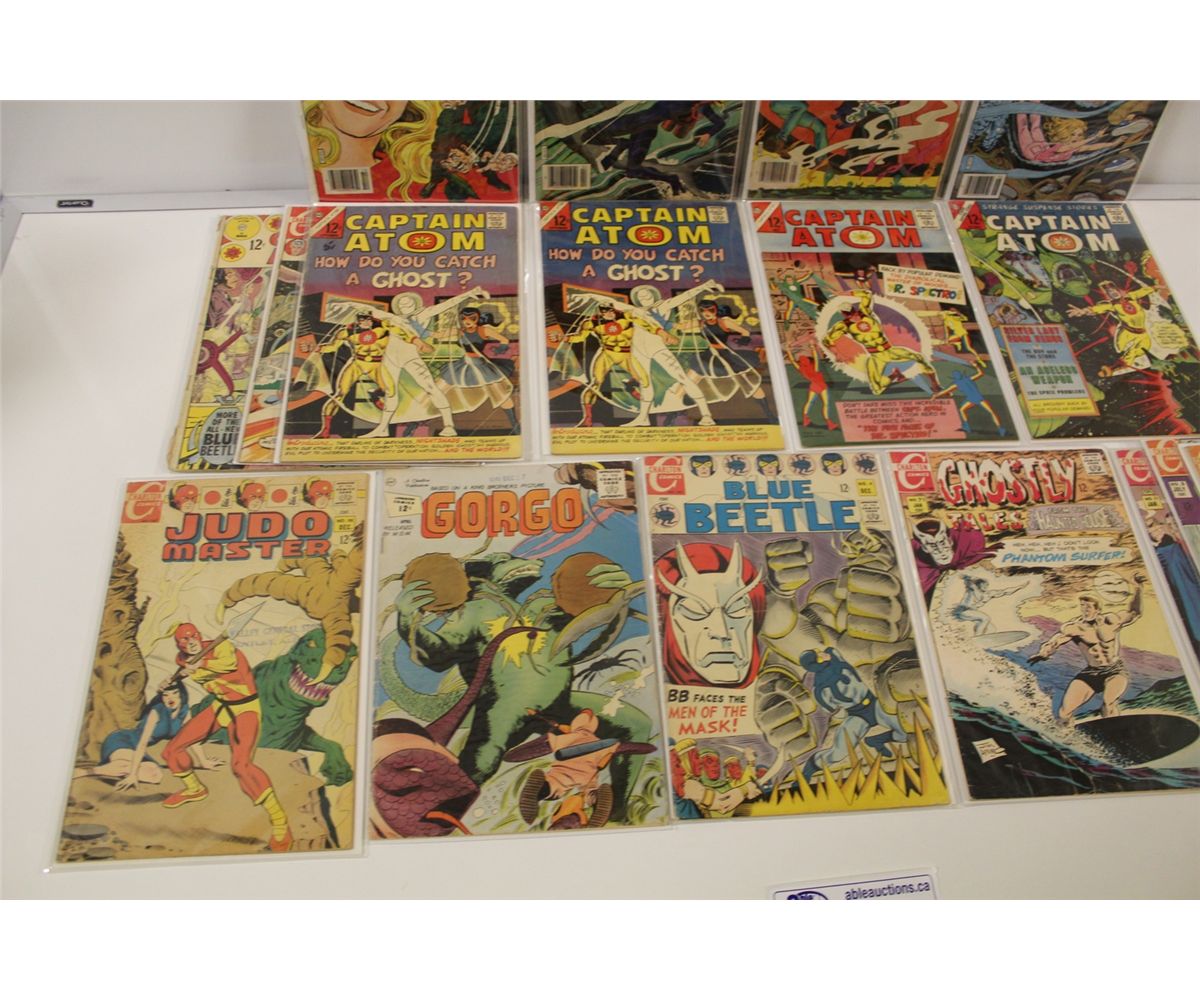 LARGE LOT OF CHARELTON 12 & 15 CENT COMICS INCLUDES CAPTAIN ATOM, STRANGE SUSPENSE, GHOSTS OF DOCTOR GRAVES AND MORE. ALSO THE BIONIC WOMEN #1-2 #4-5 MID GRADE AVERAGE. 32 BOOKS TOTAL