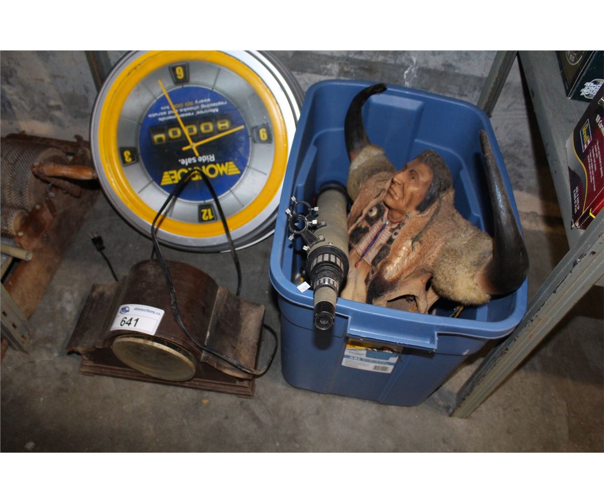 LARGE LOT OF COLLECTABLE ITEMS; NEON CLOCK, MANTEL CLOCK, WOOL ROLLER, ETC