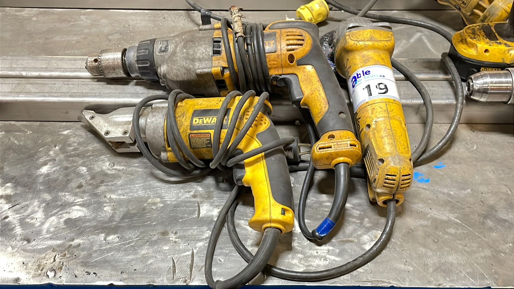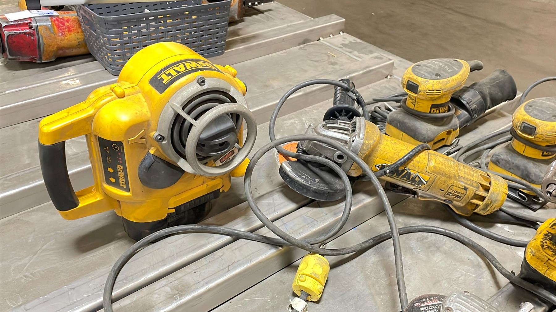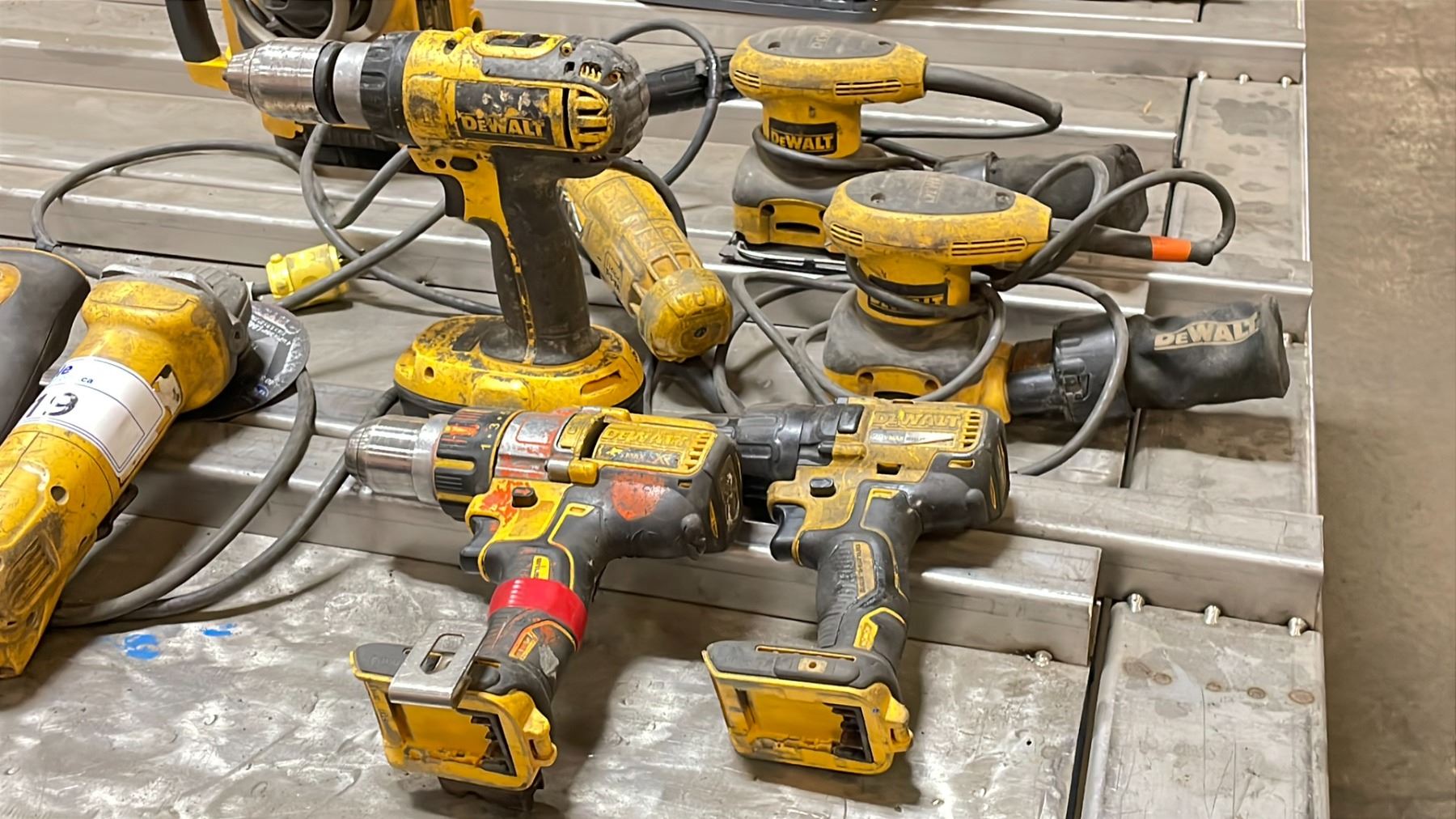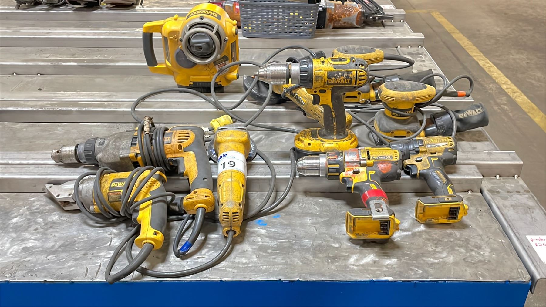 LARGE LOT OF DEWALT TOOLS; GRINDER, DRILLS BOTH CORDED AND BATTERY, AND ROTARY LASER