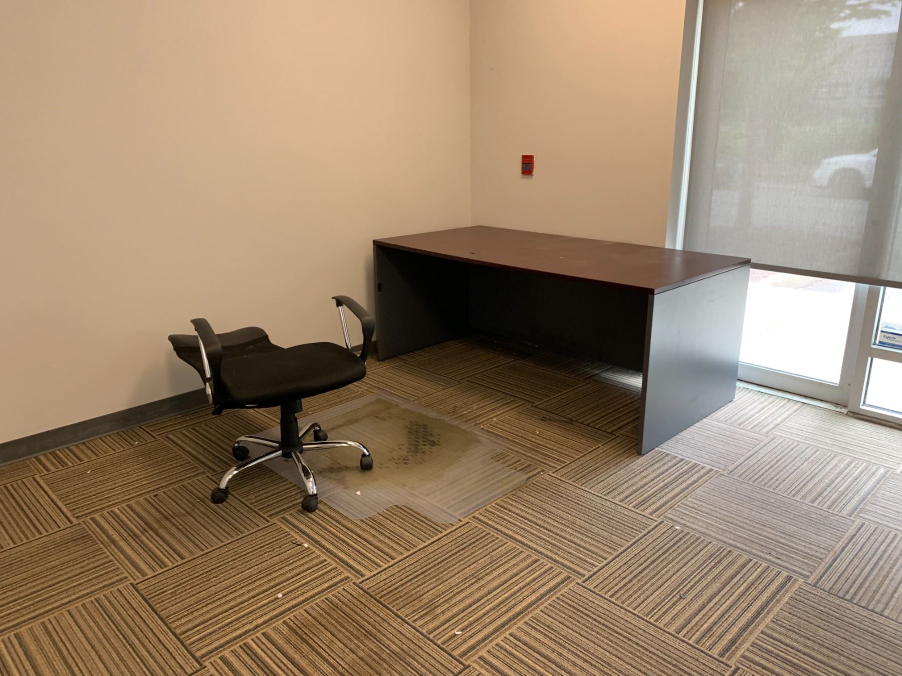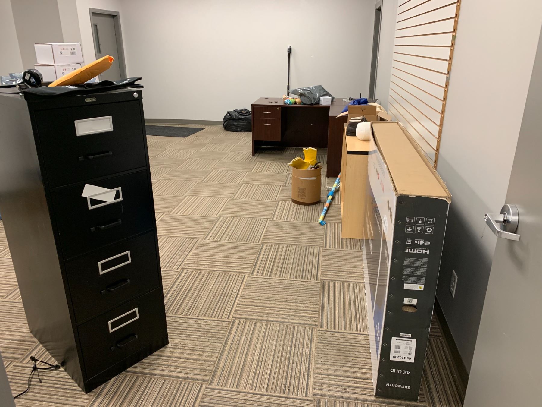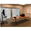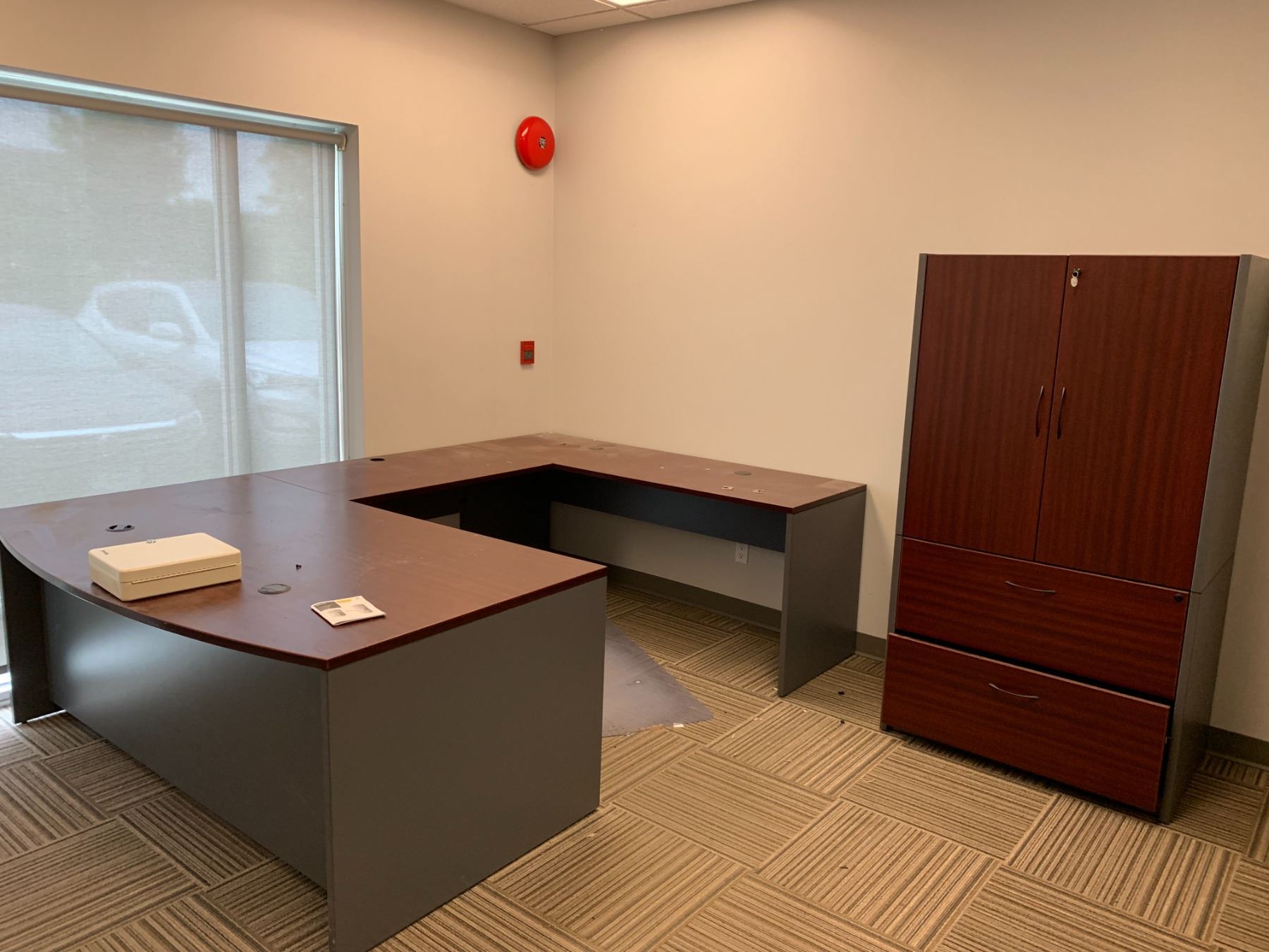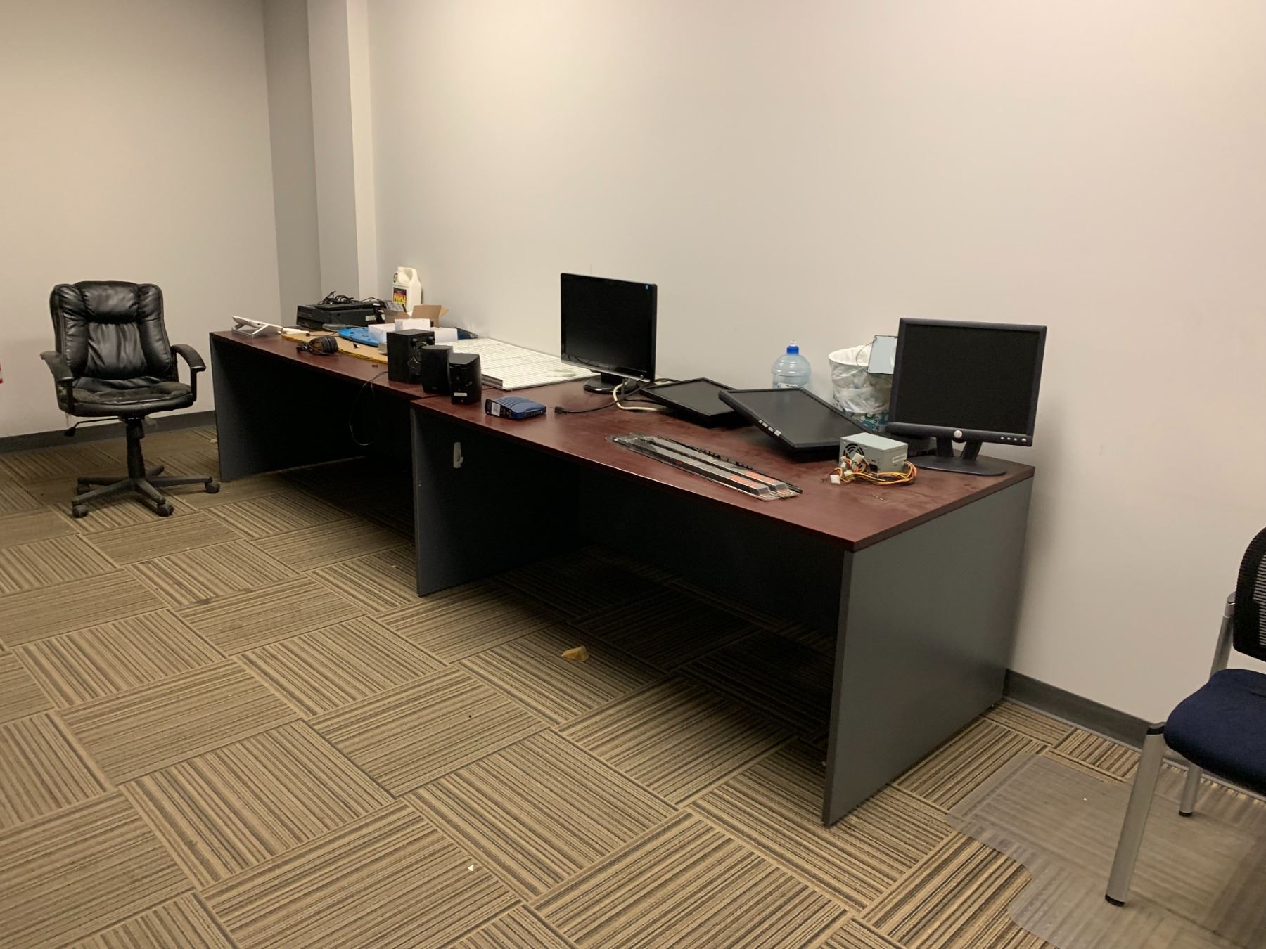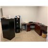 LARGE LOT OF FRONT OFFICE INCLUDING 8 ASSORTED DESKS, 5 ASSORTED MOBILE/STATIONARY OFFICE CHAIRS, 3 ASSORTED FILING CABINETS, 1 STORAGE CABINET, MICROWAVE, COFFEE MAKERS, KETTLES, BOARDROOM TABLE AND CONFERENCE TELEVISION *MUST TAKE ALL* *MUST HAVE PROPER EQUIPMENT AND PERSONNEL FOR REMOVAL*