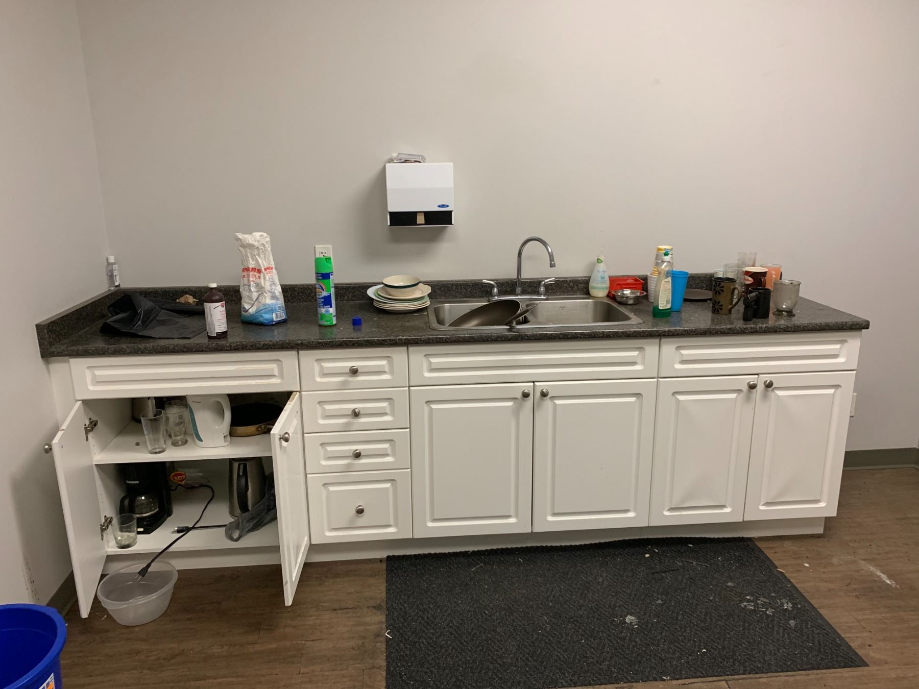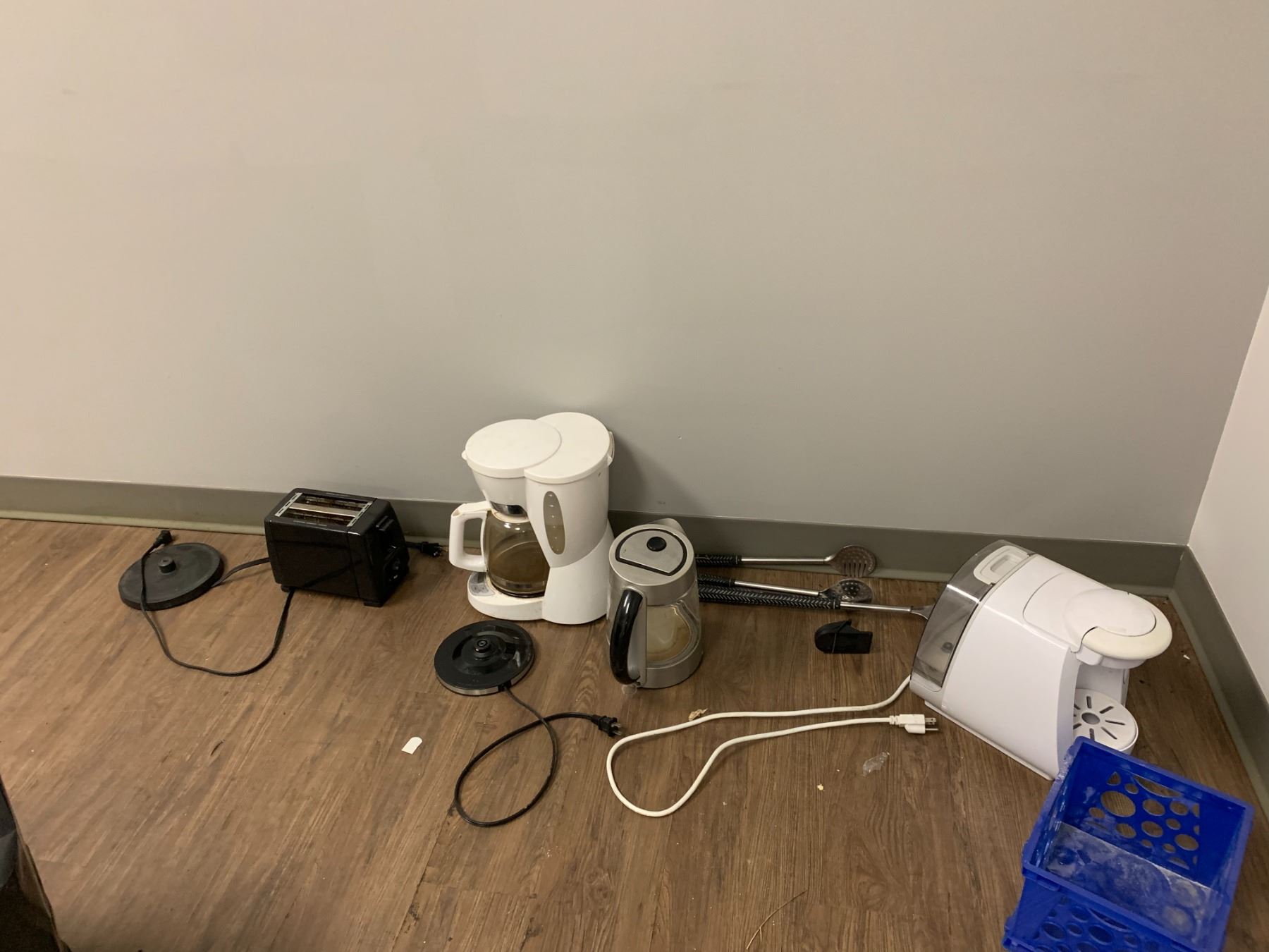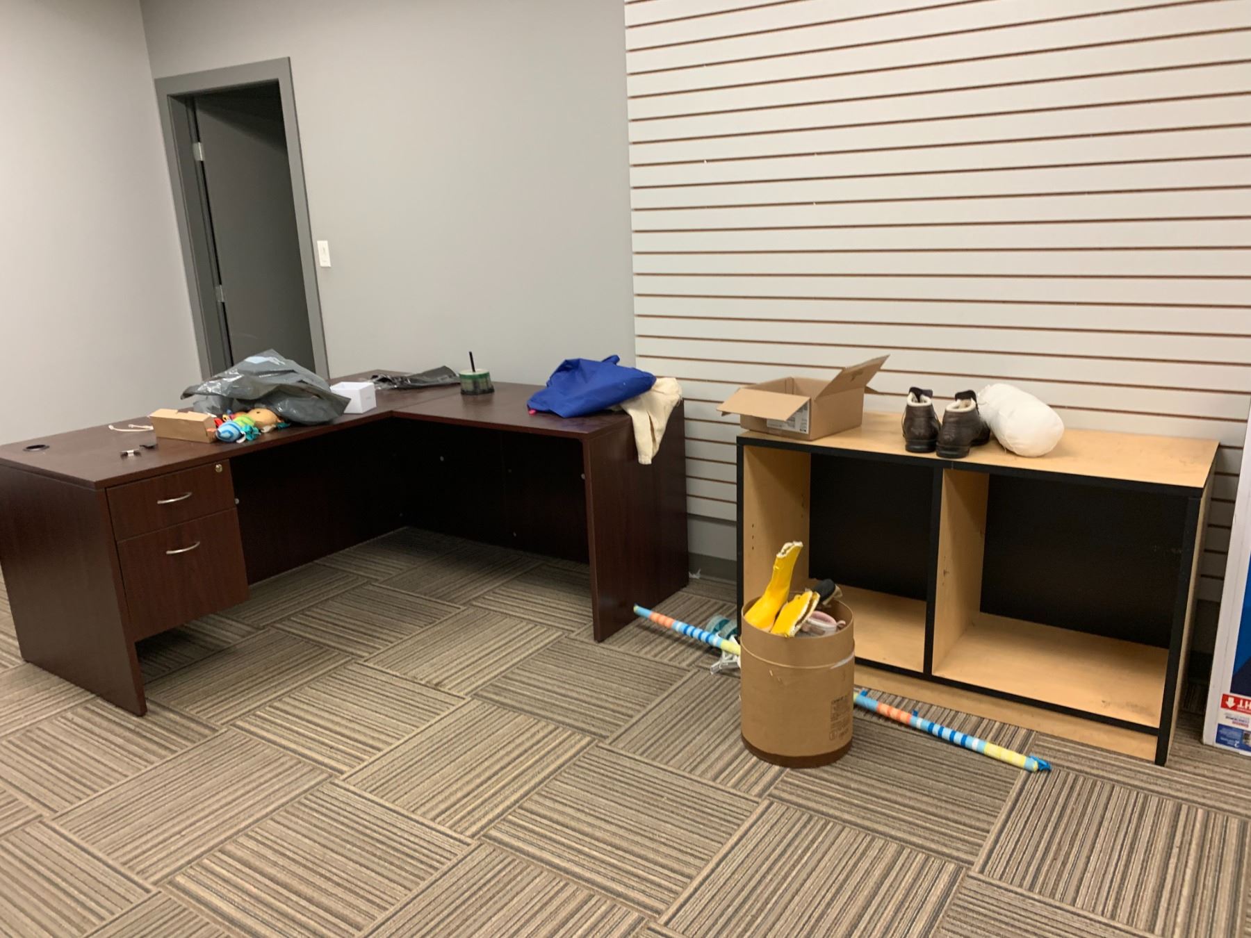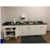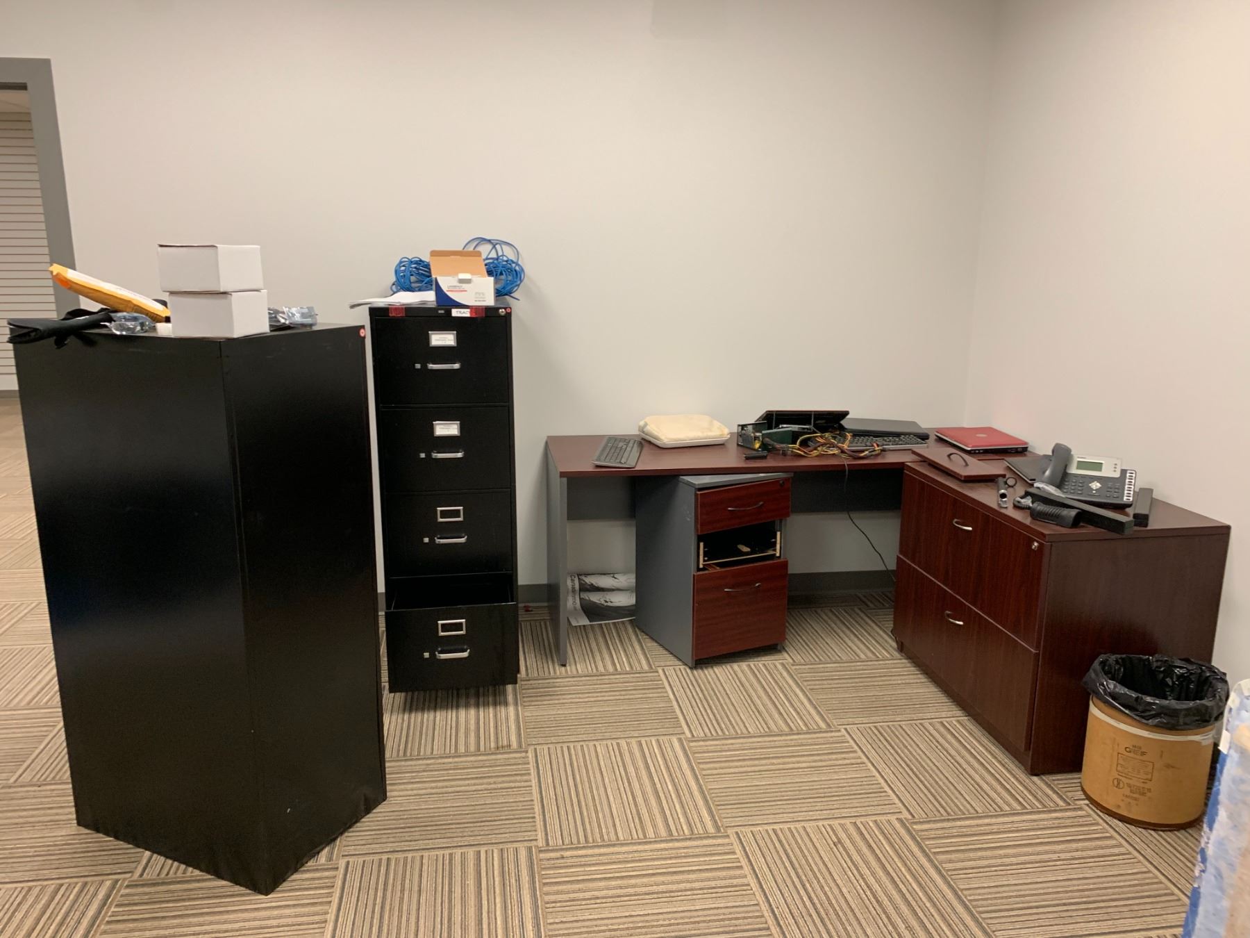 LARGE LOT OF FRONT OFFICE INCLUDING 8 ASSORTED DESKS, 5 ASSORTED MOBILE/STATIONARY OFFICE CHAIRS, 3 ASSORTED FILING CABINETS, 1 STORAGE CABINET, MICROWAVE, COFFEE MAKERS, KETTLES, BOARDROOM TABLE AND CONFERENCE TELEVISION *MUST TAKE ALL* *MUST HAVE PROPER EQUIPMENT AND PERSONNEL FOR REMOVAL*